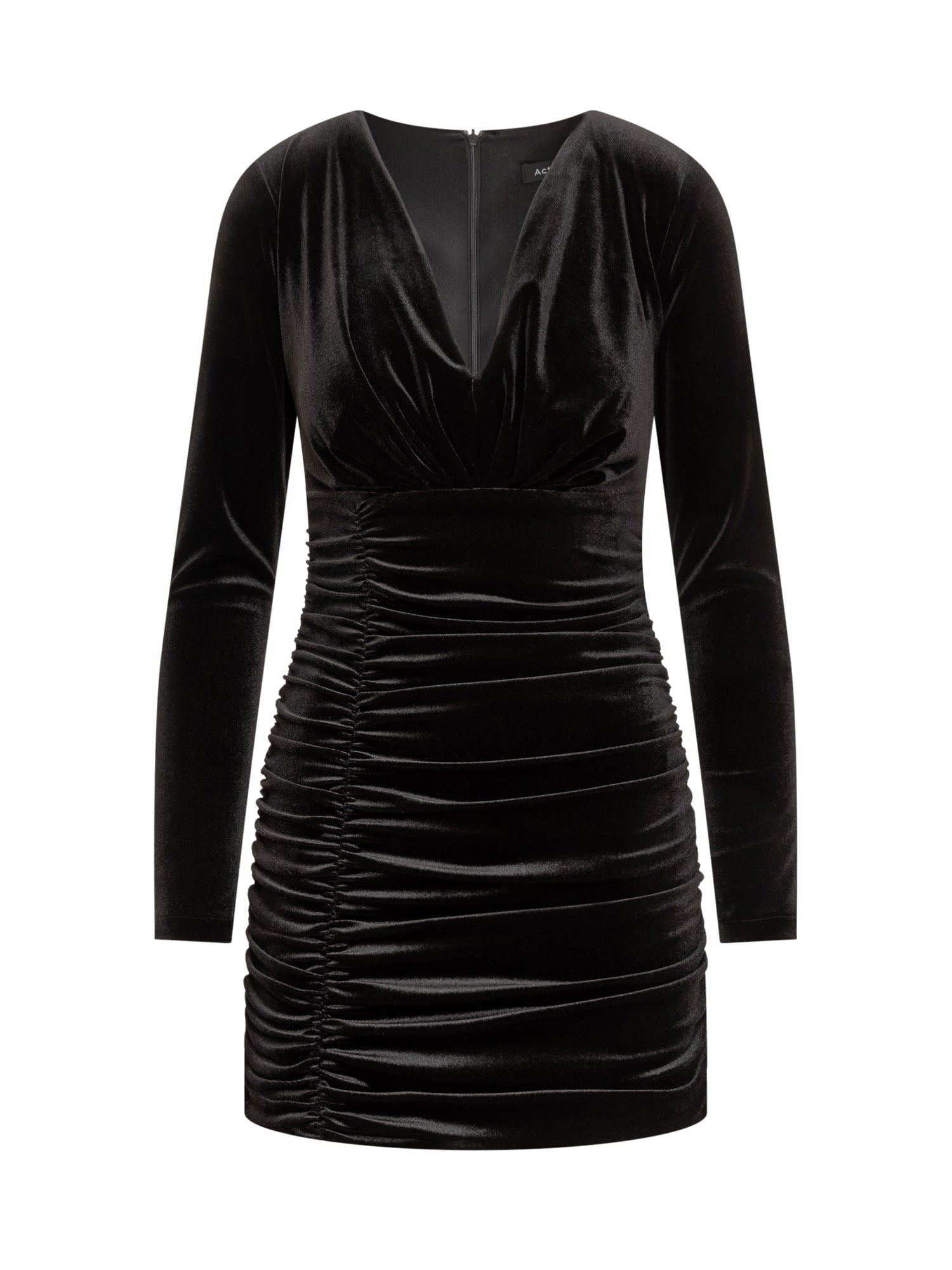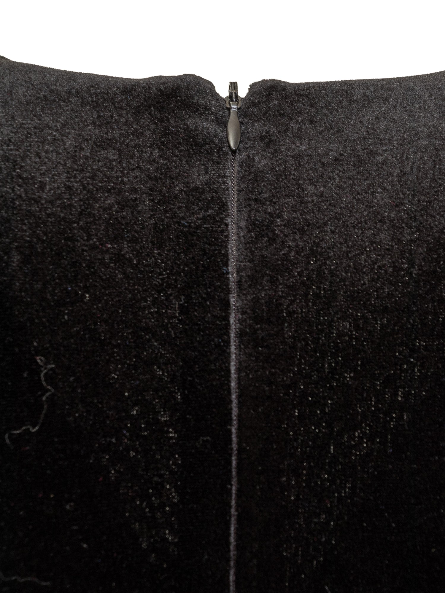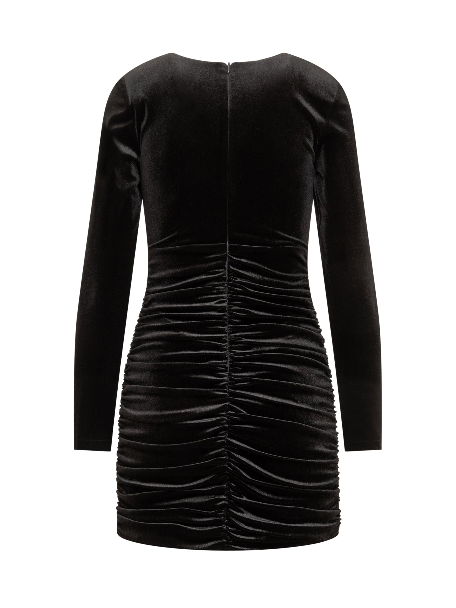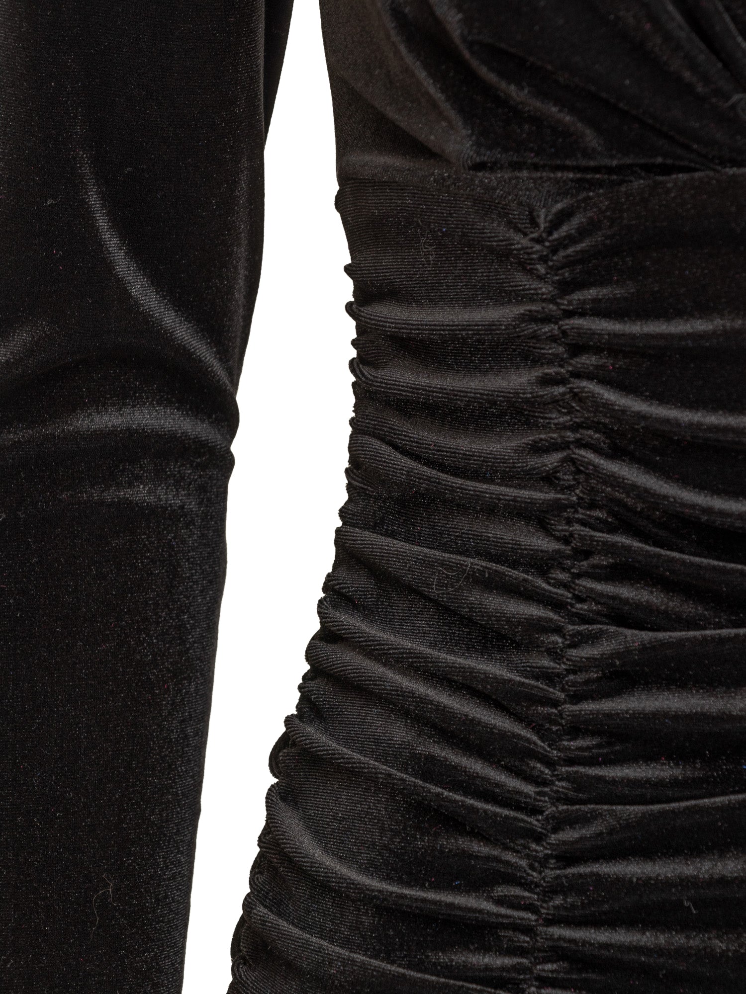 Long-sleeved midi dress. V-neckline. Back zipper closure. Curlicues at front. Velvet effect.