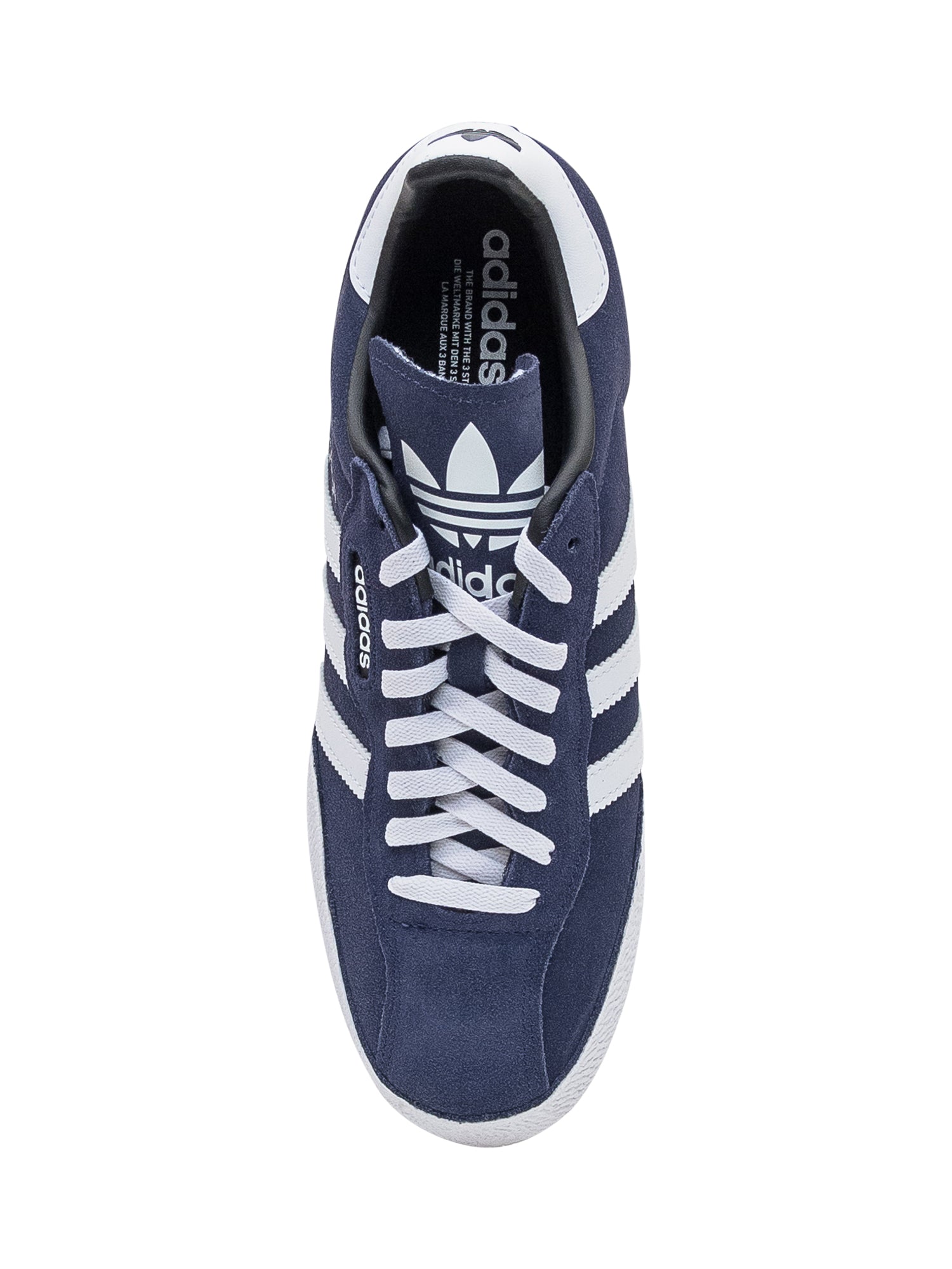 Iconic Adidas Samba sneakers in blue leather with white details and rubber sole.