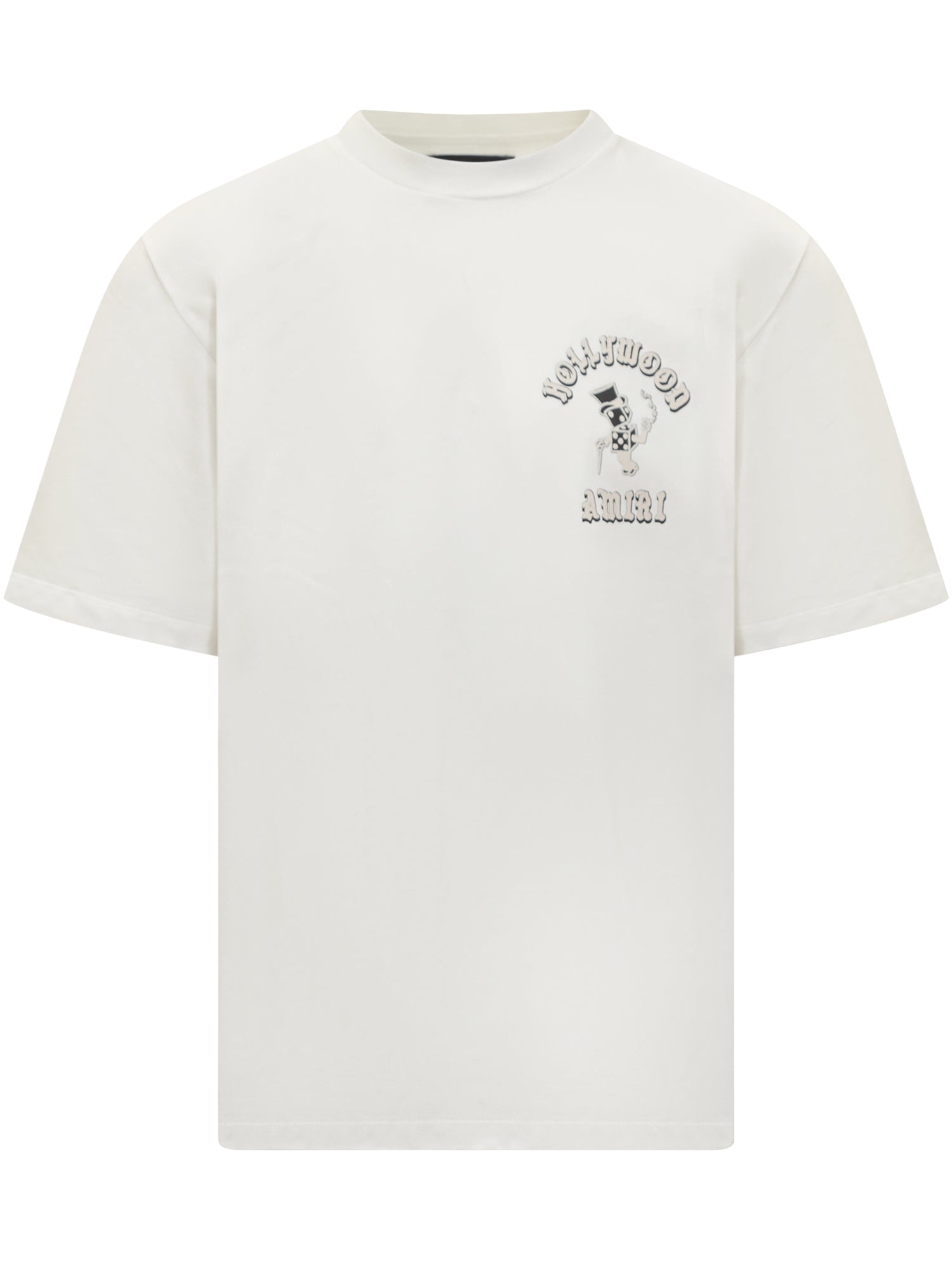 Amiri white cotton T-shirt with graphic print and Hollywood lettering on the chest.