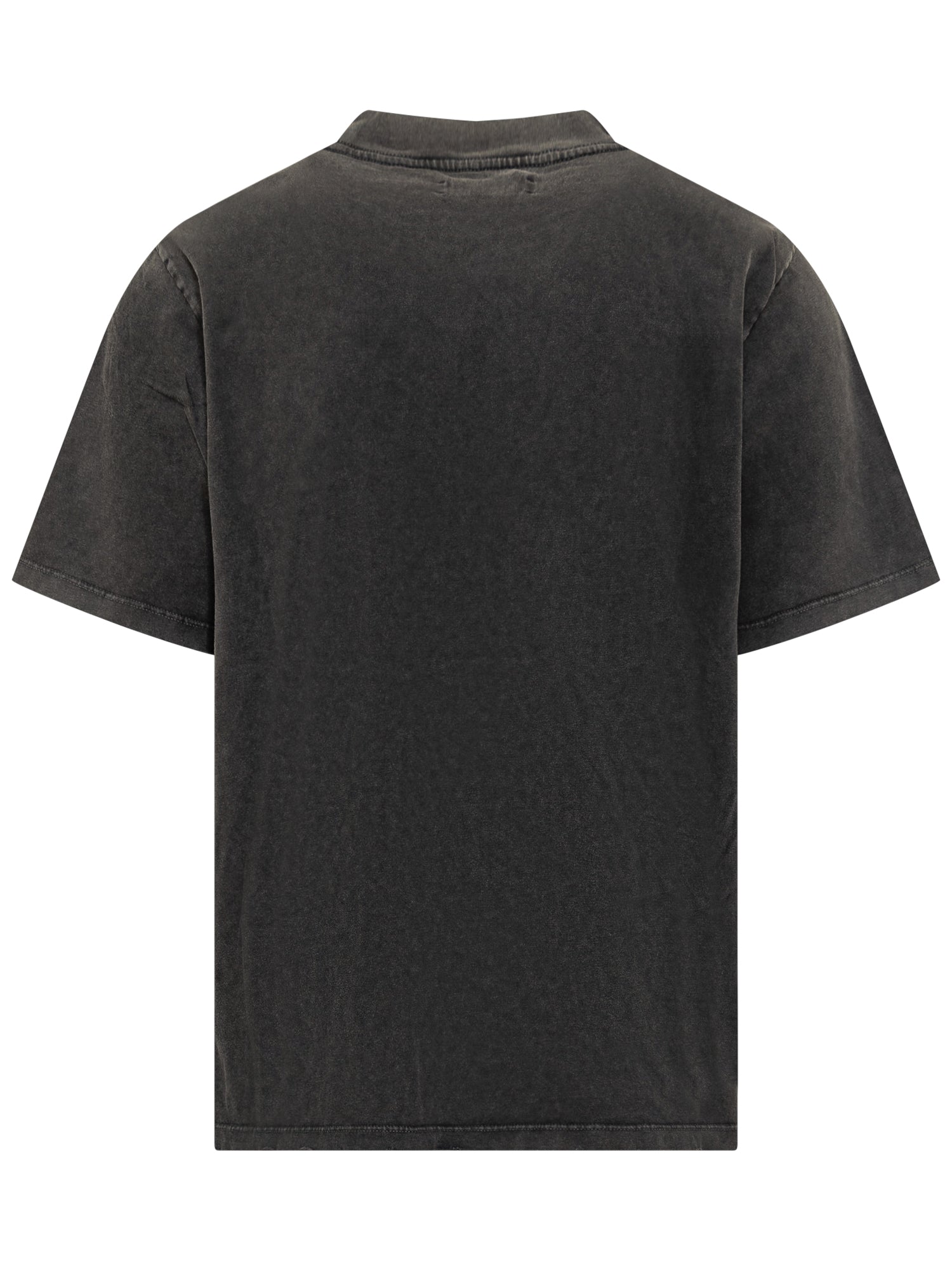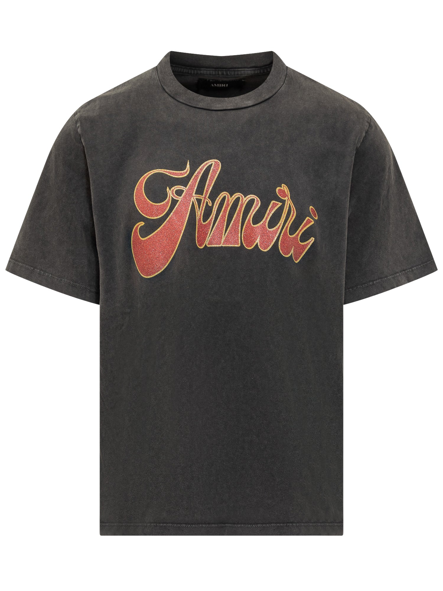 Amiri black washed cotton T-shirt with oversized glitter logo in red and gold on the front. Relaxed fit and contemporary style.