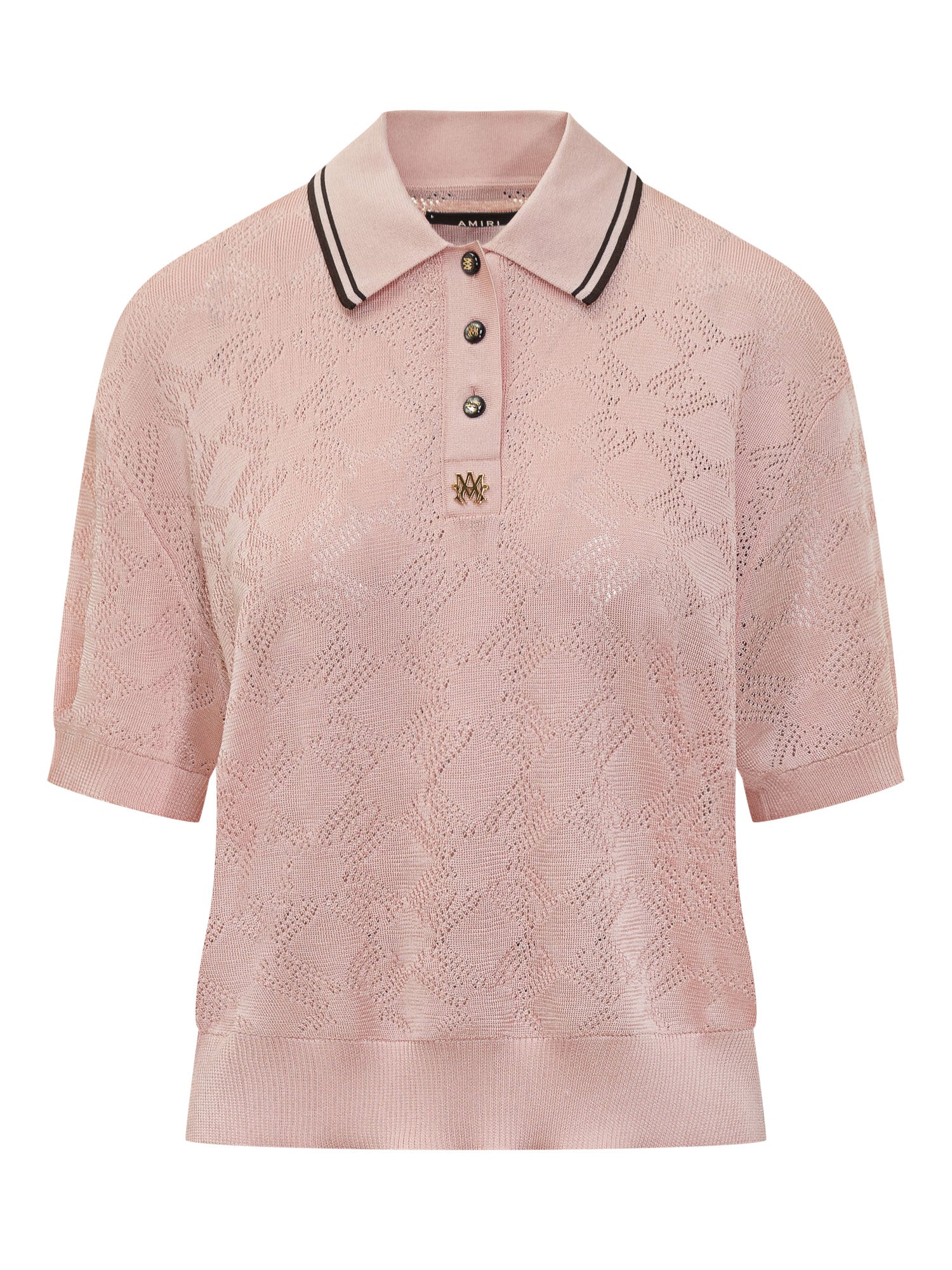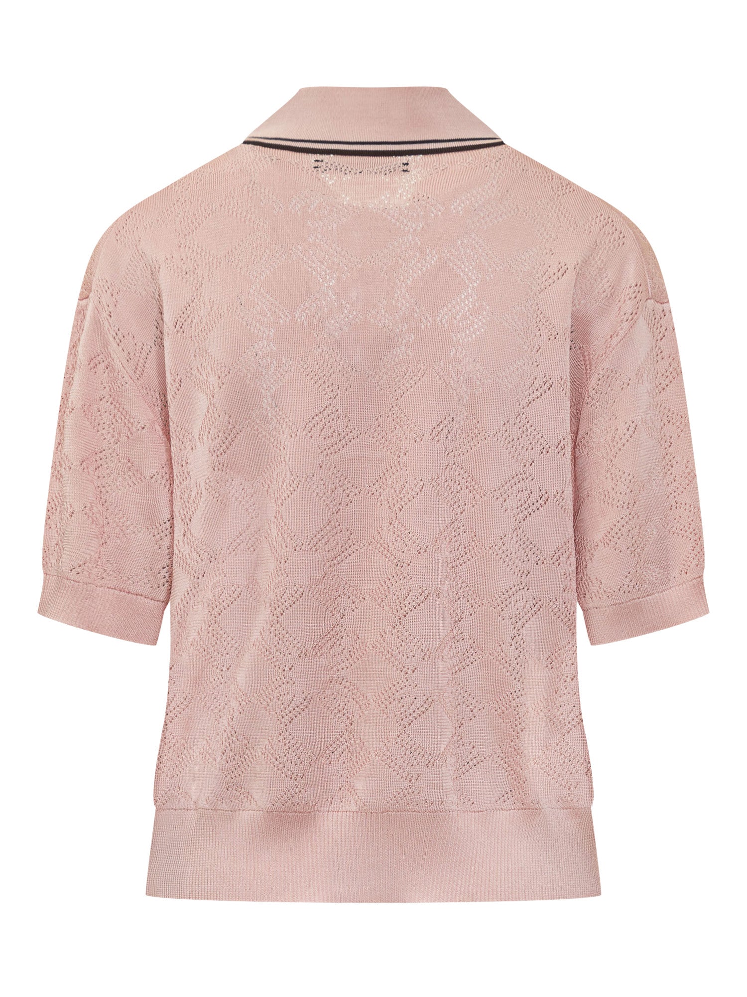 Classic collar. Closure with jewel buttons. Short sleeves. Ribbed hem and cuffs. Crochet details.