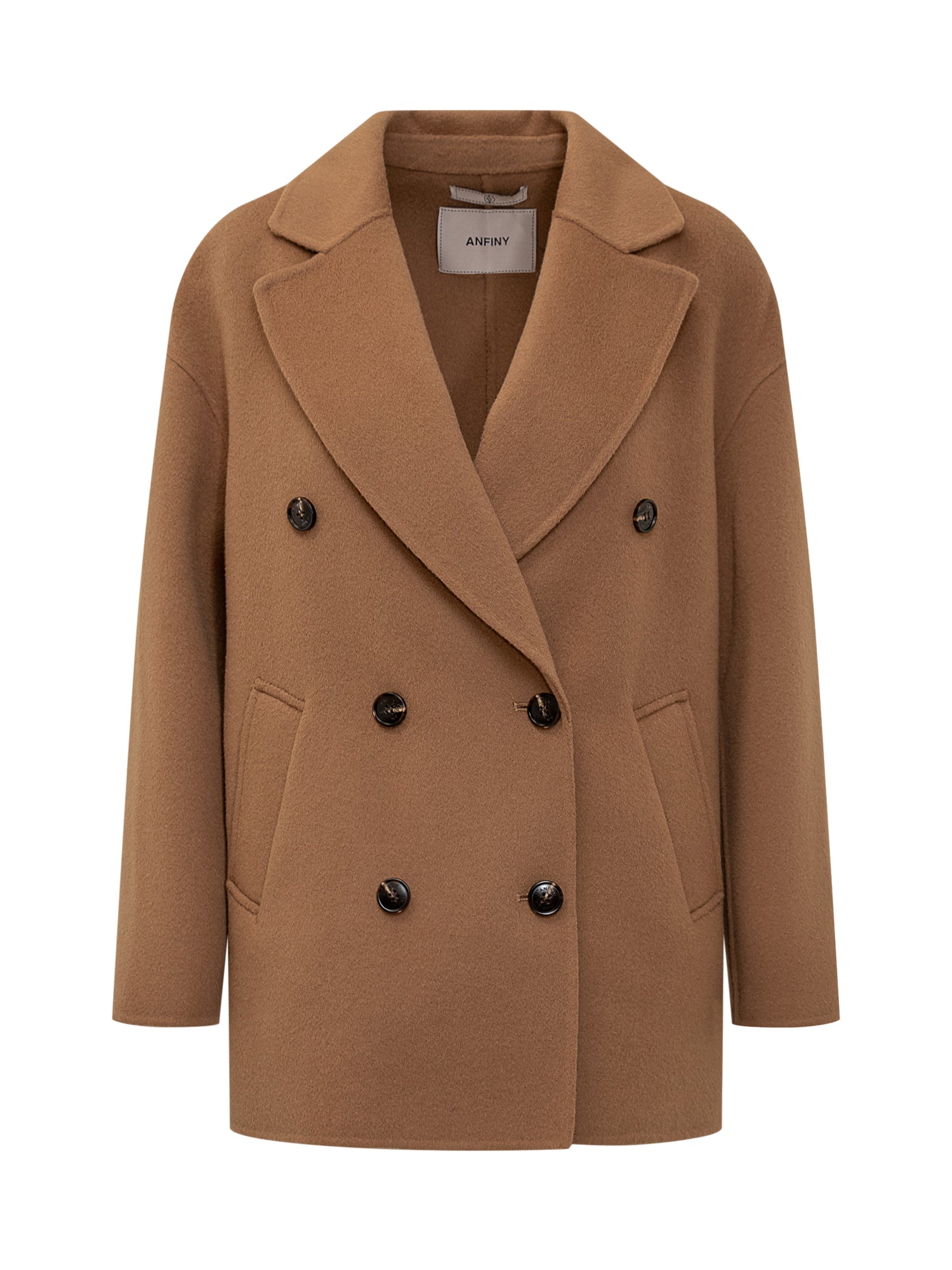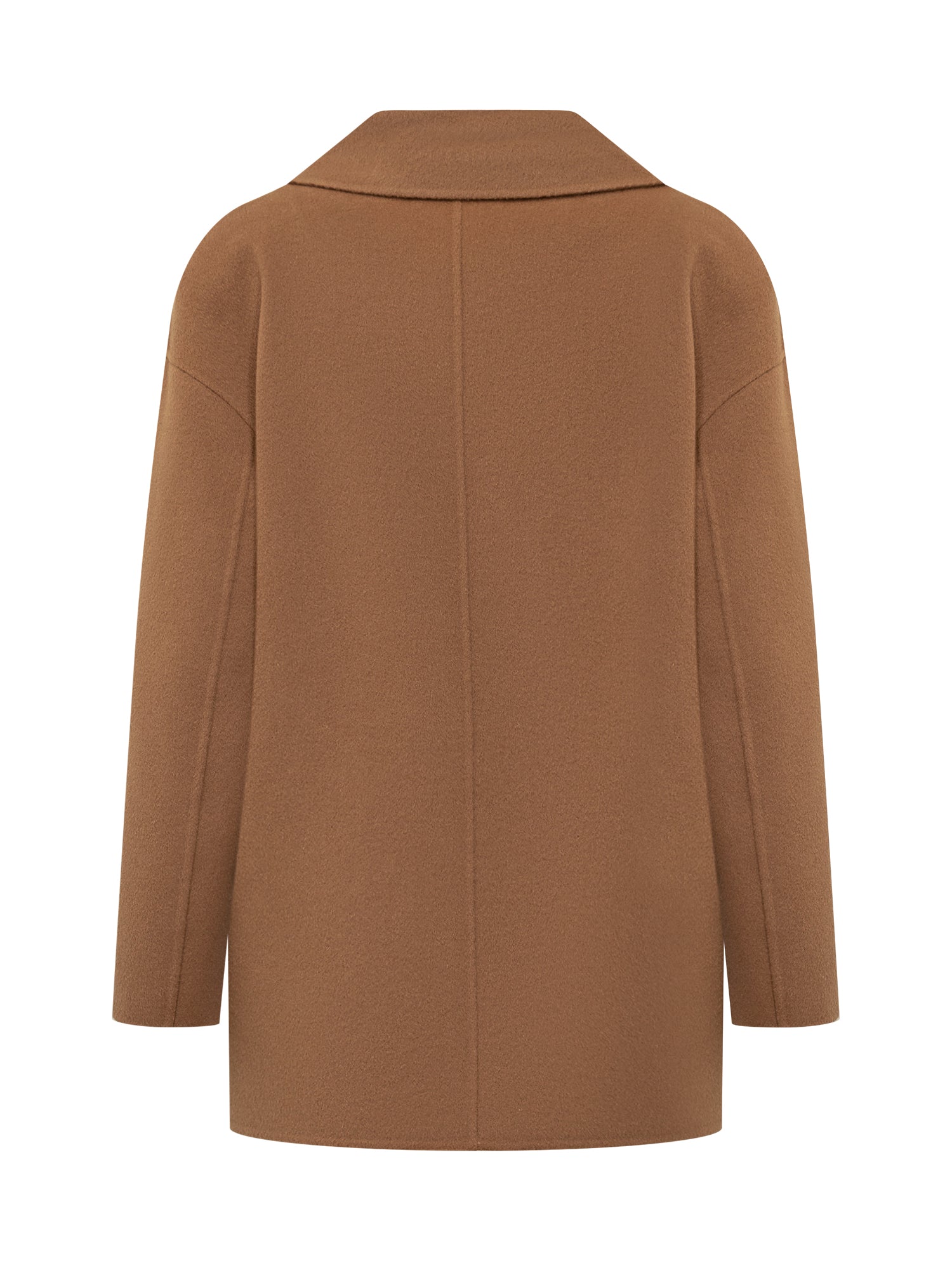 Short wool coat with long sleeves. Lapel collar. Double-breasted closure with buttons. Two pockets on the front.