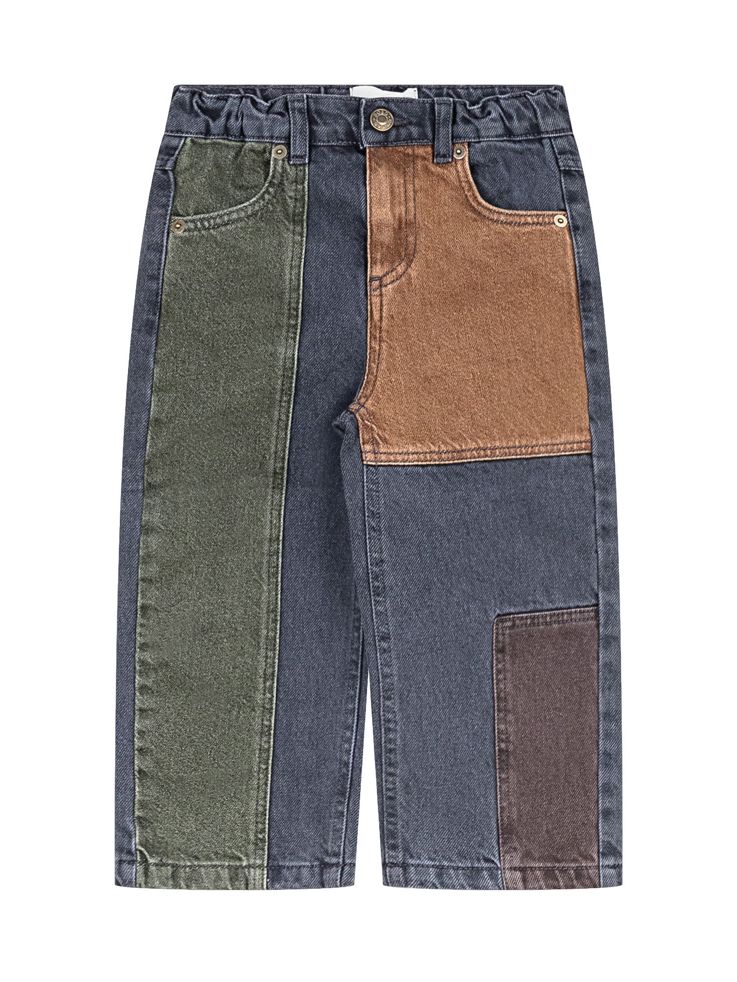 Bobo Choses denim jeans with contrasting patchwork details in green, brown and blue.