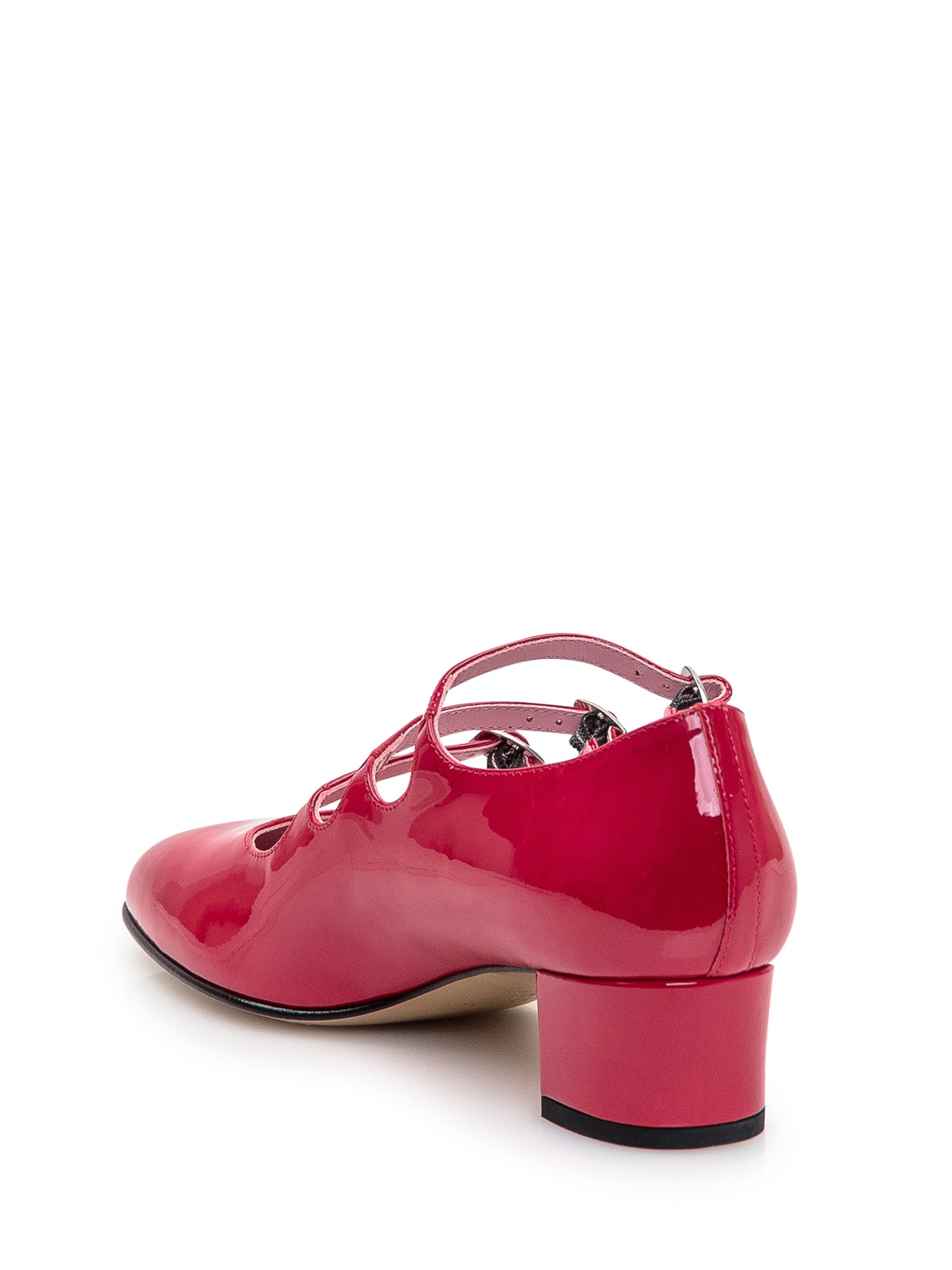 Red patent leather pumps. Round toe. Adjustable straps. Square heel.