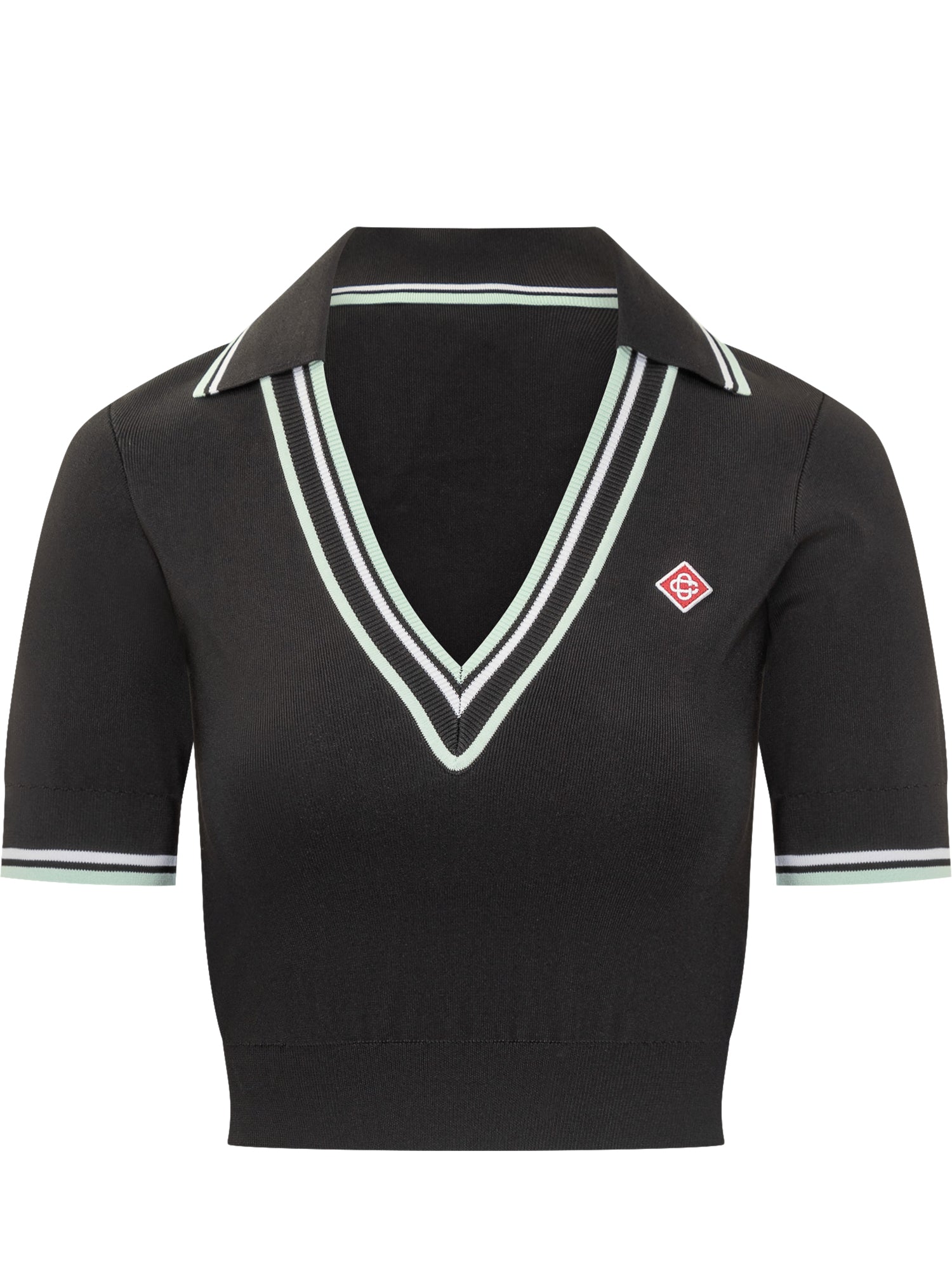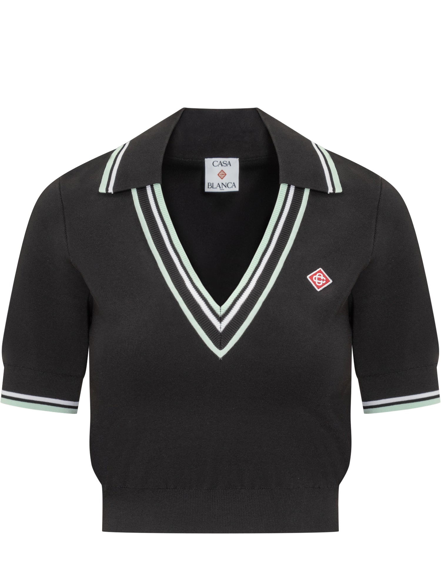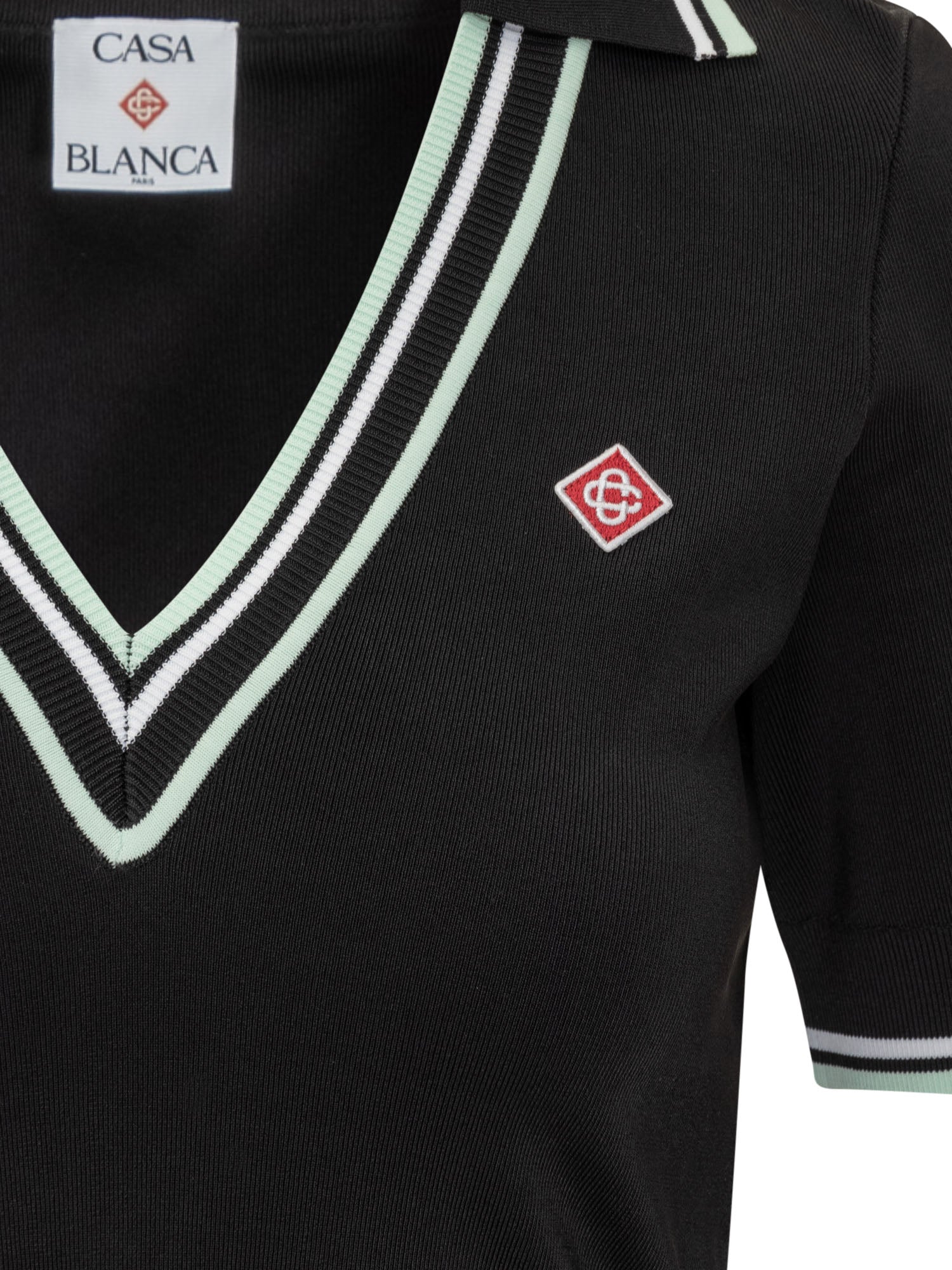 Casablanca women s viscose top in black with V-neck, polo collar, and contrast striped details. Slim fit and tennis-inspired design.