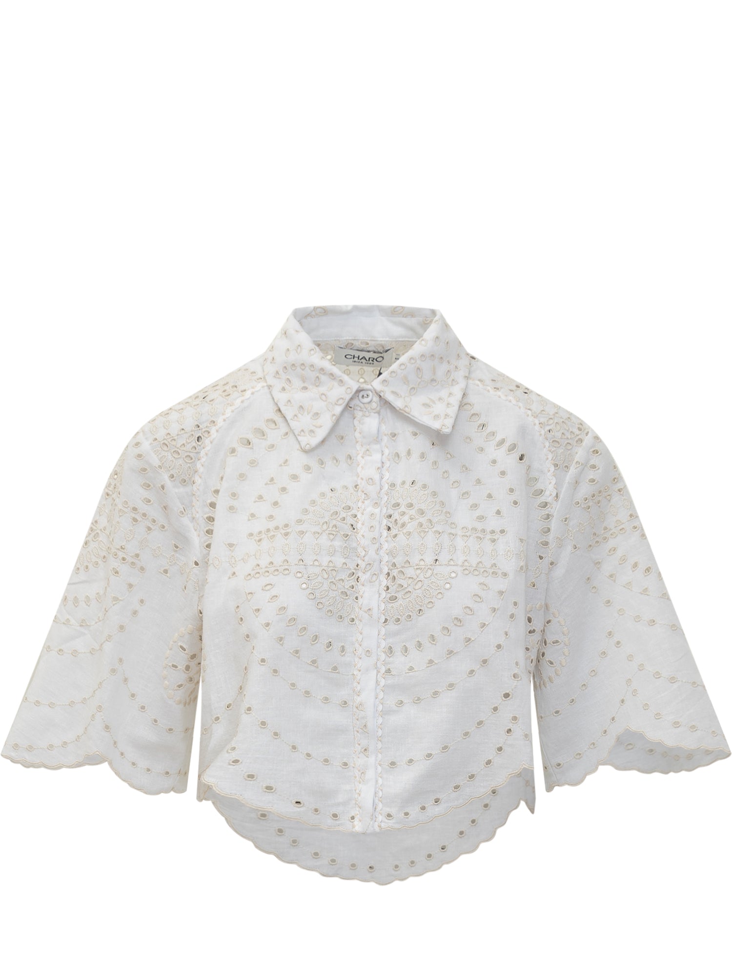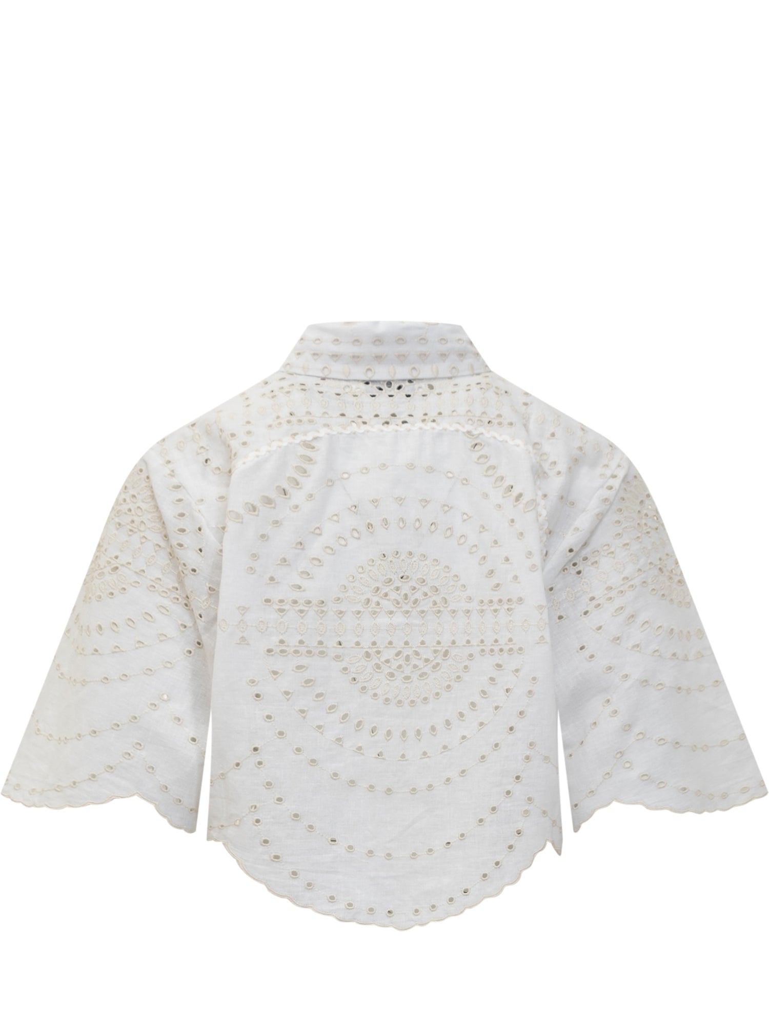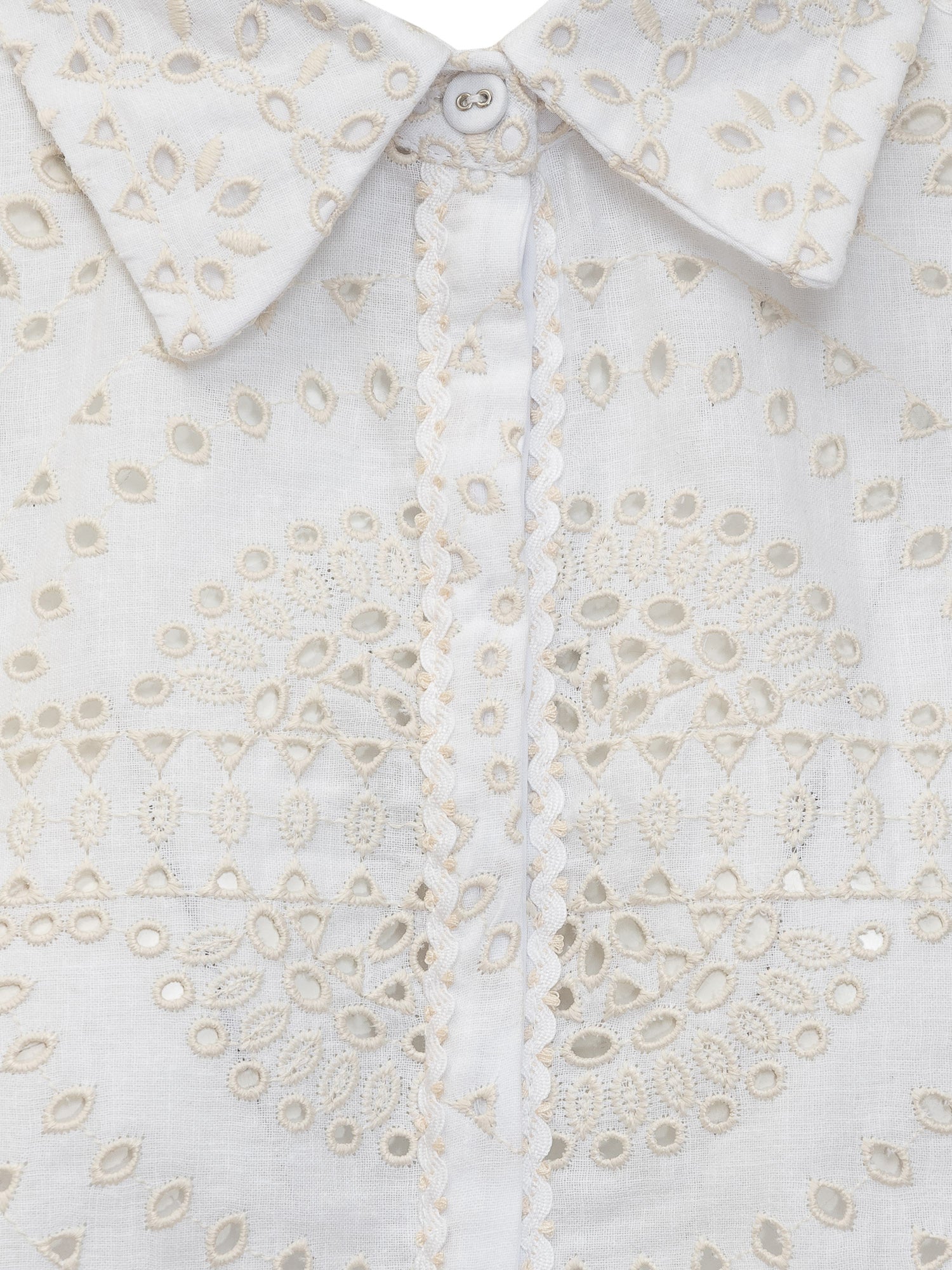 Button closure. Point collar. Short flared sleeves. Cropped cut. Boxy fit. Contrast embroidery details.