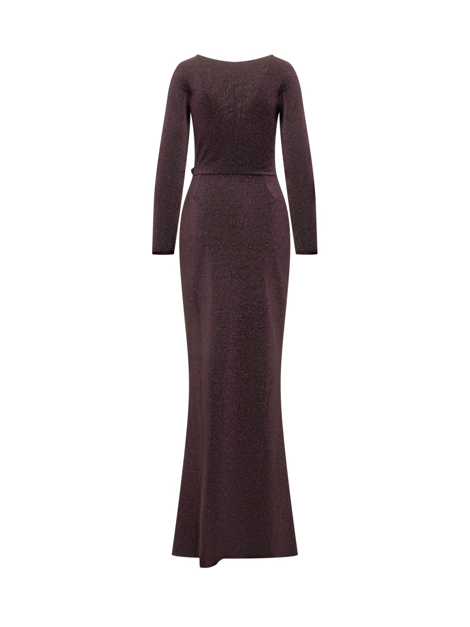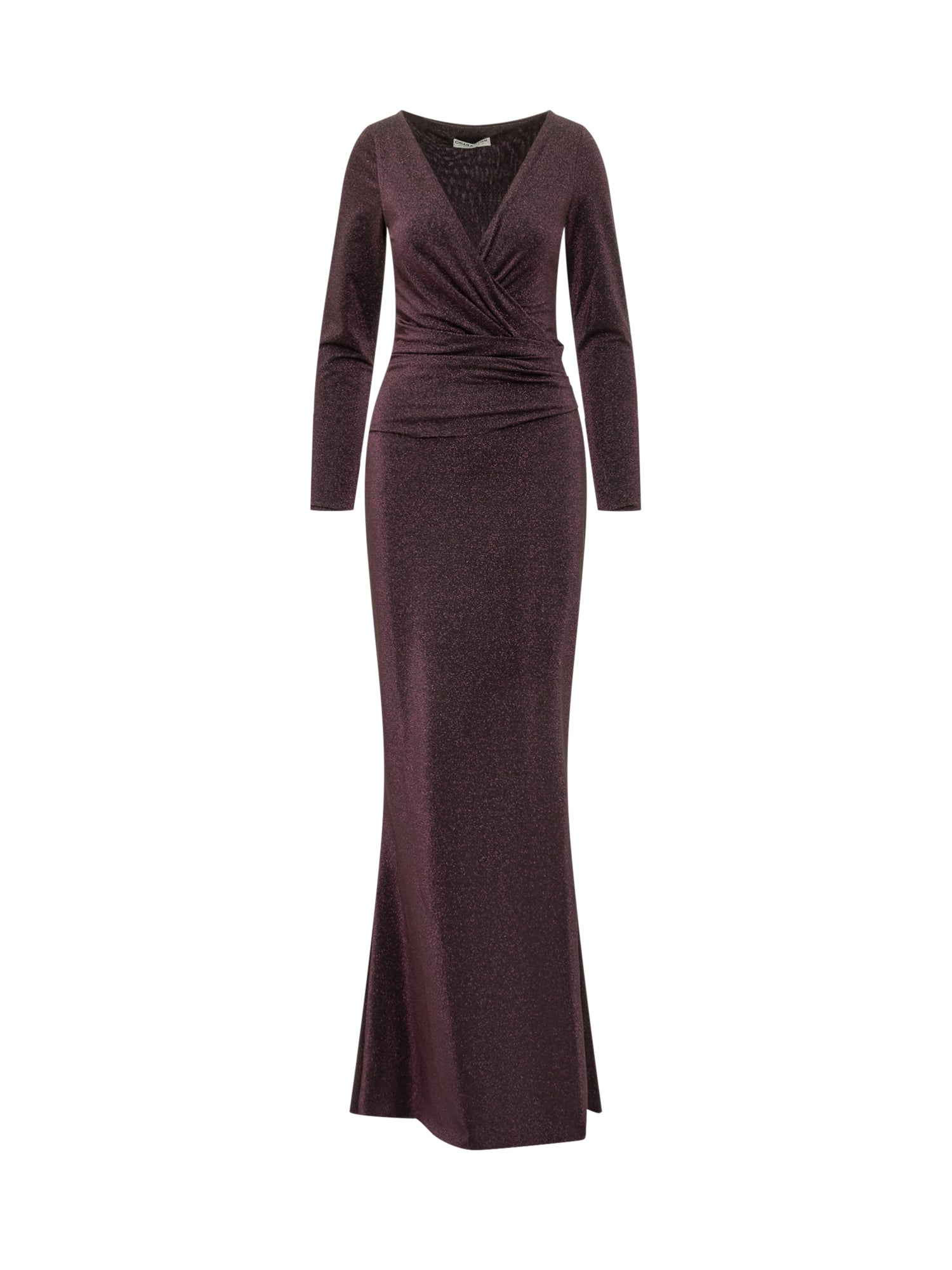 Chiara Boni Har Sugar long dress in purple lurex jersey. Features long sleeves, a wrap-style neckline, and flattering waist draping.