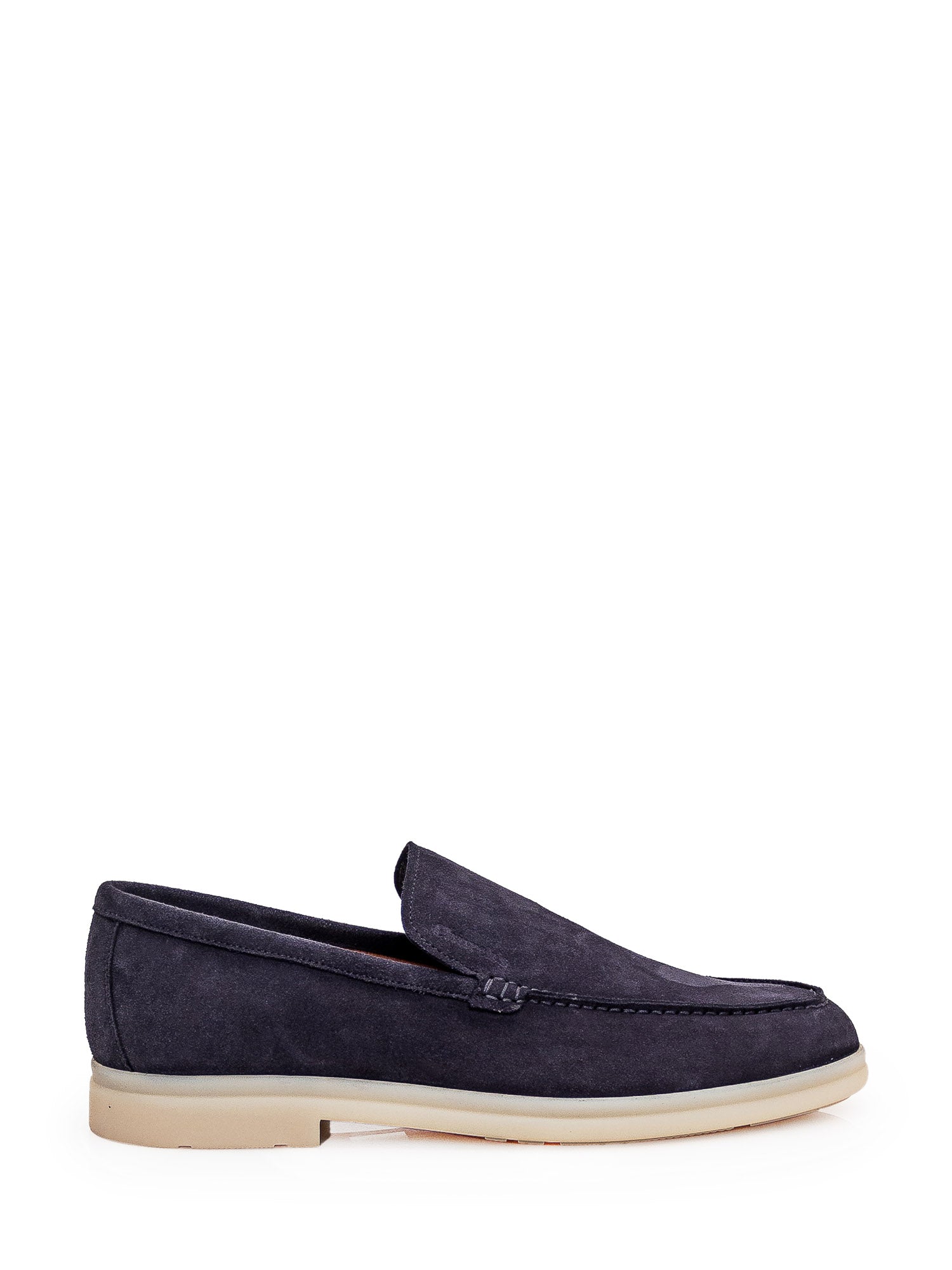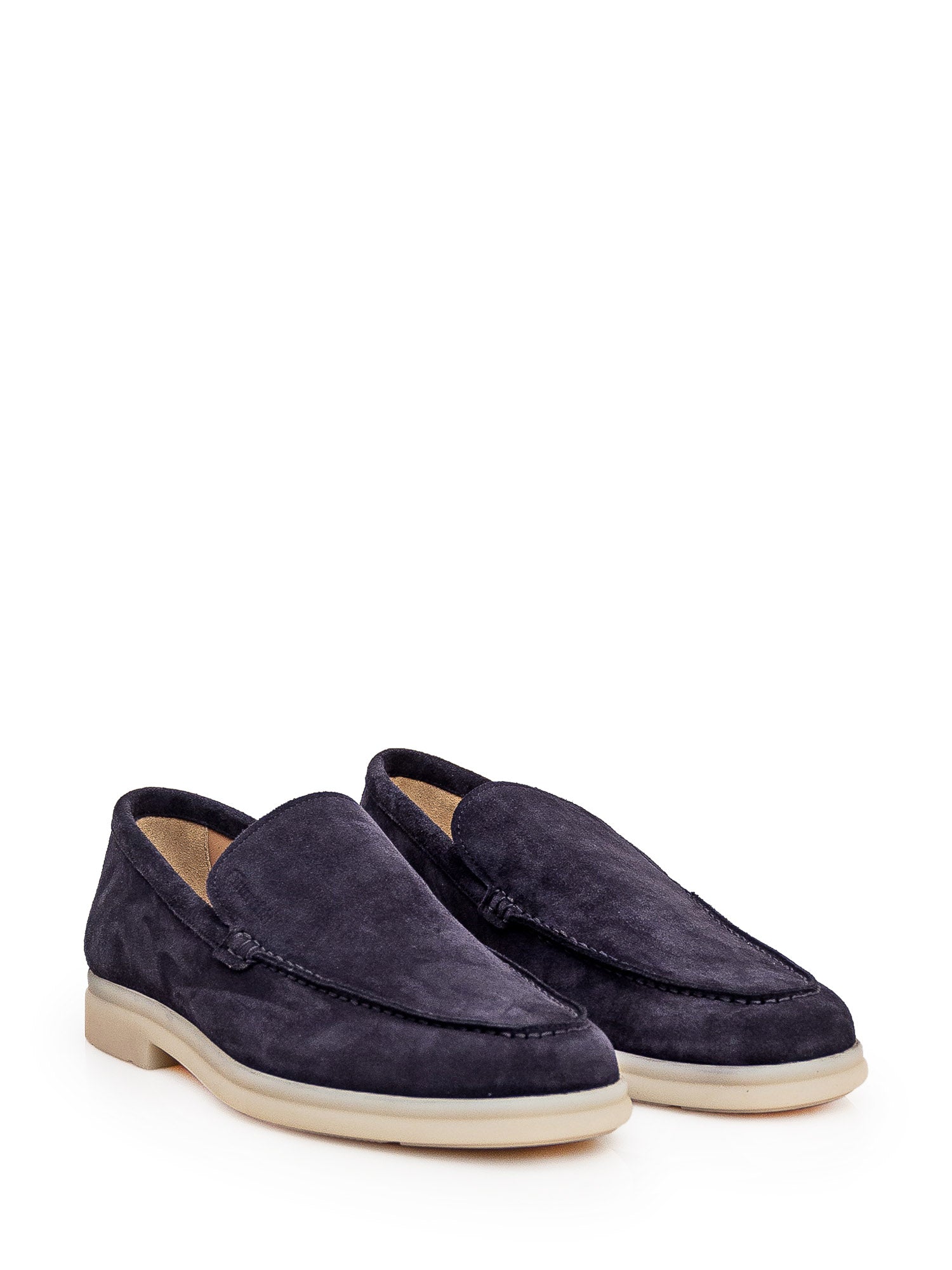 Blue suede loafer. Slip-on. Golden logo on the inner sole.