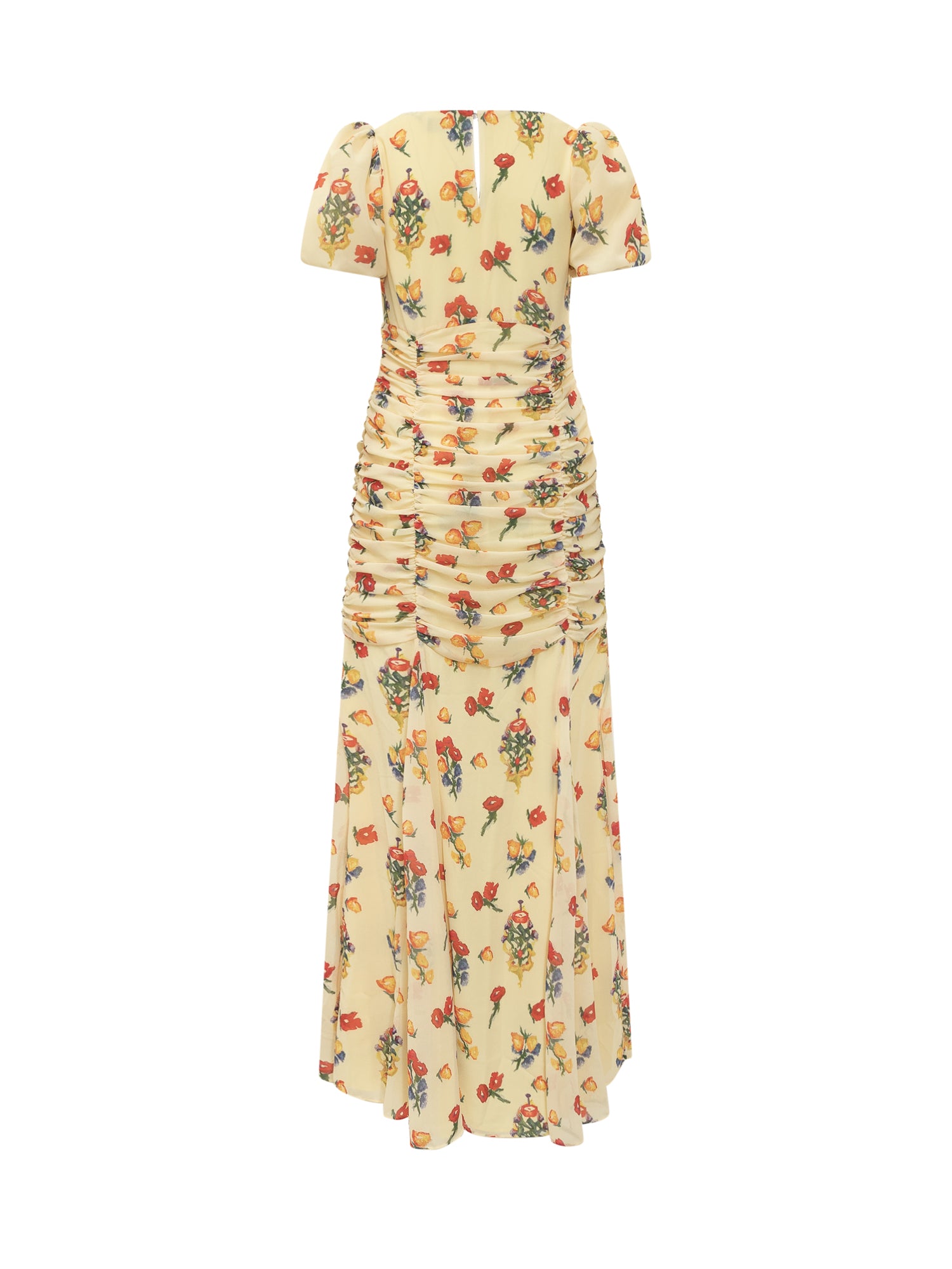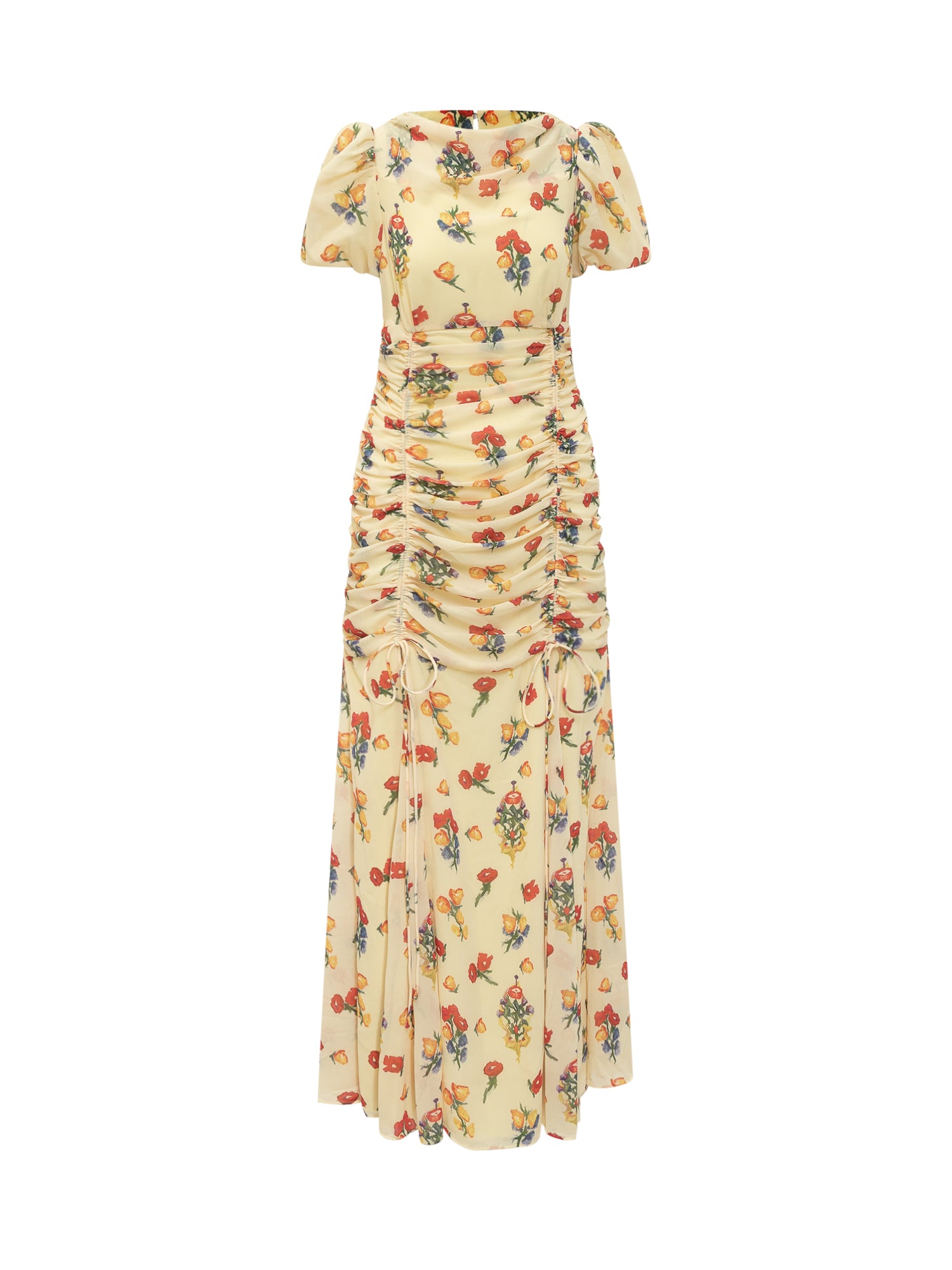 Long dress with short sleeves. Crew neck. Back button closure and side zipper. Curls at front with ties. All-over flowers motif.