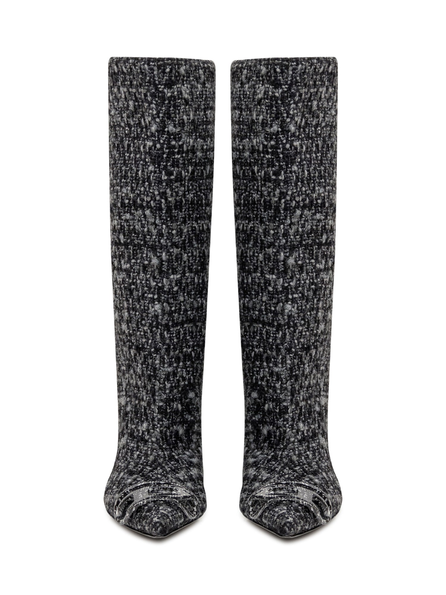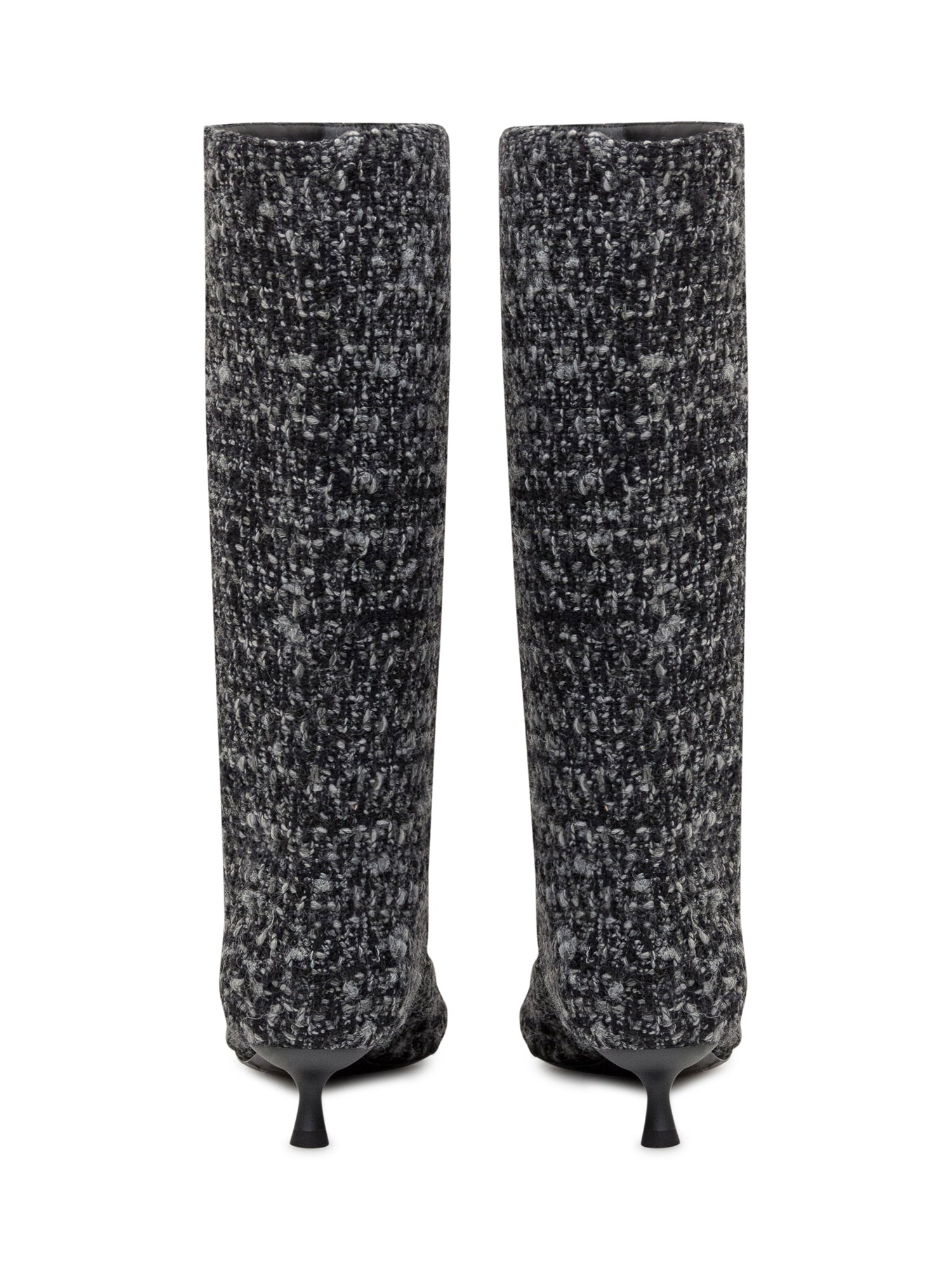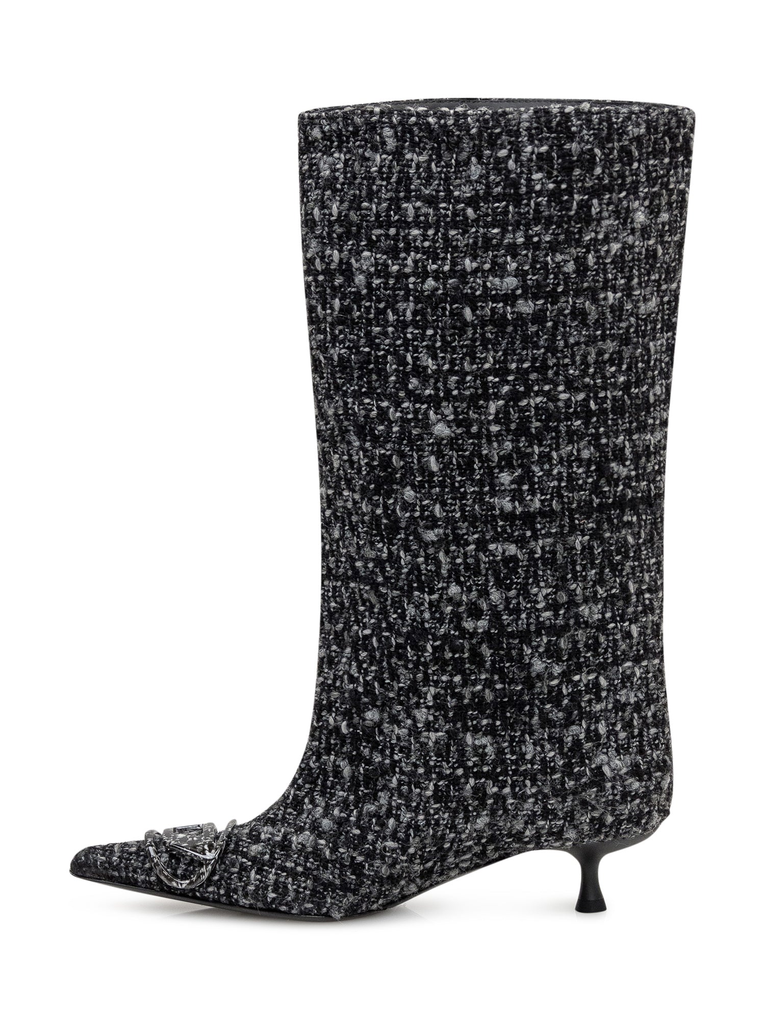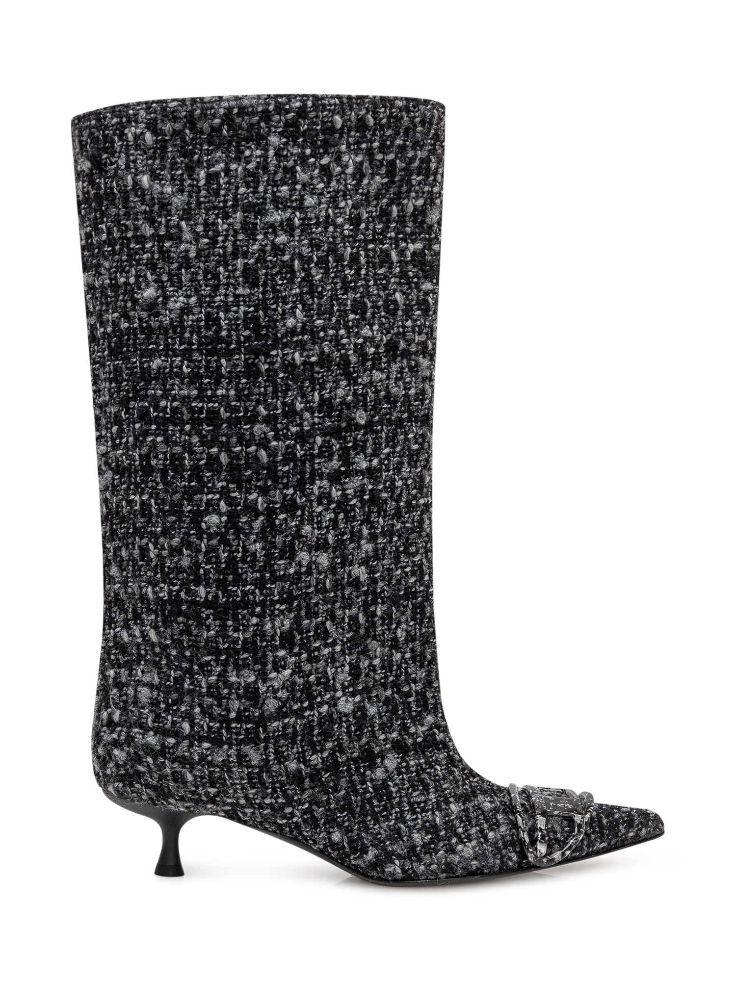 Diesel boots in black and grey tweed with pointed toe, buckle detail and kitten heel.