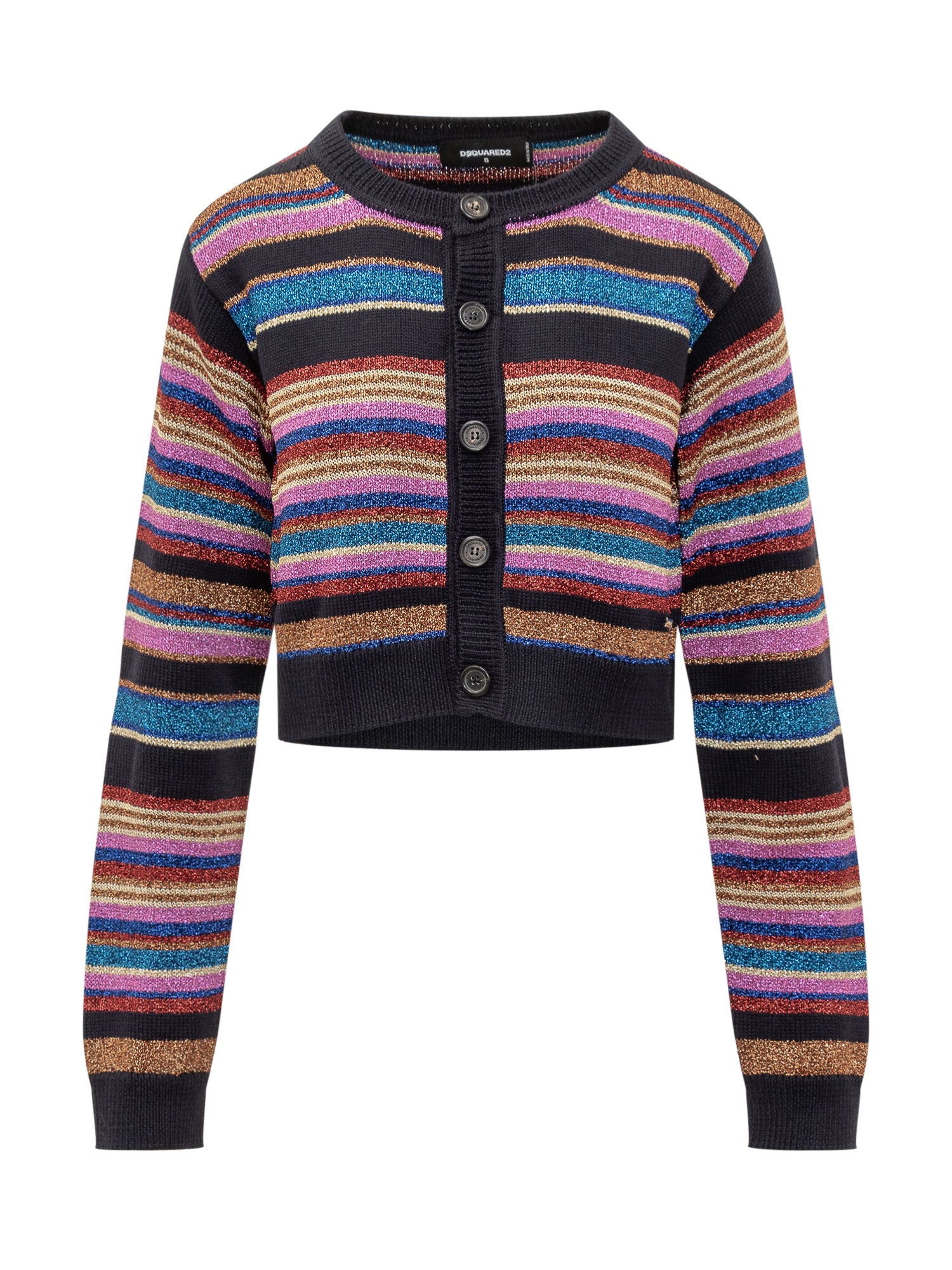 DSquared2 cropped cardigan featuring multicolor stripes and lamé thread. Crew neck with front button closure.