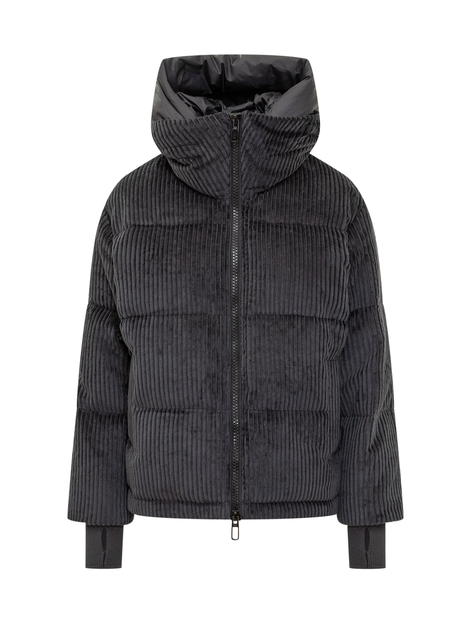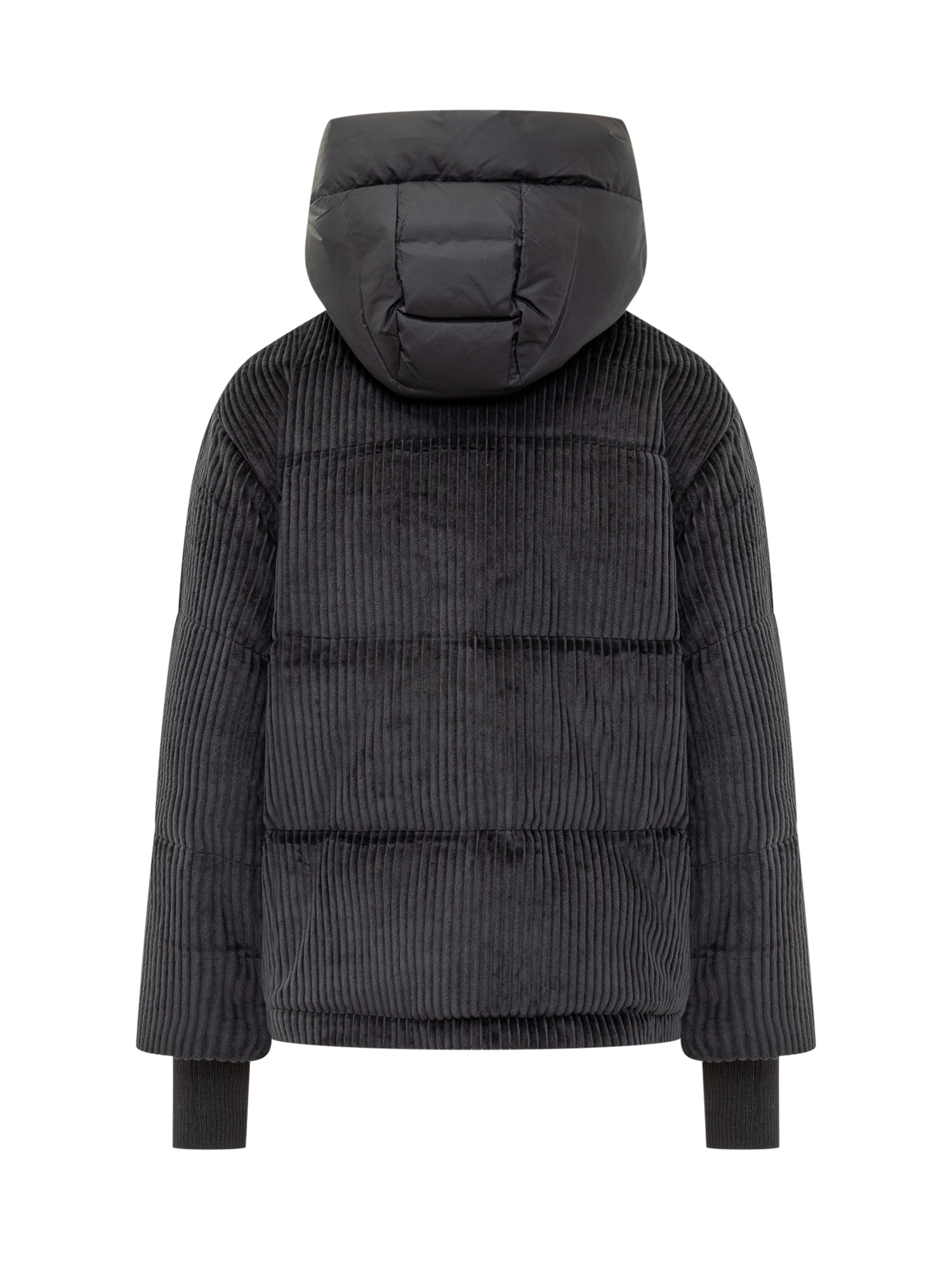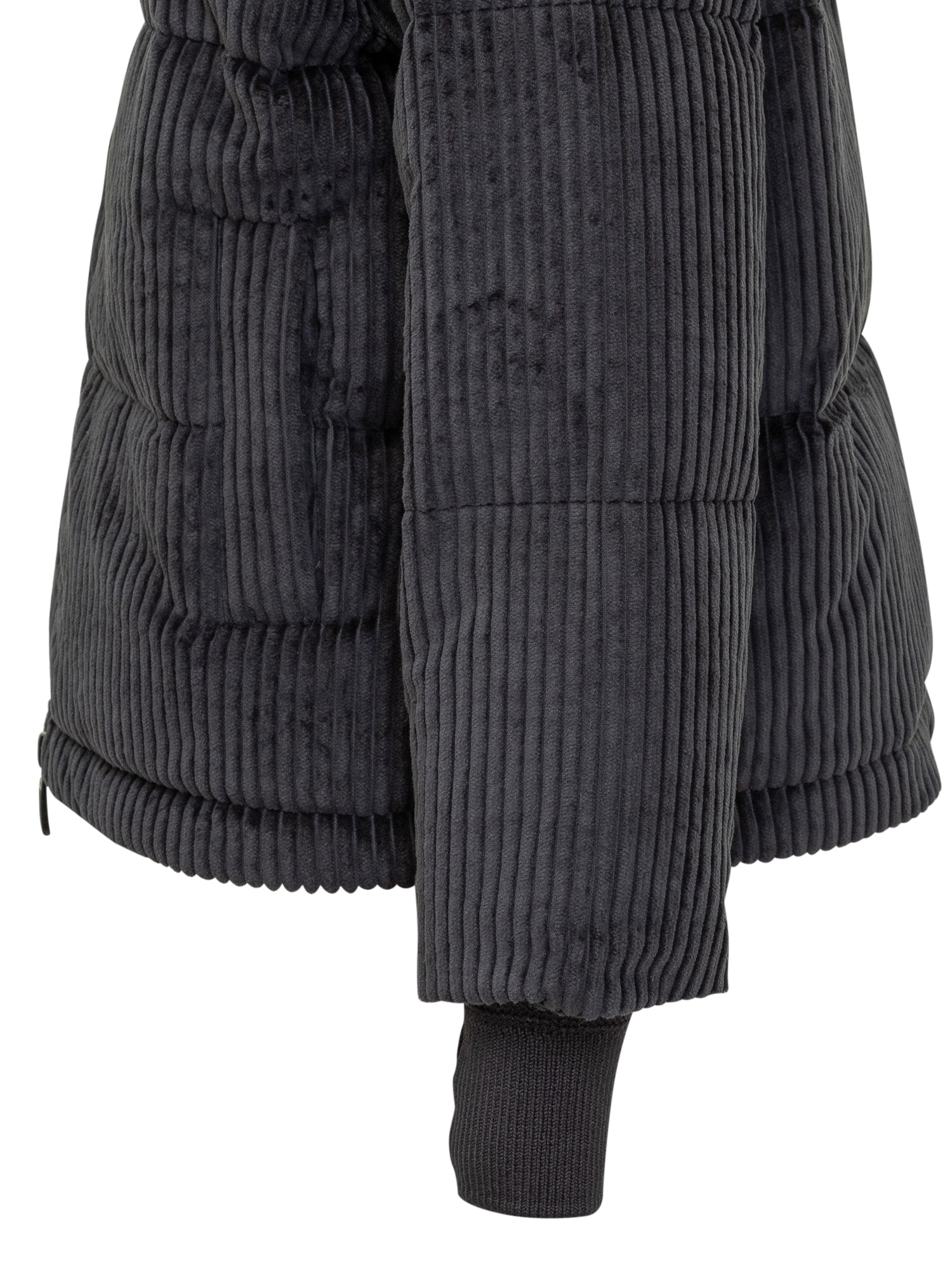 Duno black corduroy puffer jacket with removable hood and front zip.