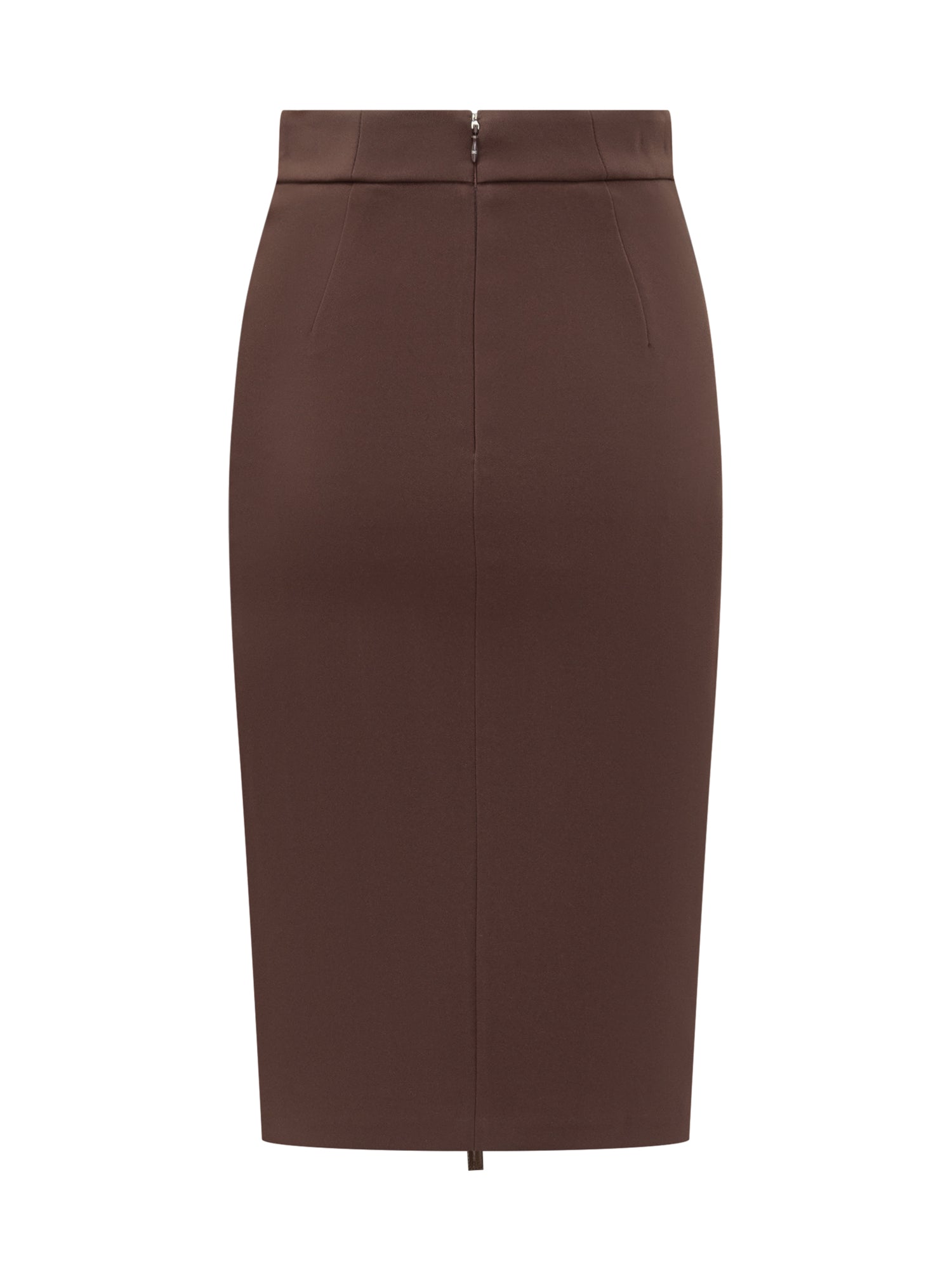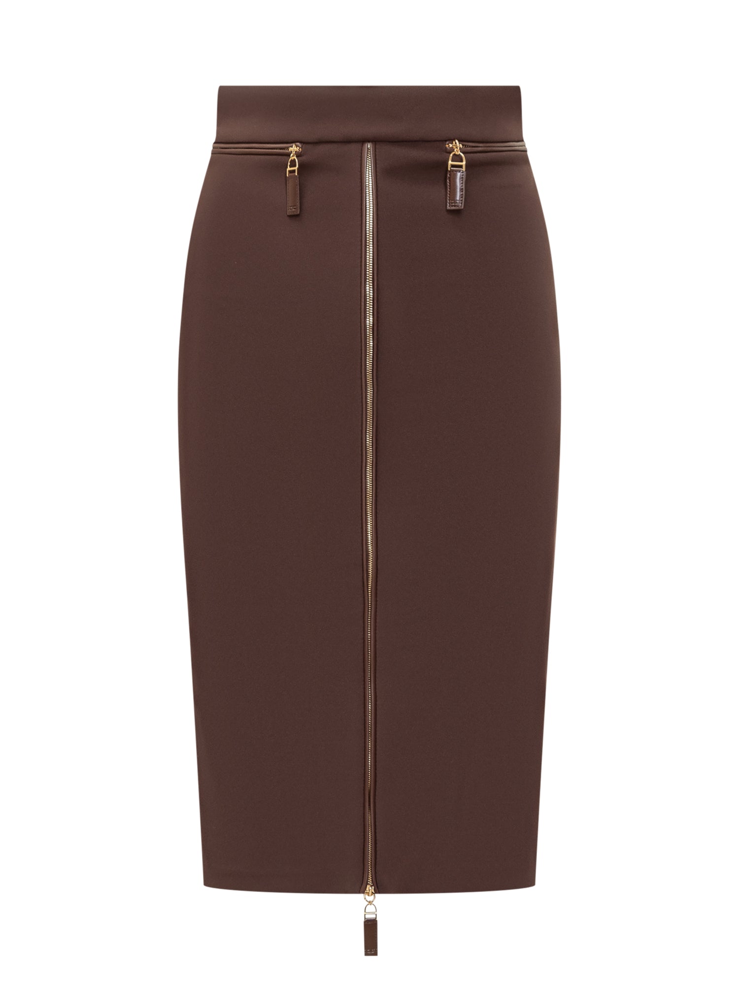 Elisabetta Franchi pencil skirt in brown technical fabric with double-slider gold front zip.