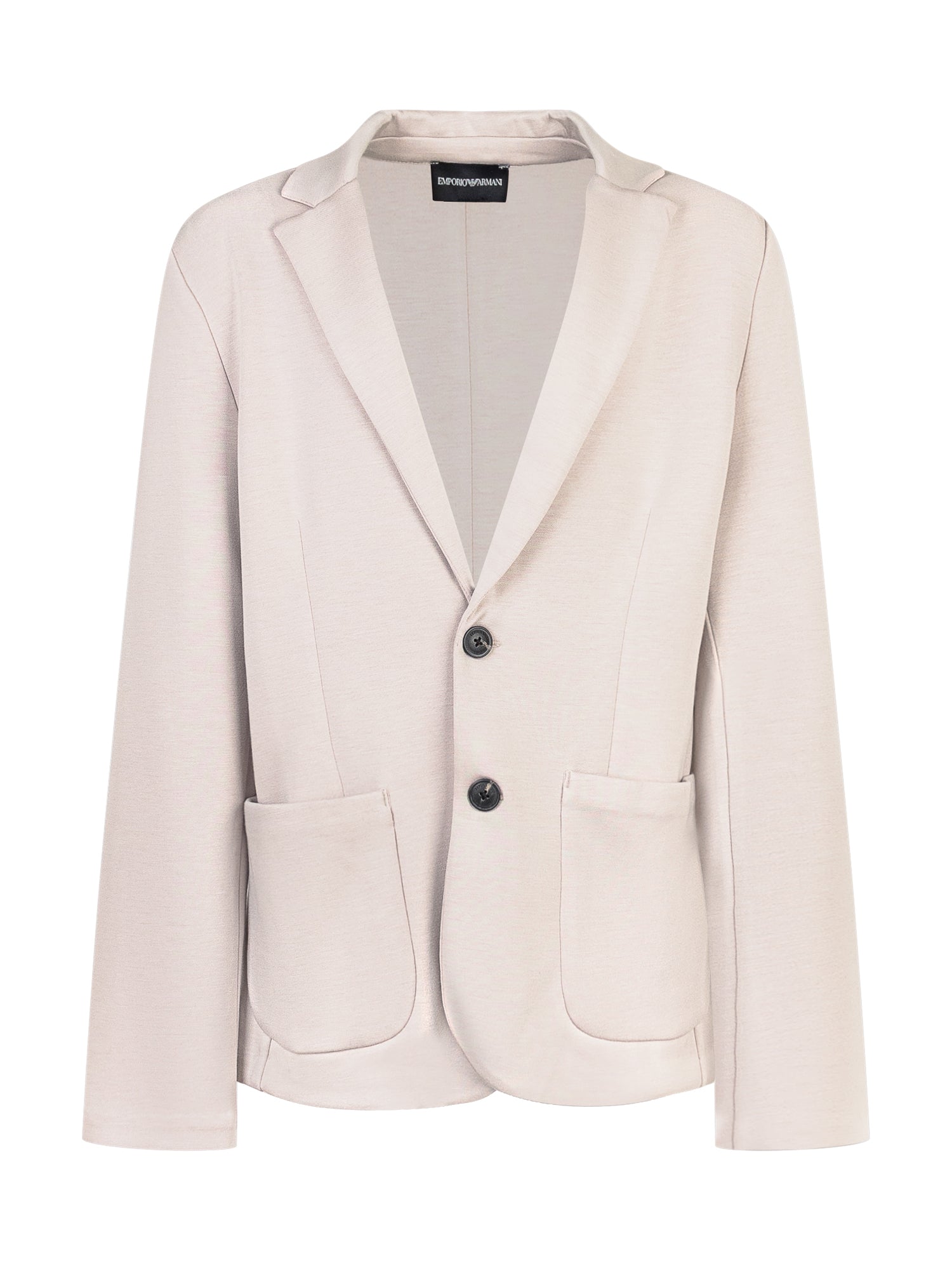 Emporio Armani boys beige blazer with classic lapels, patch pockets and two-button closure.