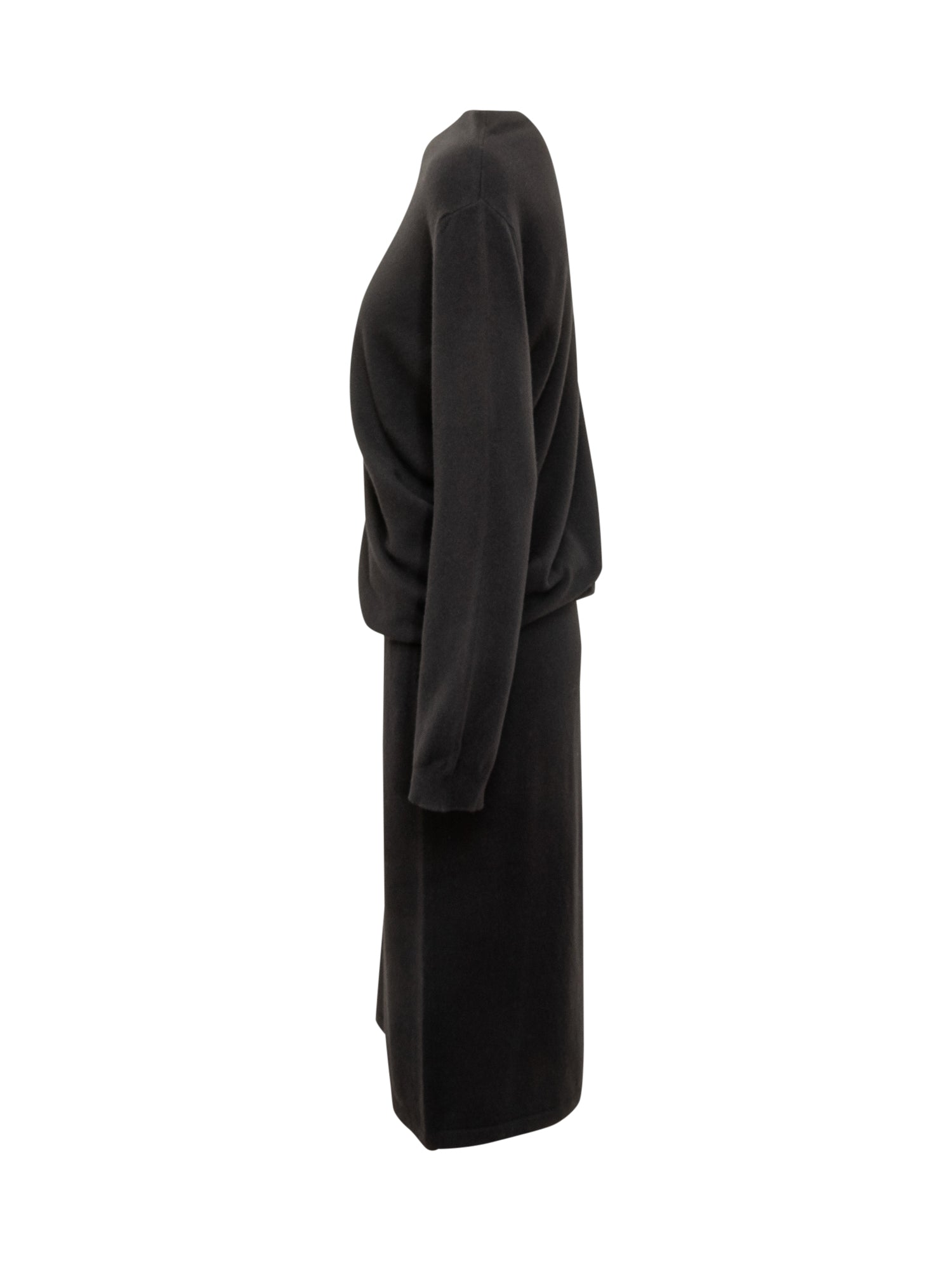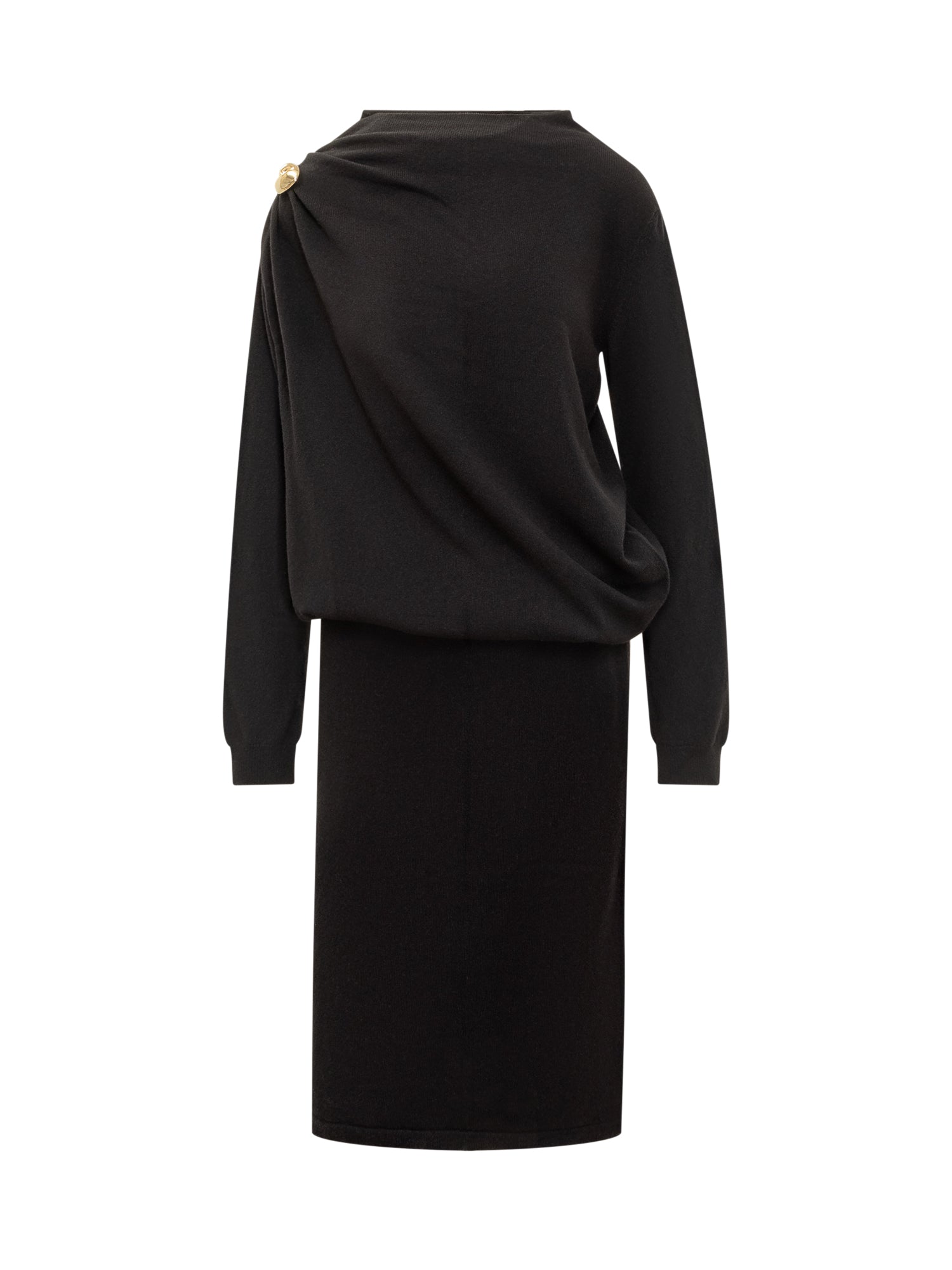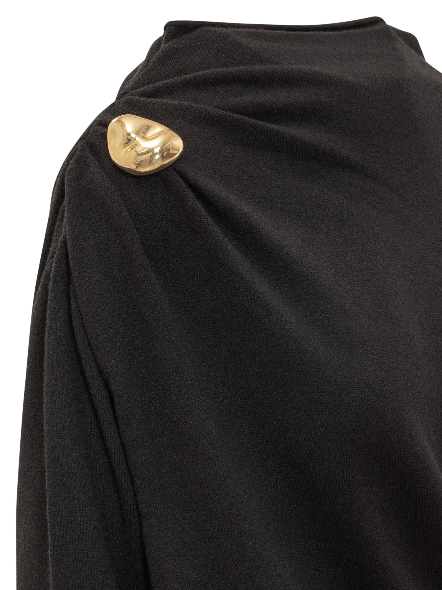 Elegant black knit dress with asymmetric draping and golden jewel detail on the shoulder.