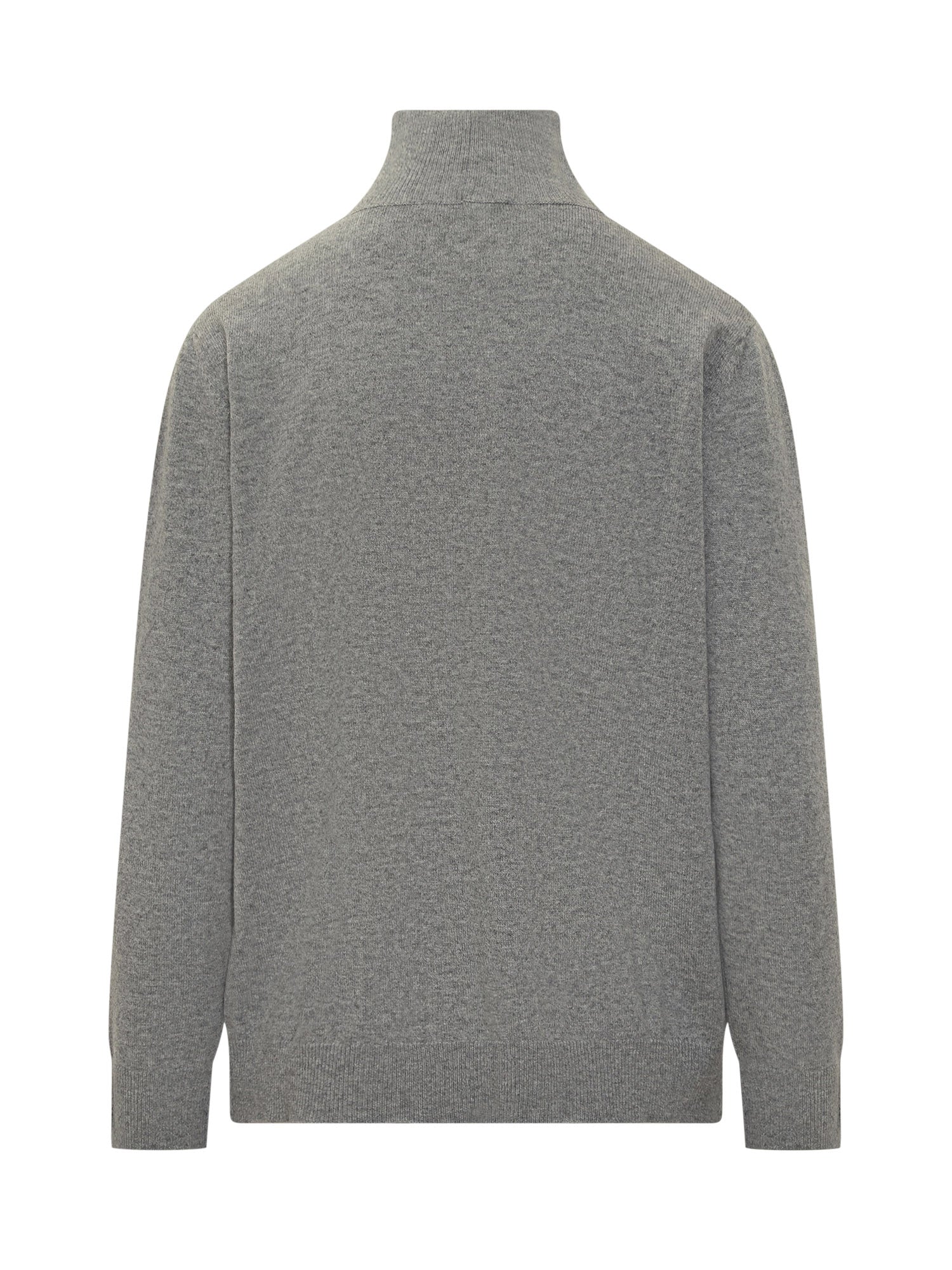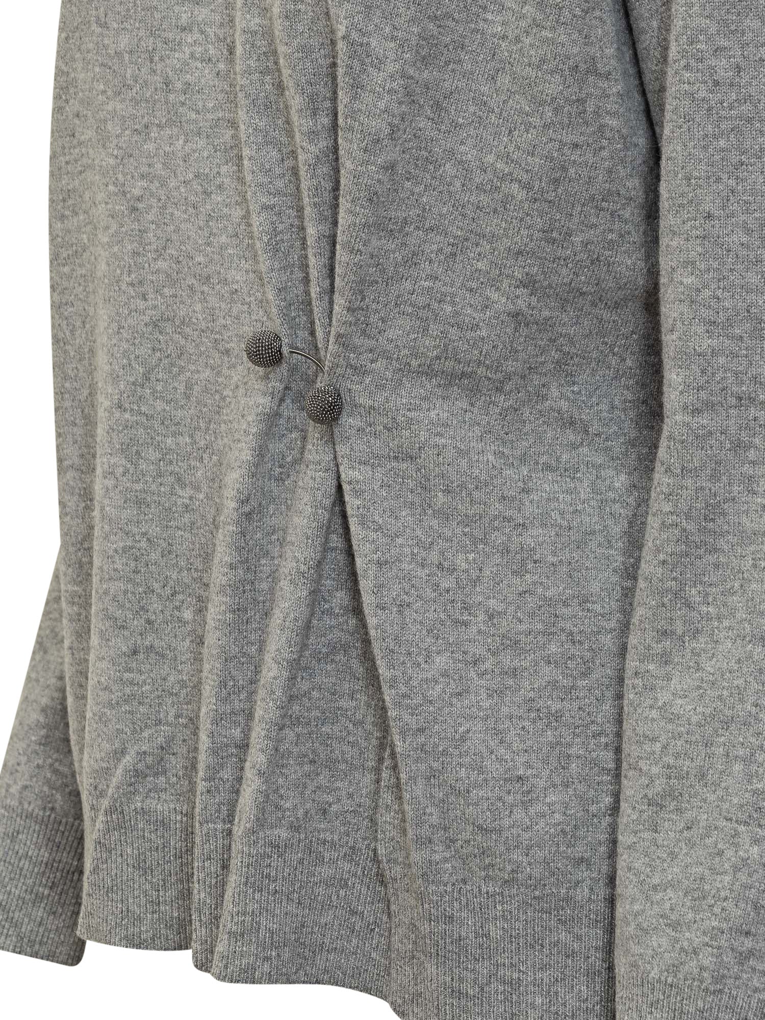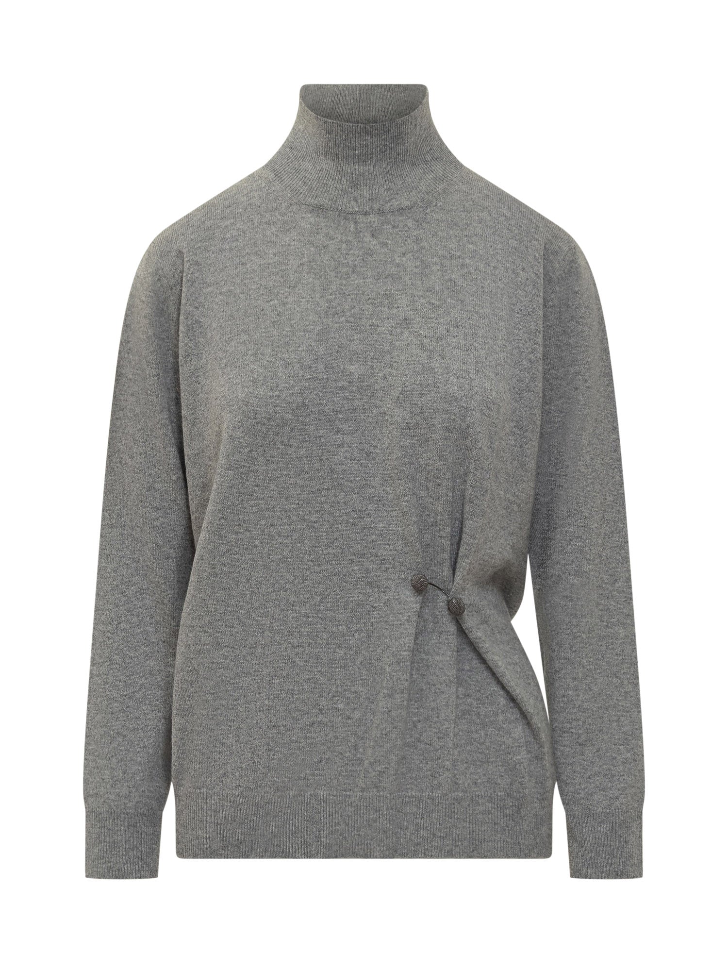 Grey fine-knit turtleneck sweater with side drape detail and covered buttons.