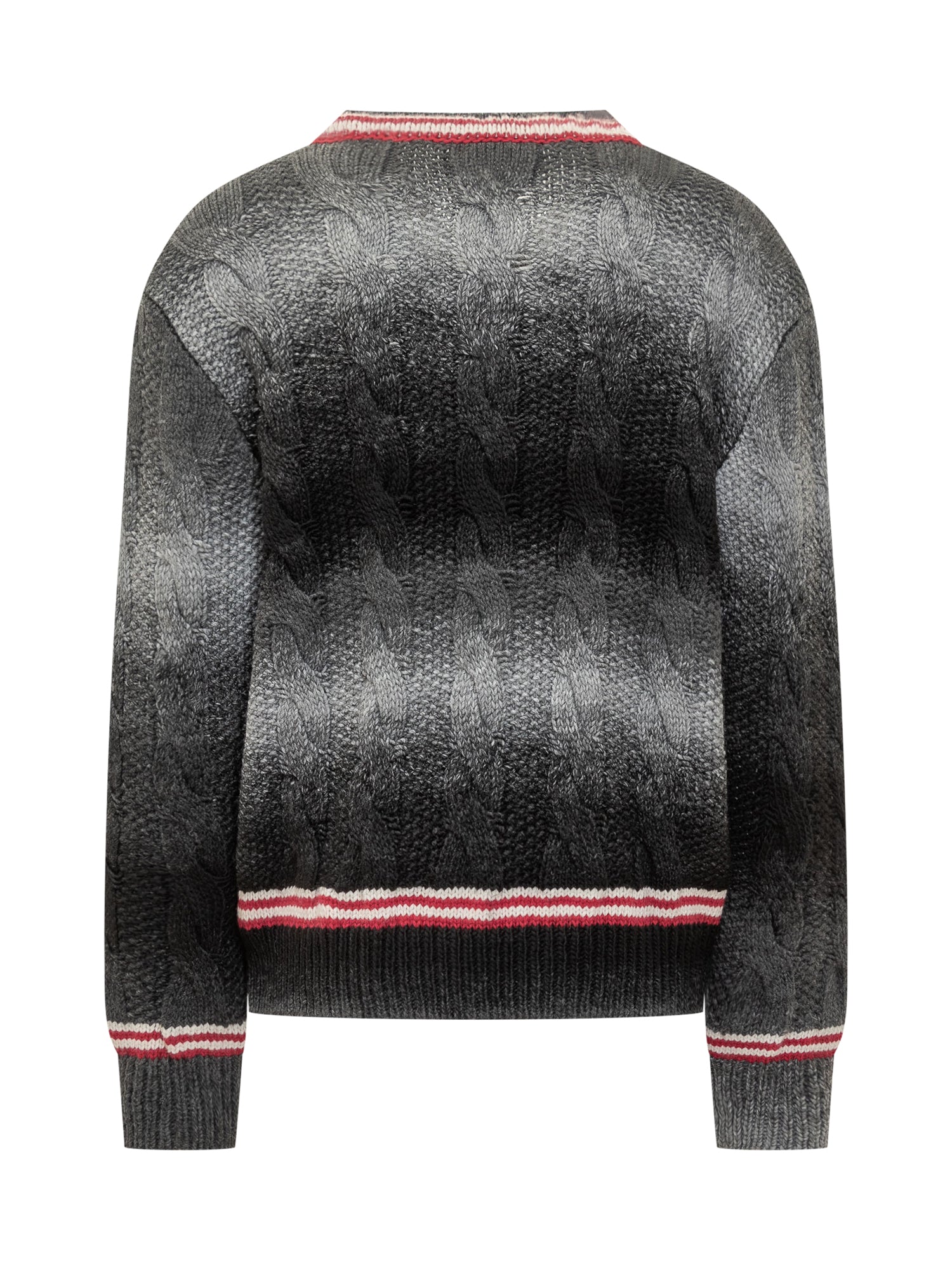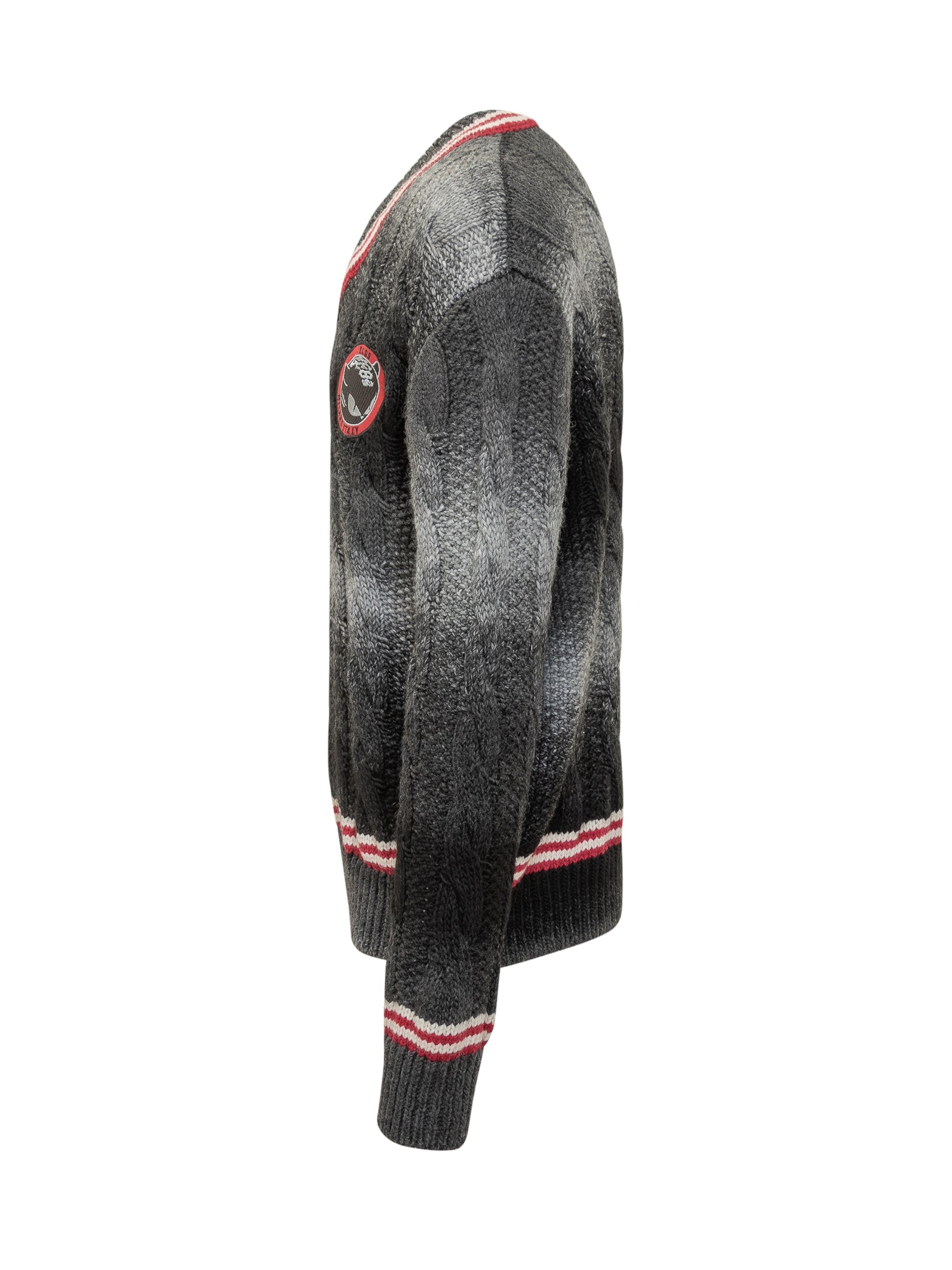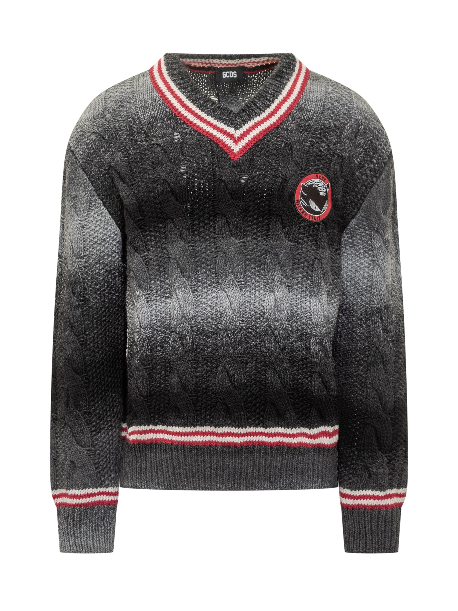 GCDS grey gradient wool sweater with cable knit design, V-neck with red stripe details and embroidered chest logo.