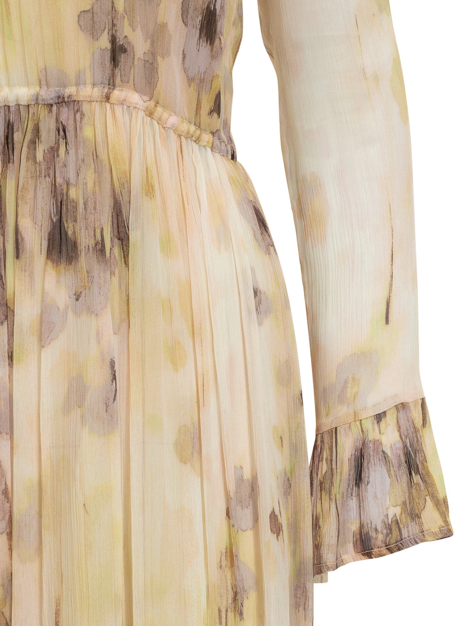 Long viscose dress. Round neck. Button closure on the back. Flounce at the bottom. All over floral pattern. With petticoat.