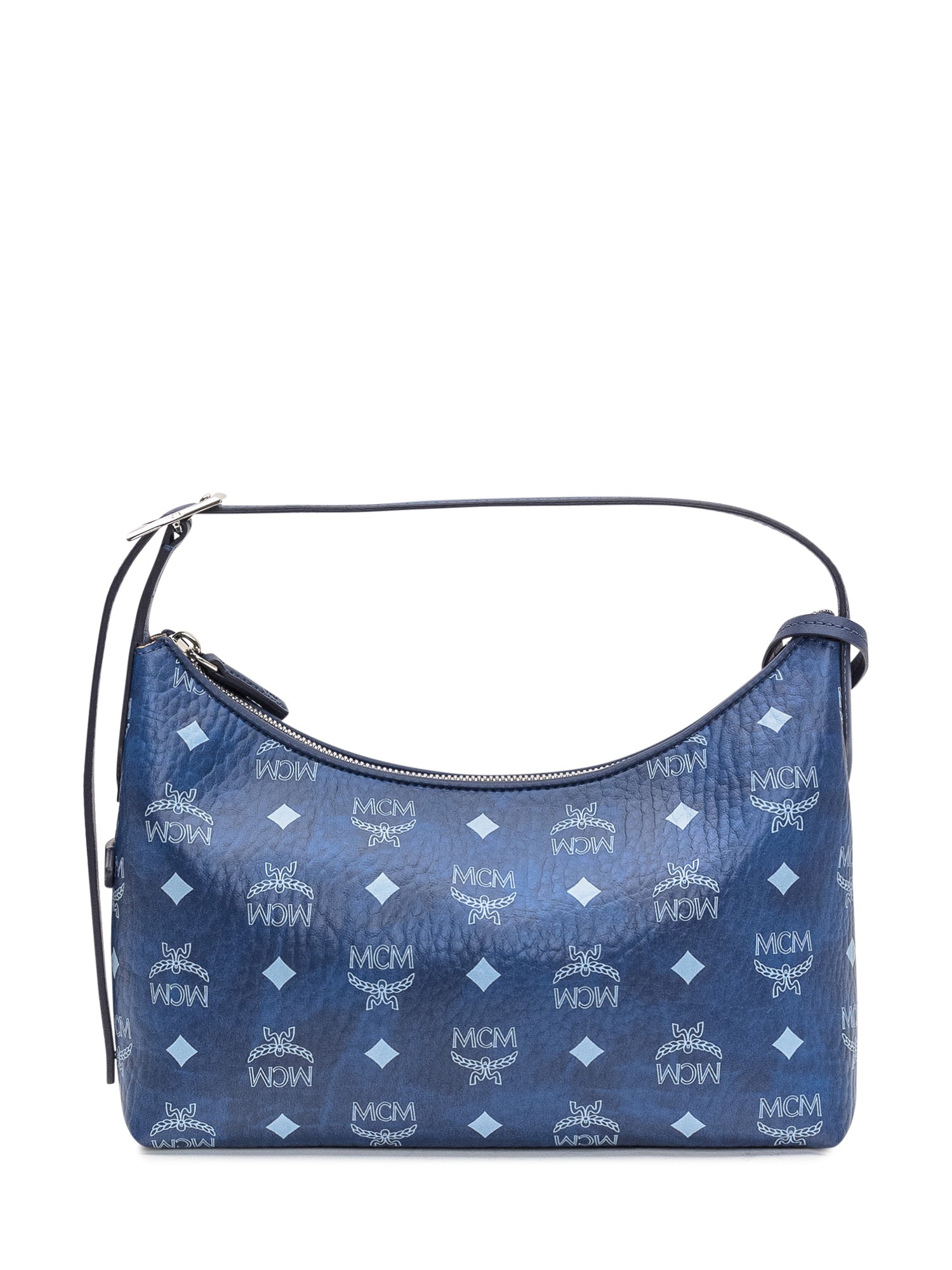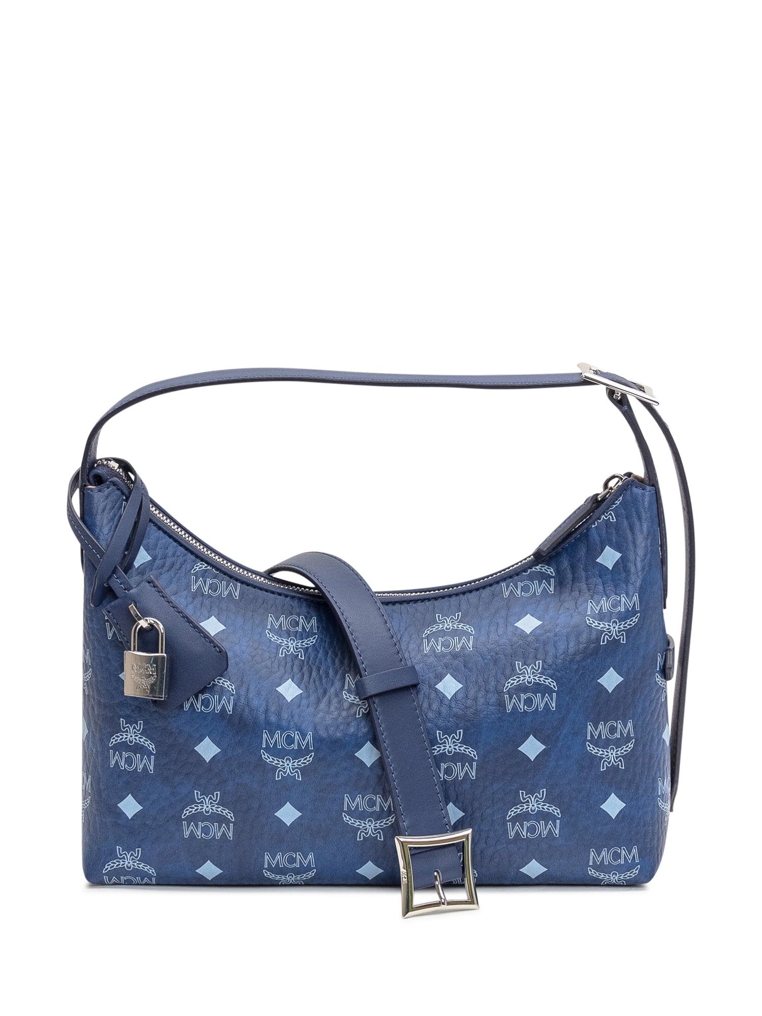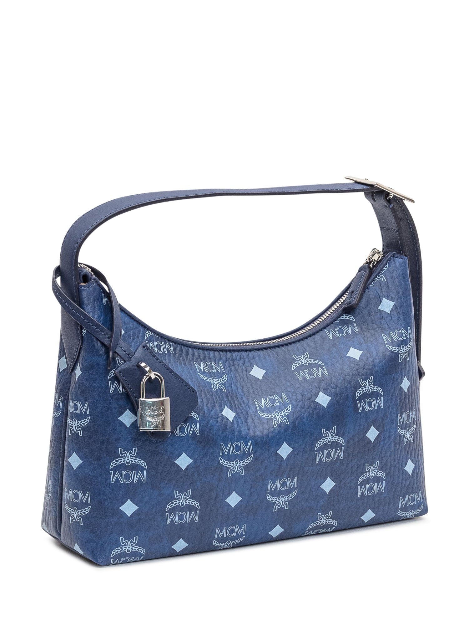 Blue MCM shoulder bag in visetos with all-over logo and silver padlock detail.