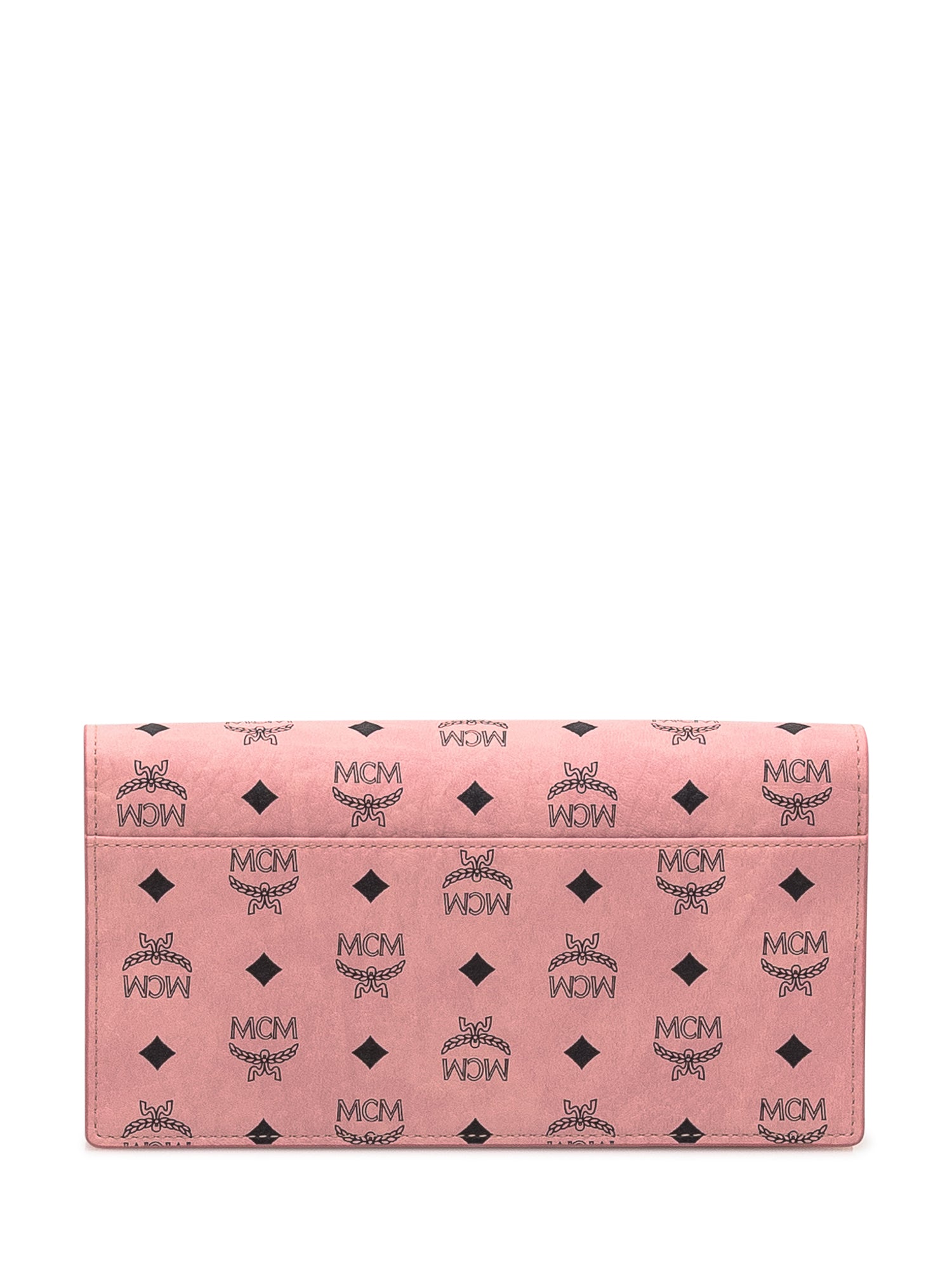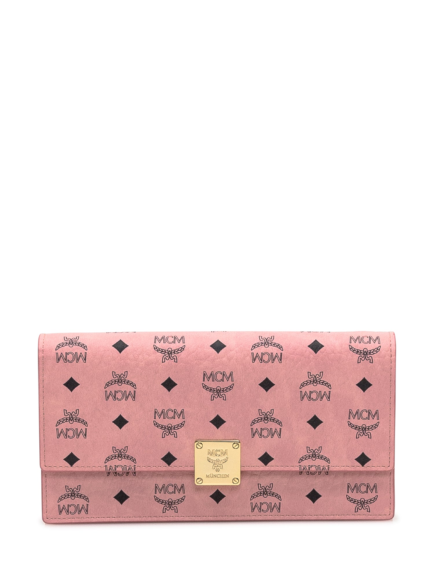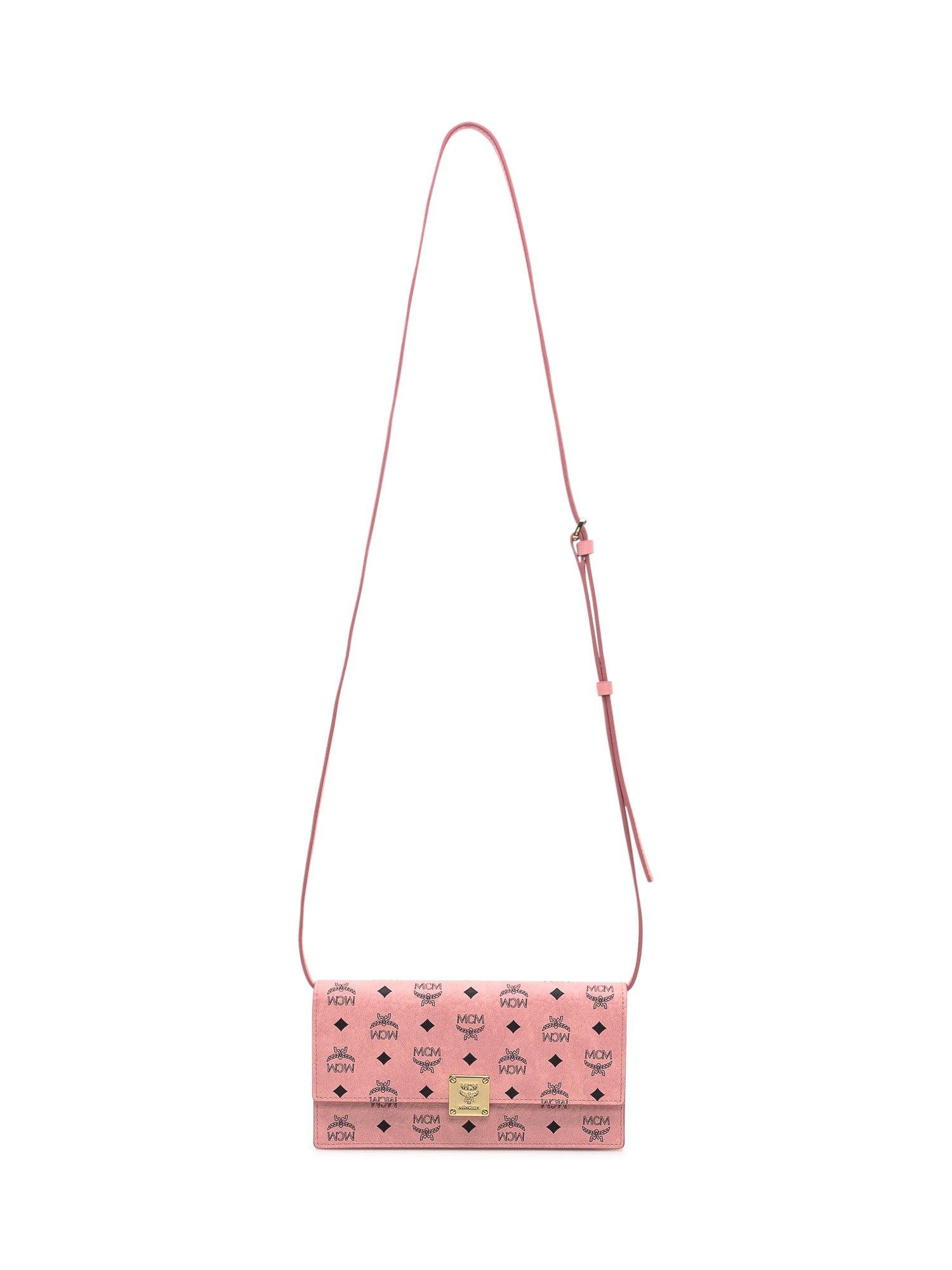 MCM Small wallet in pink Visetos canvas with gold logo plaque. Adjustable strap for crossbody wear. Features organized interior with compartments, zip pocket, and snap closure.