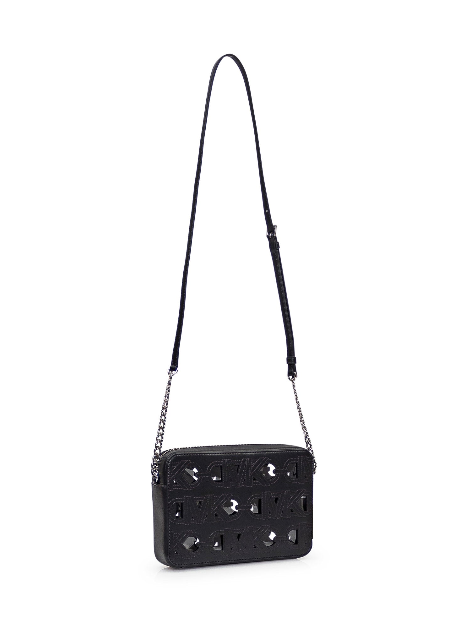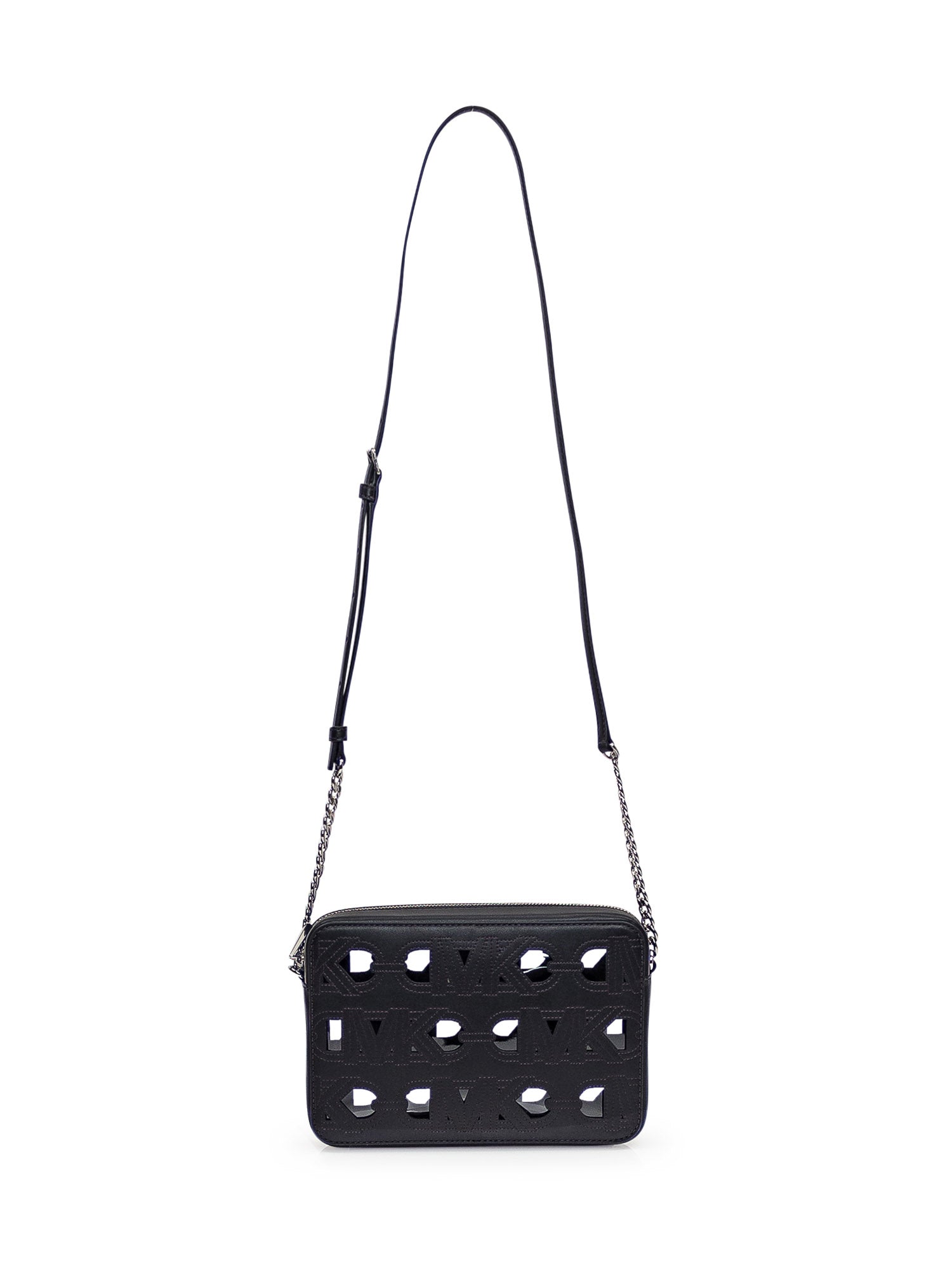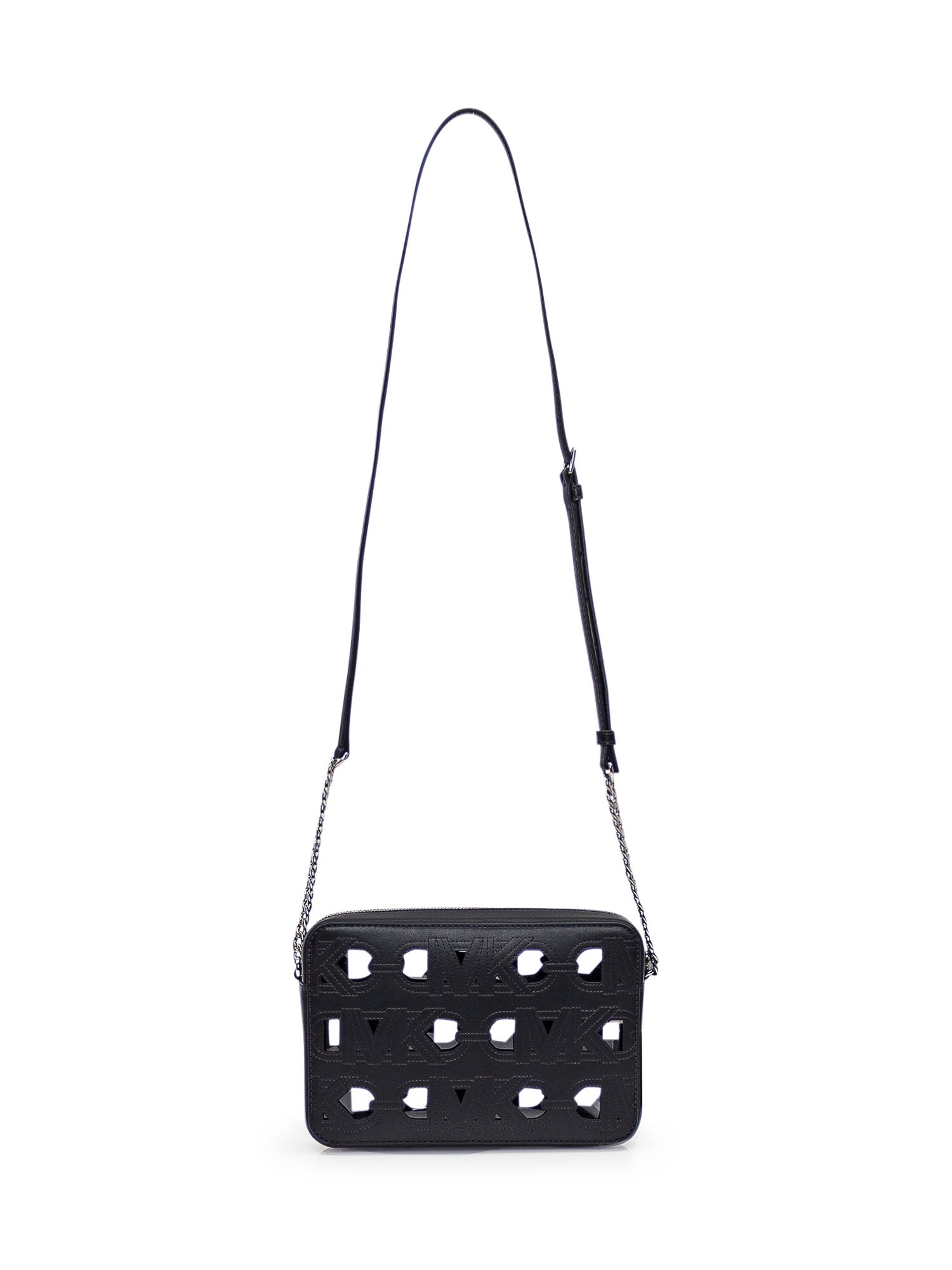Black leather shoulder bag with Plexiglas cut-out effect embroidered logo. Adjustable shoulder strap. Zipper closure.