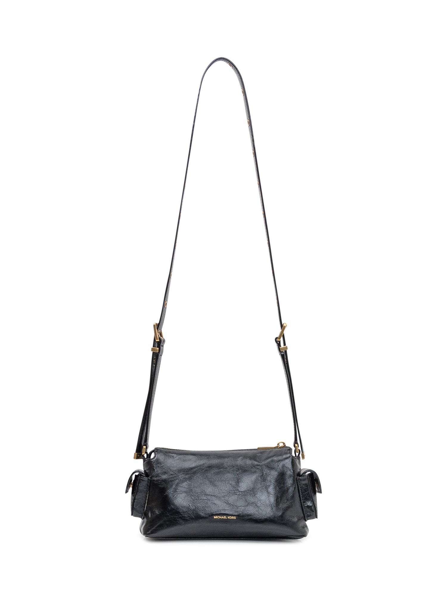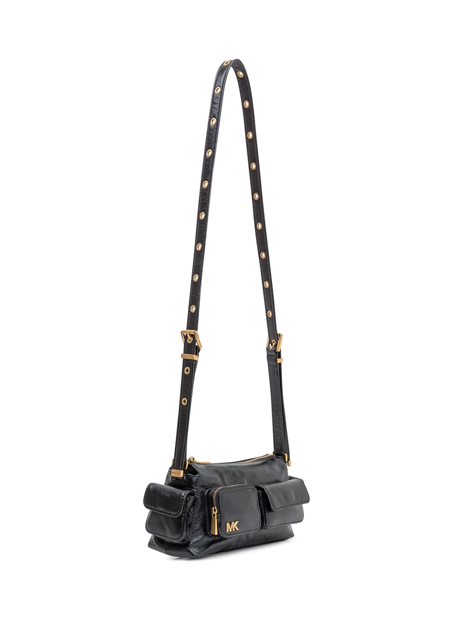 Michael Kors black leather bag with multiple front pockets and gold MK logo.