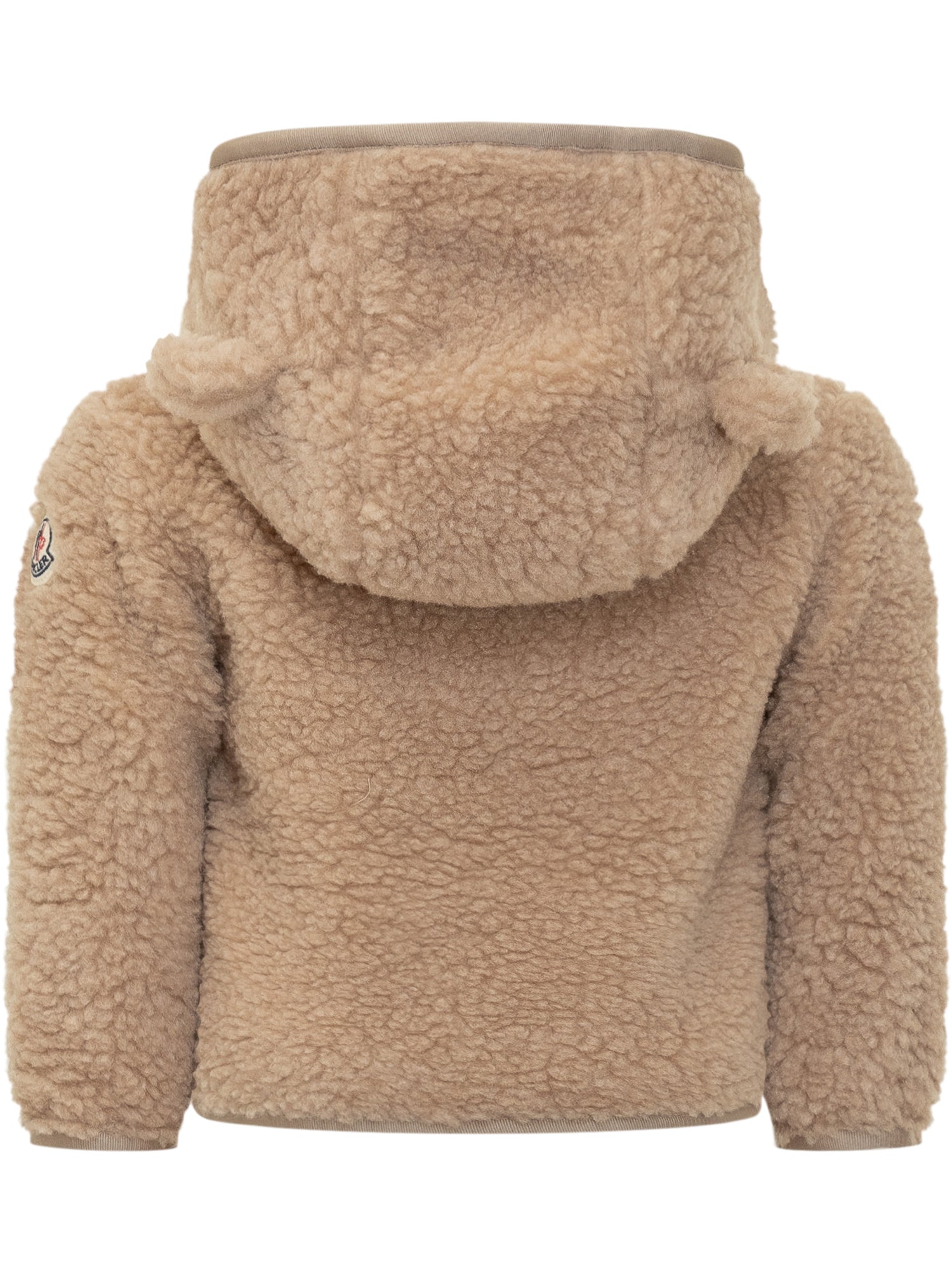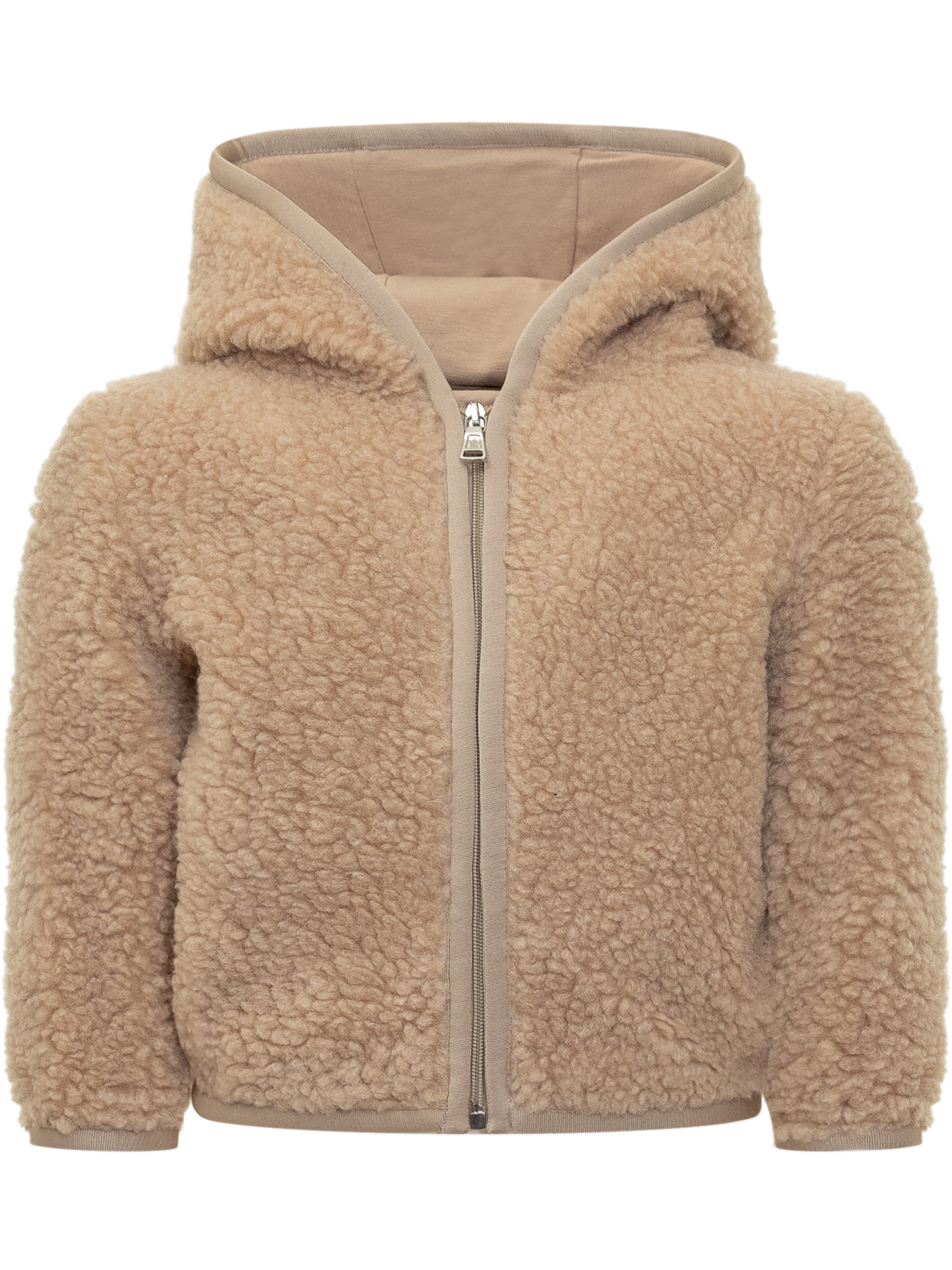 Kids zip-up cardigan in soft teddy-effect fabric, in a warm beige hue. Features a hood, front zip closure, and tone-on-tone jersey trims.