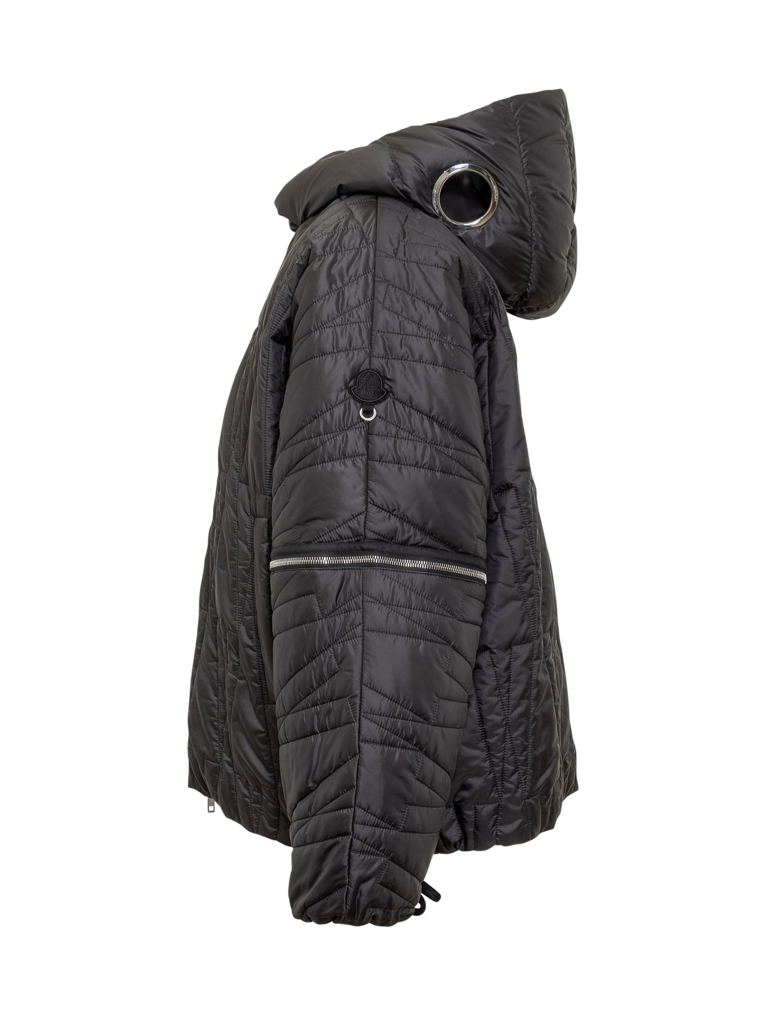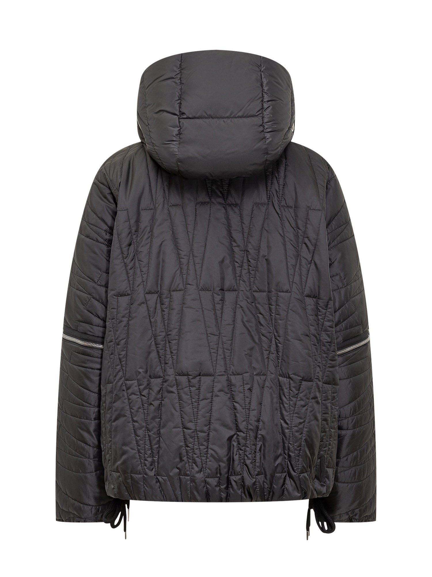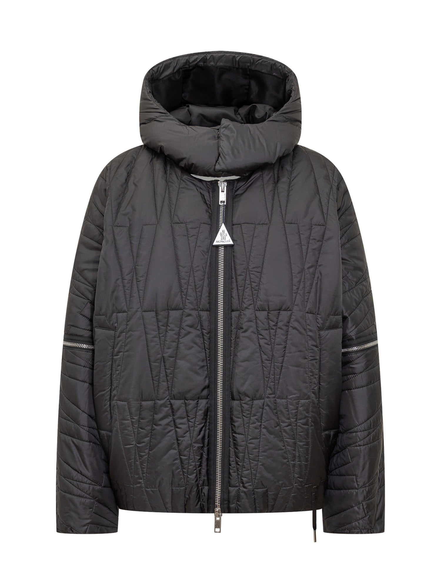 Black down jacket. Snap-button hood. Zip fastening. Logo patch on sleeve. Removable sleeves with zip.