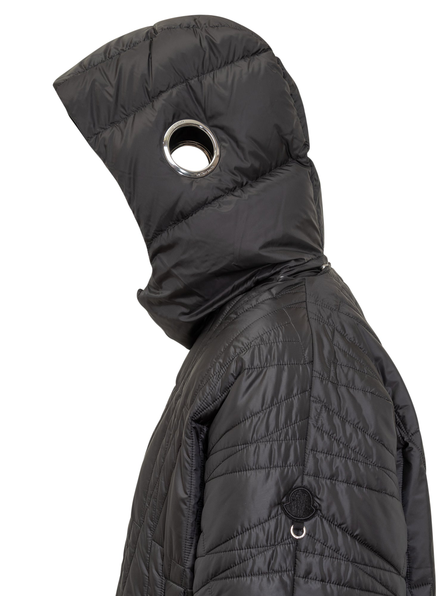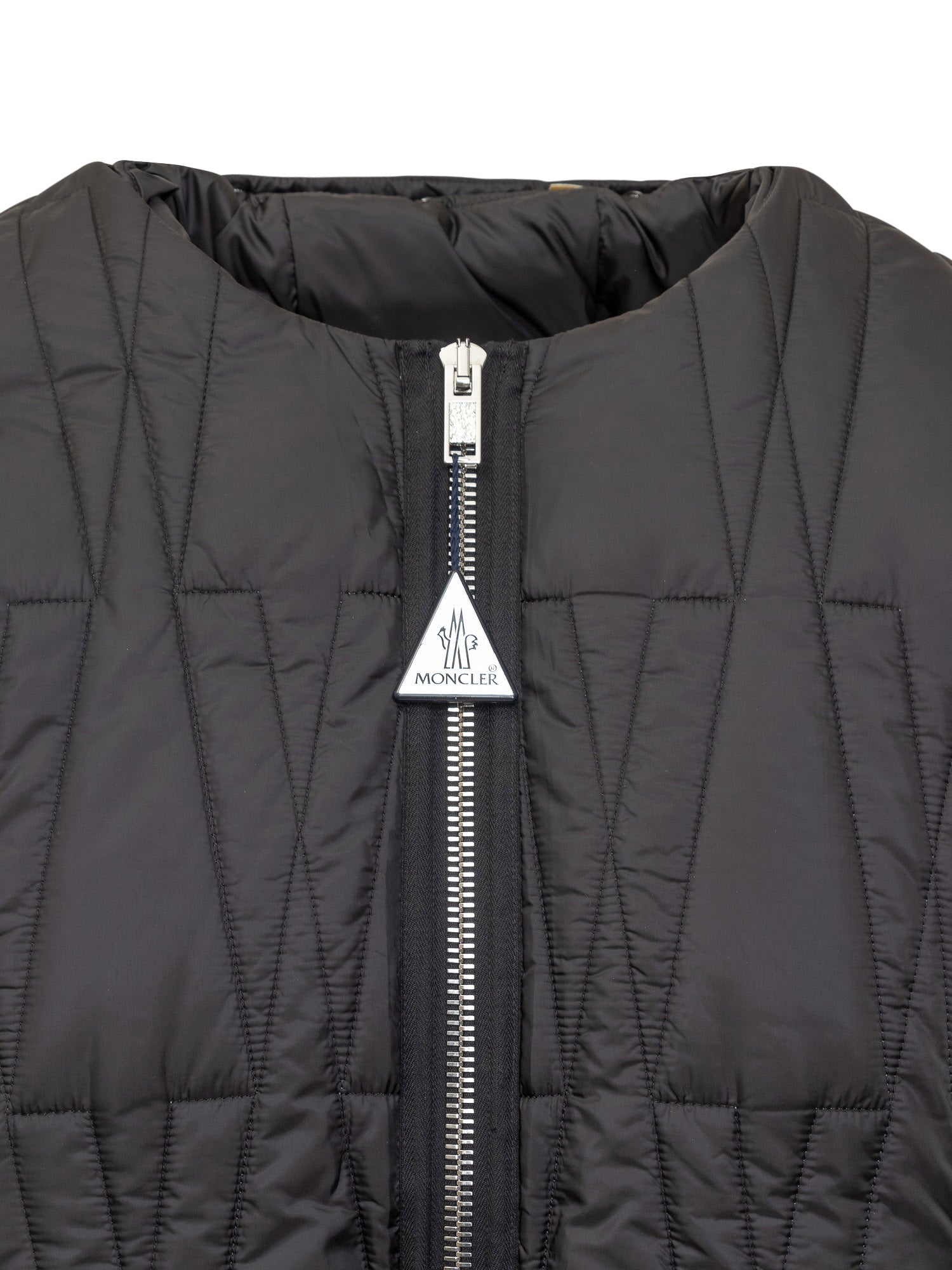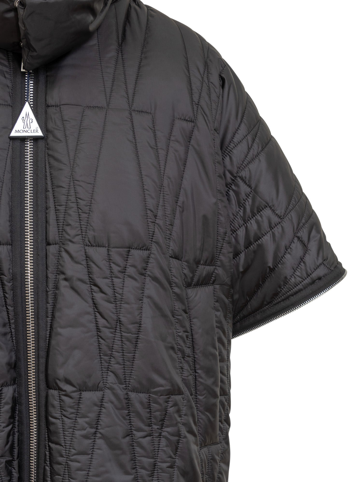 Black down jacket. Snap-button hood. Zip fastening. Logo patch on sleeve. Removable sleeves with zip.