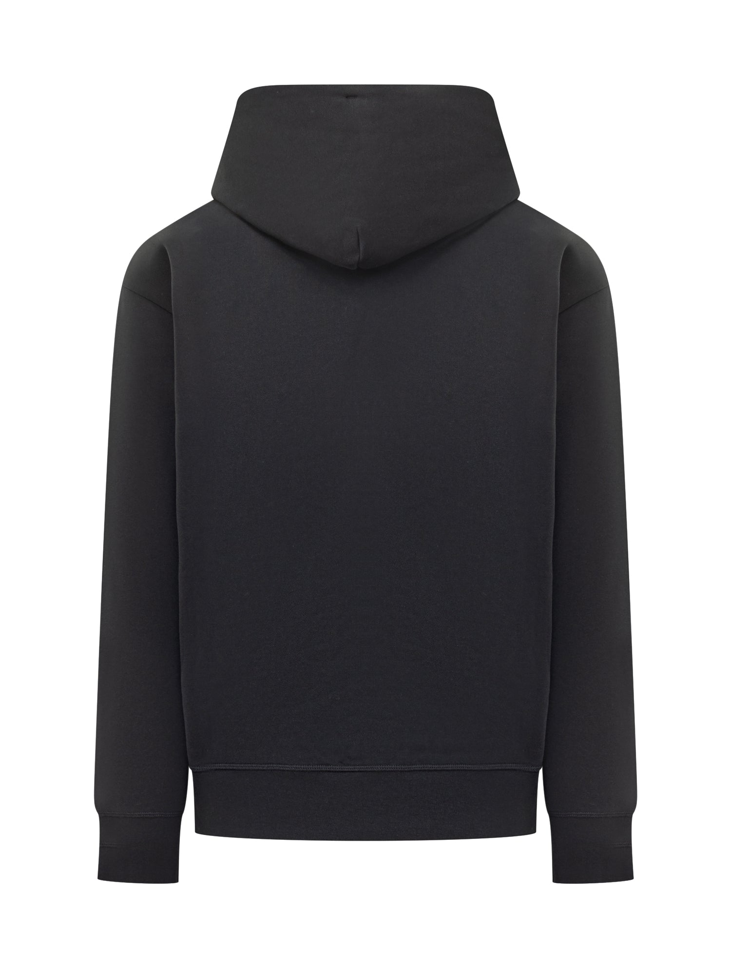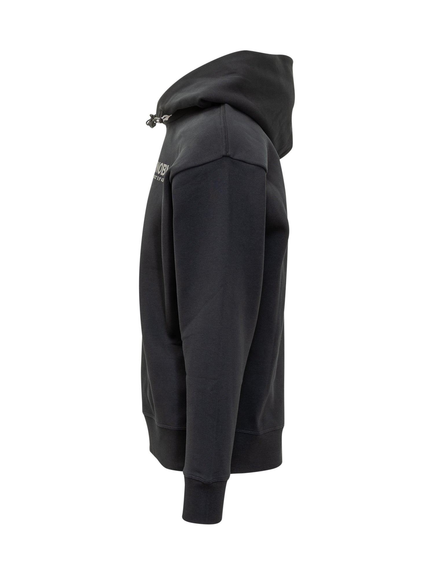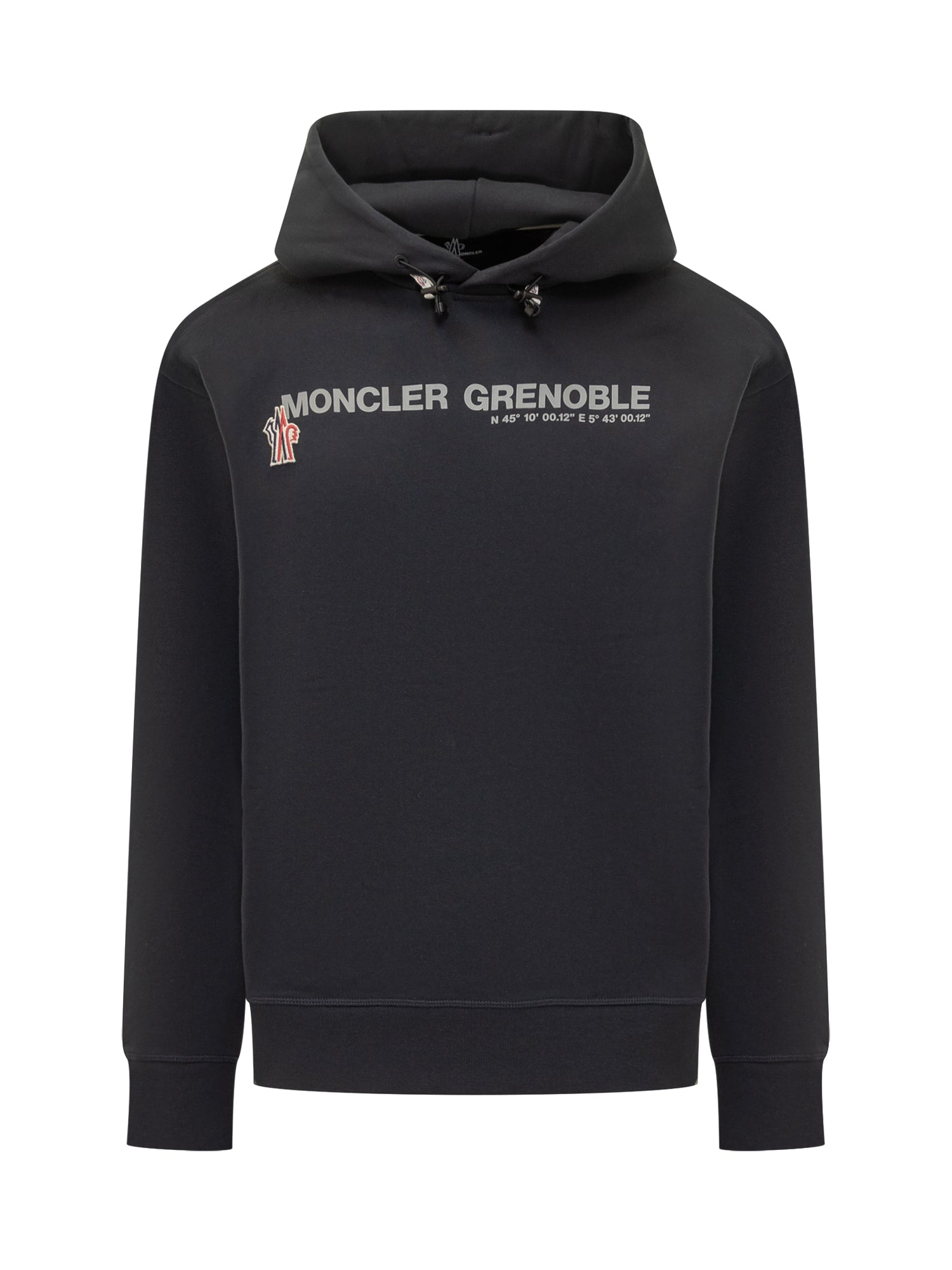 Moncler Grenoble men s blue cotton hoodie with logo and printed coordinates on the chest.