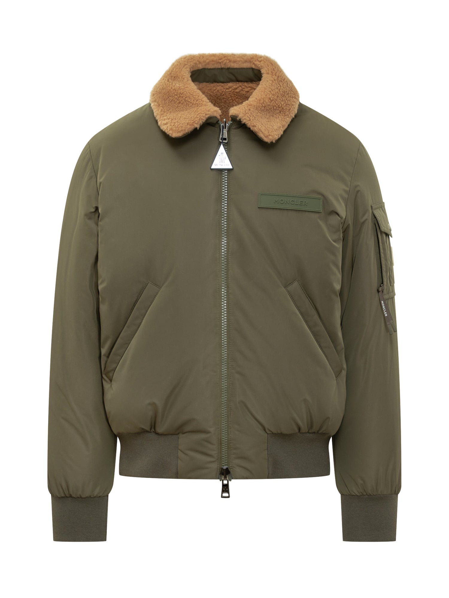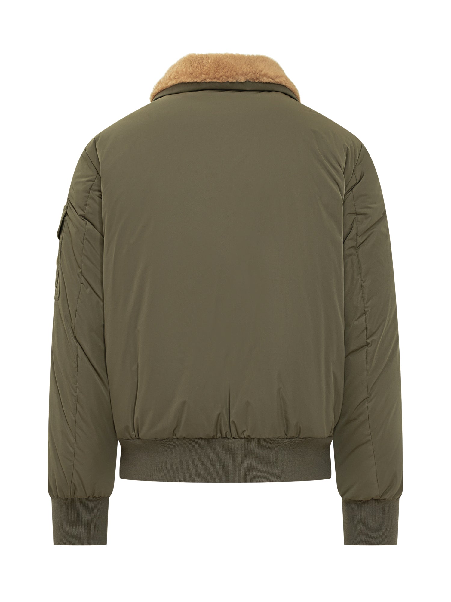 Men's bomber jacket in green polyester with a polyester-wool blend lining and faux shearling collar. Two-way zipper, angled pockets and sleeve pocket.
