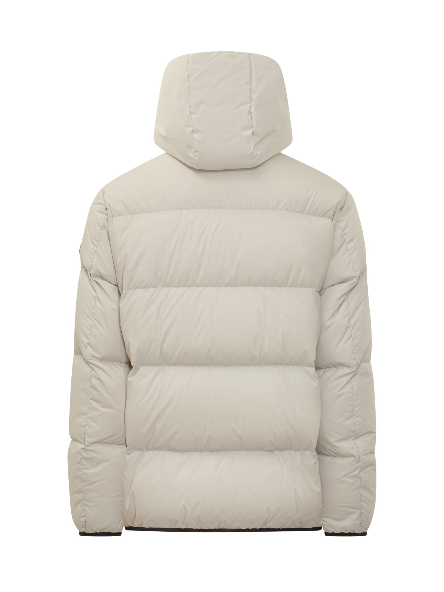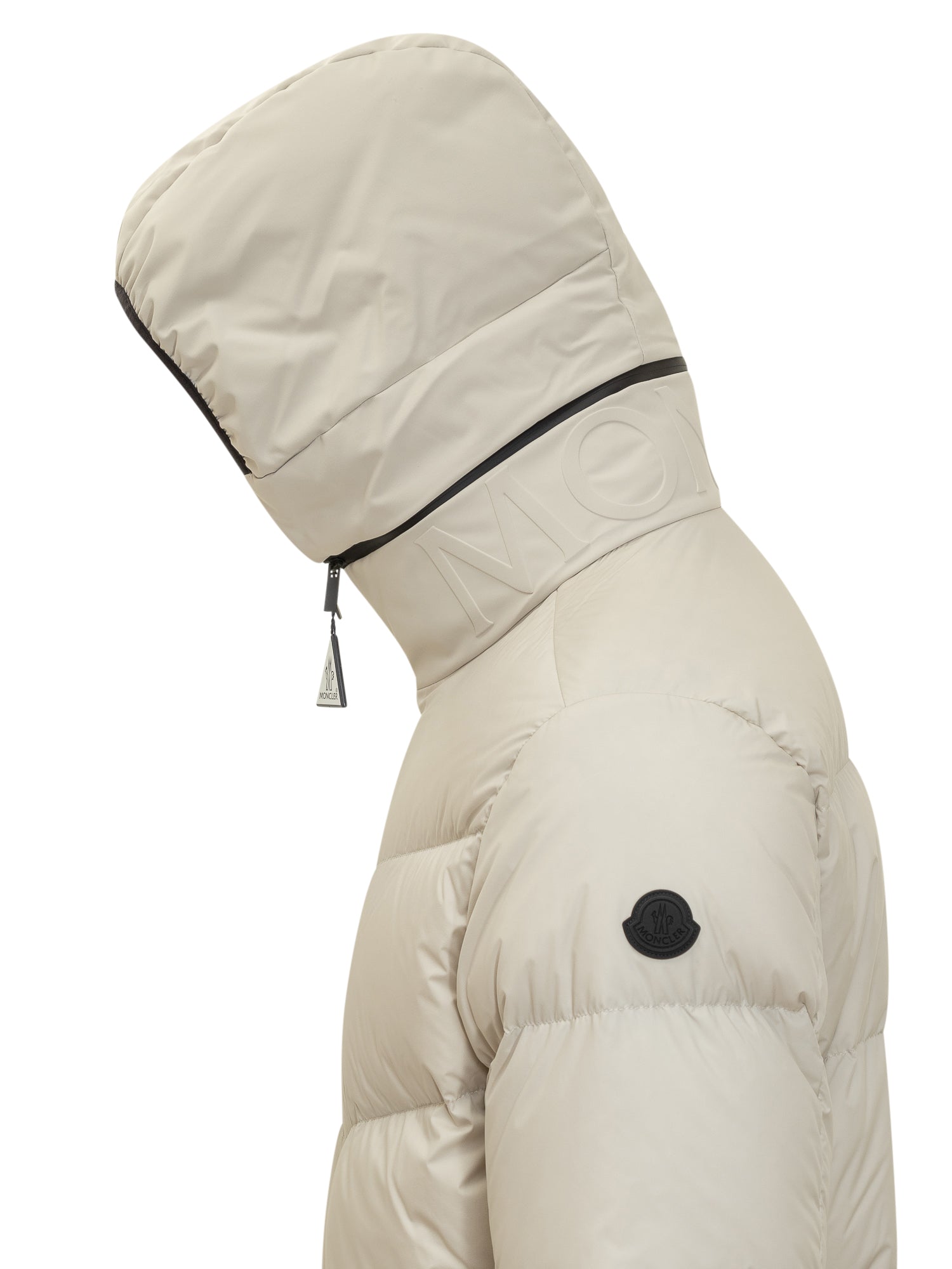Moncler Forez beige down jacket with feather filling and fixed hood. Sleek design, front zip, and modern cut.