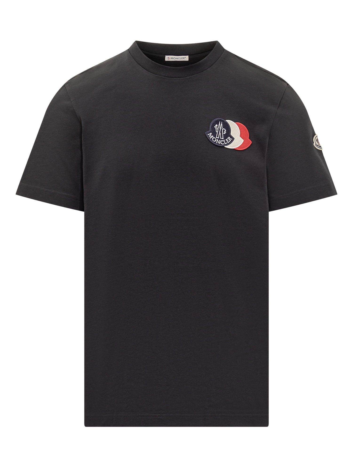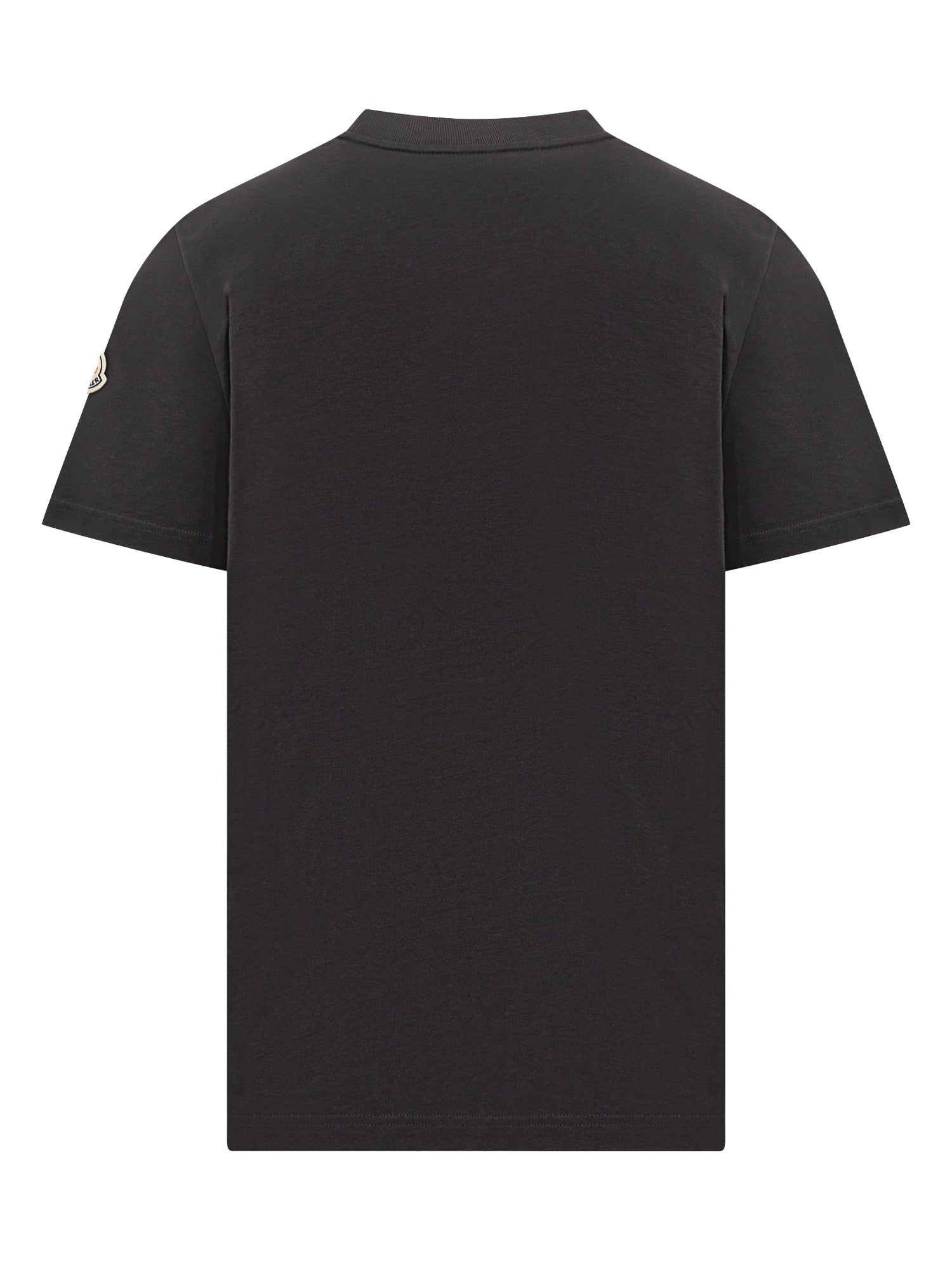 Black cotton T-shirt with Moncler tricolor logo patch on the chest. Regular fit, perfect for a casual look with signature flair.