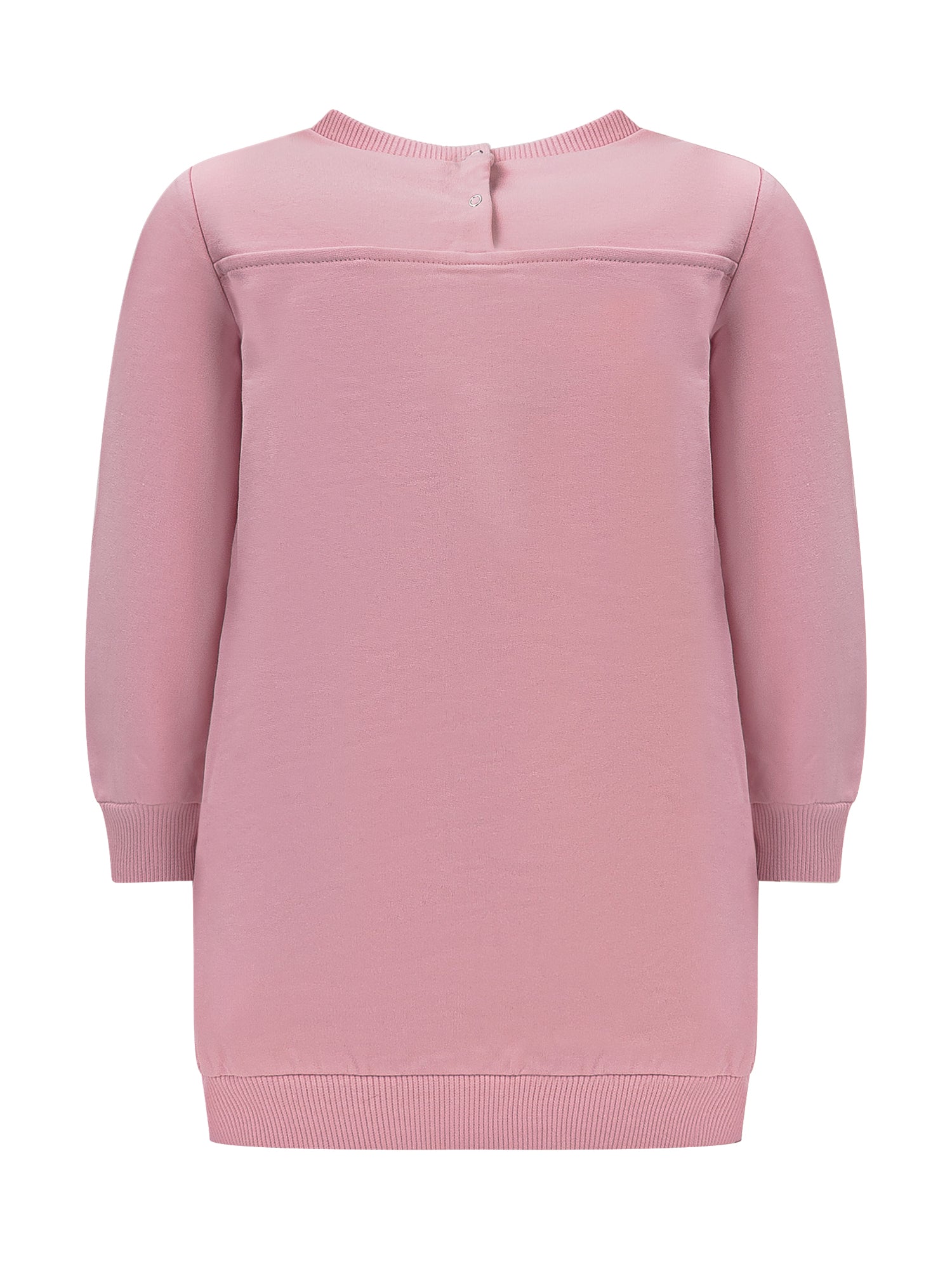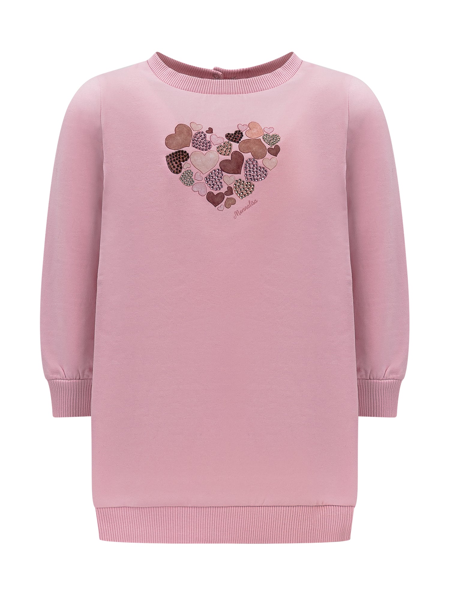 Long-sleeved midi dress. Crew neck. Back button closure. Ribbed hems. Hearts patch with rhinestones and embroidered logo on front.