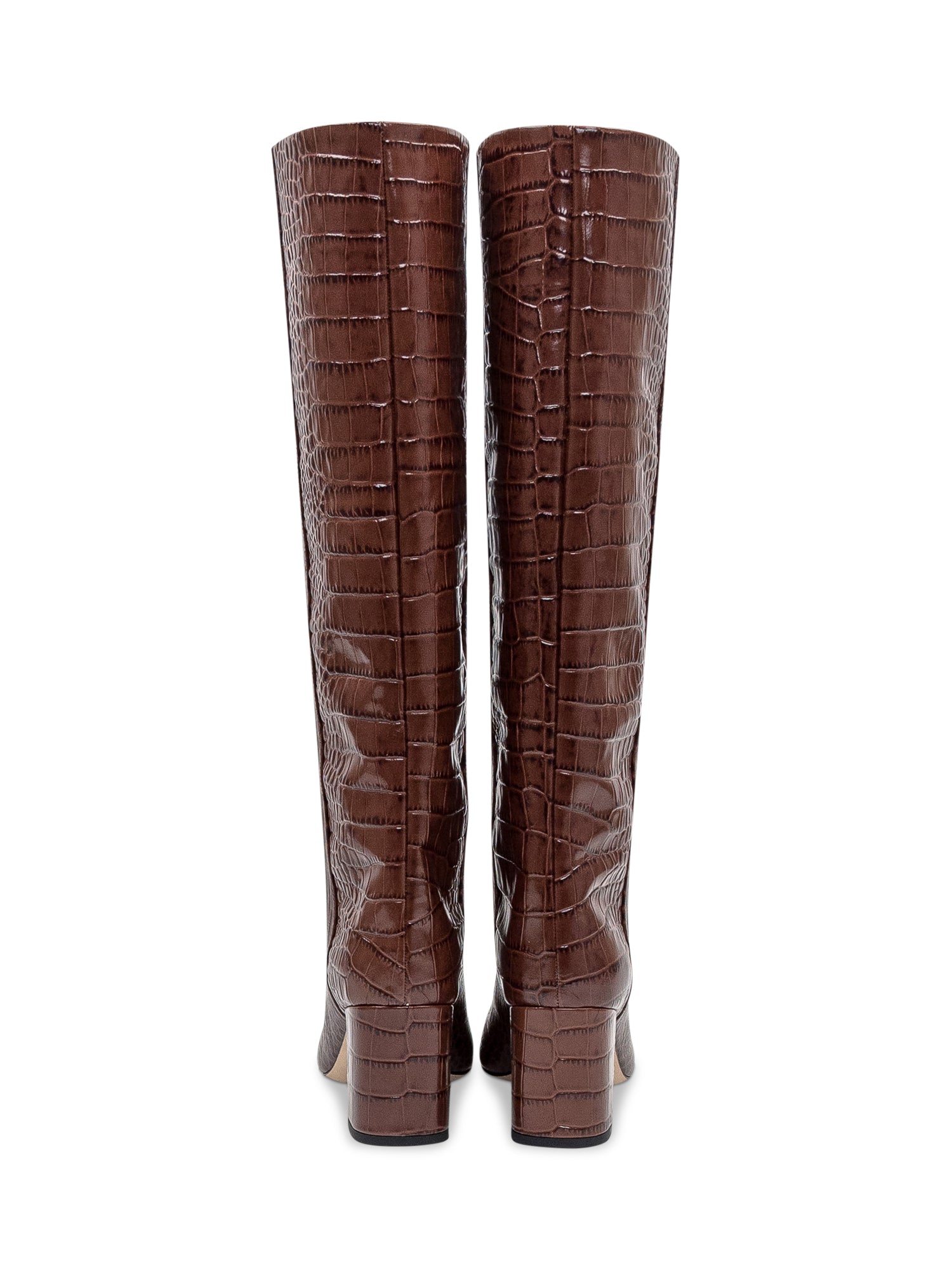 Brown calf leather boot. Glossy effect. Printed crocodile gioffrato. Square heel. Pointed toe. Branded insole.