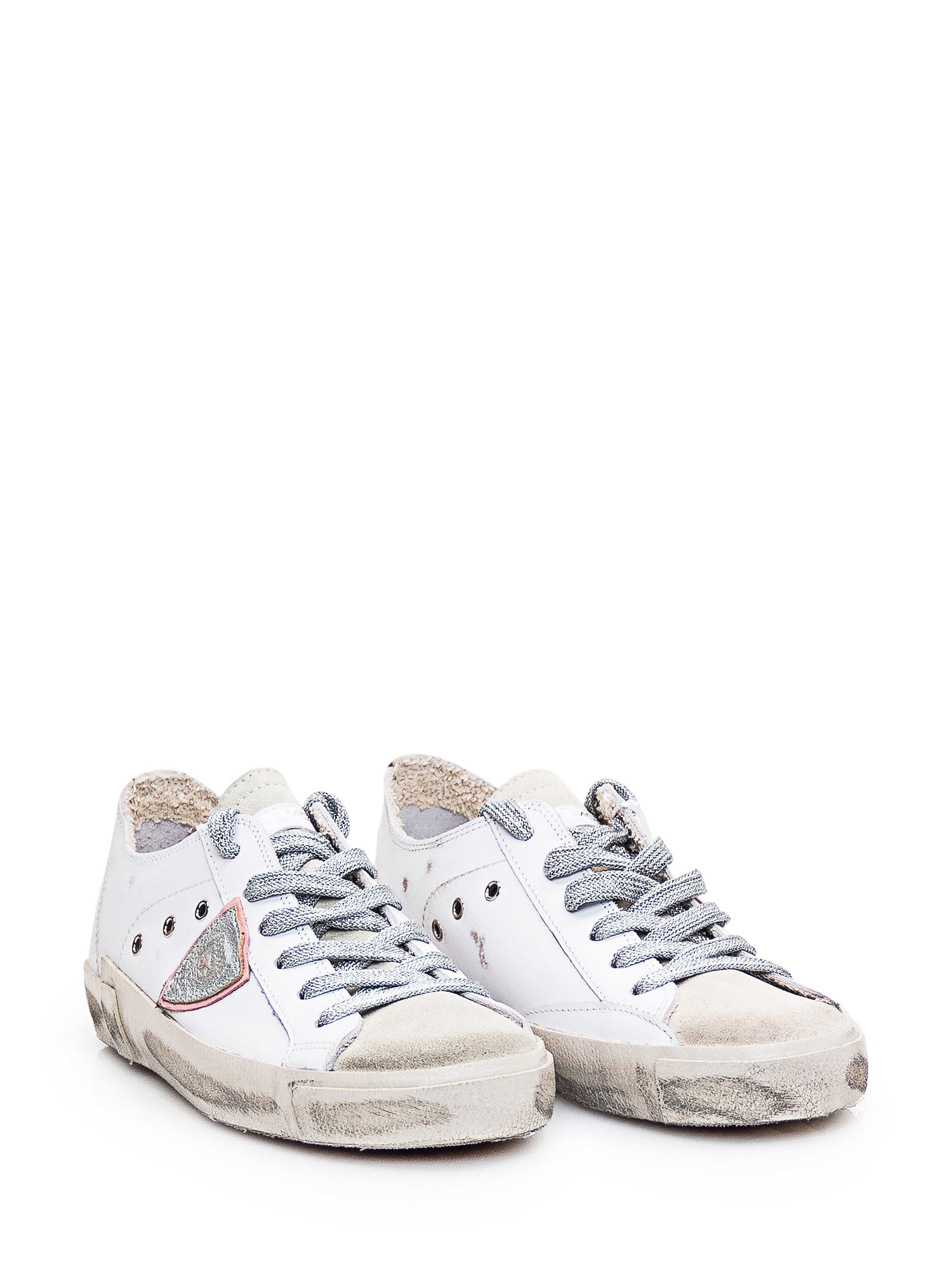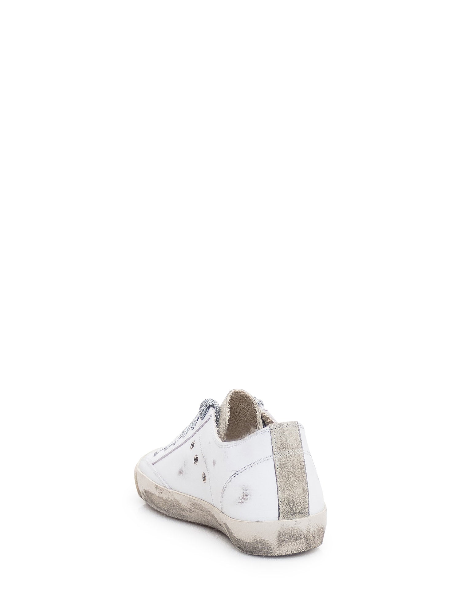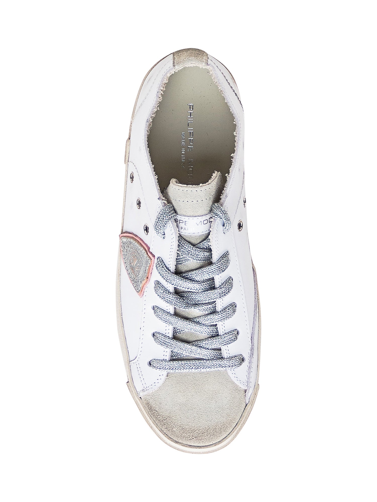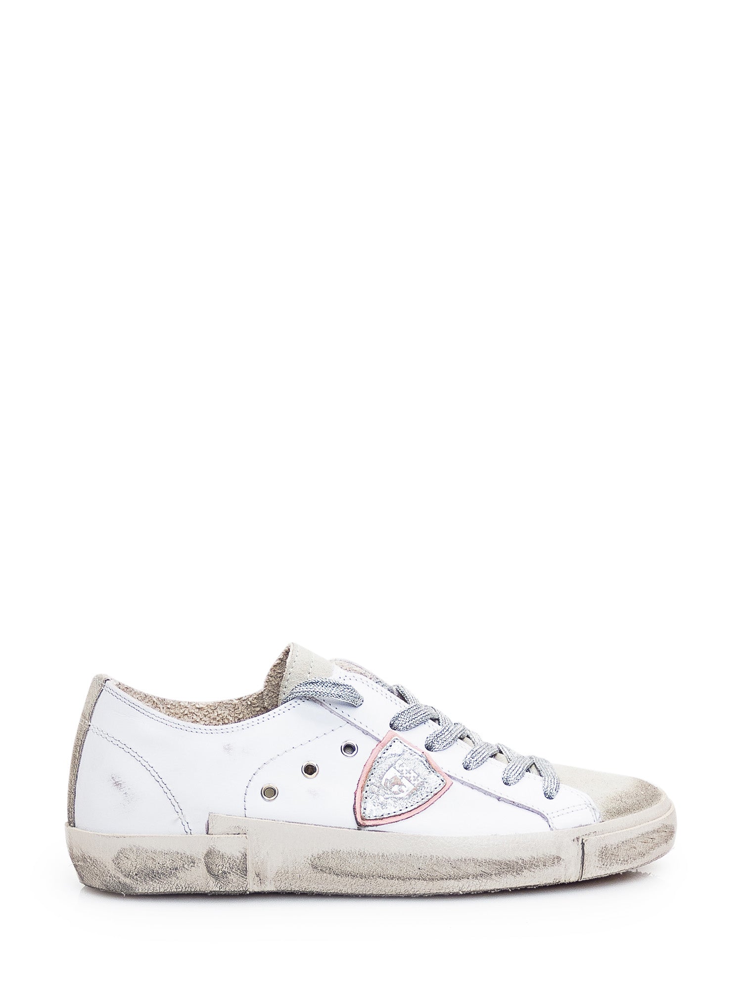 White sneaker in leather with worn effect. Tongue and toe in suede. Closure with laces with metallic fiber. Logo patch on the tongue. Silver shield detail on the side.