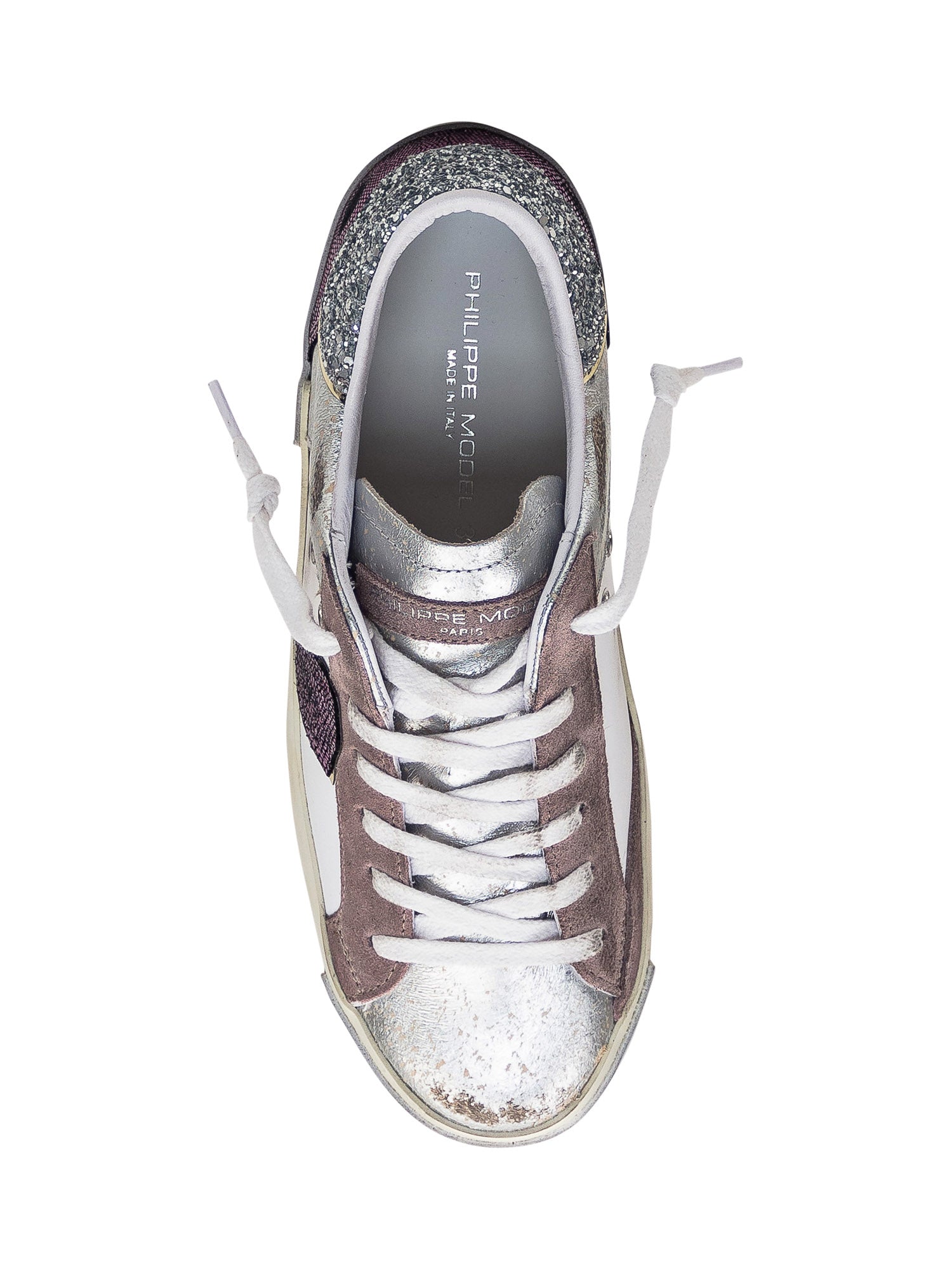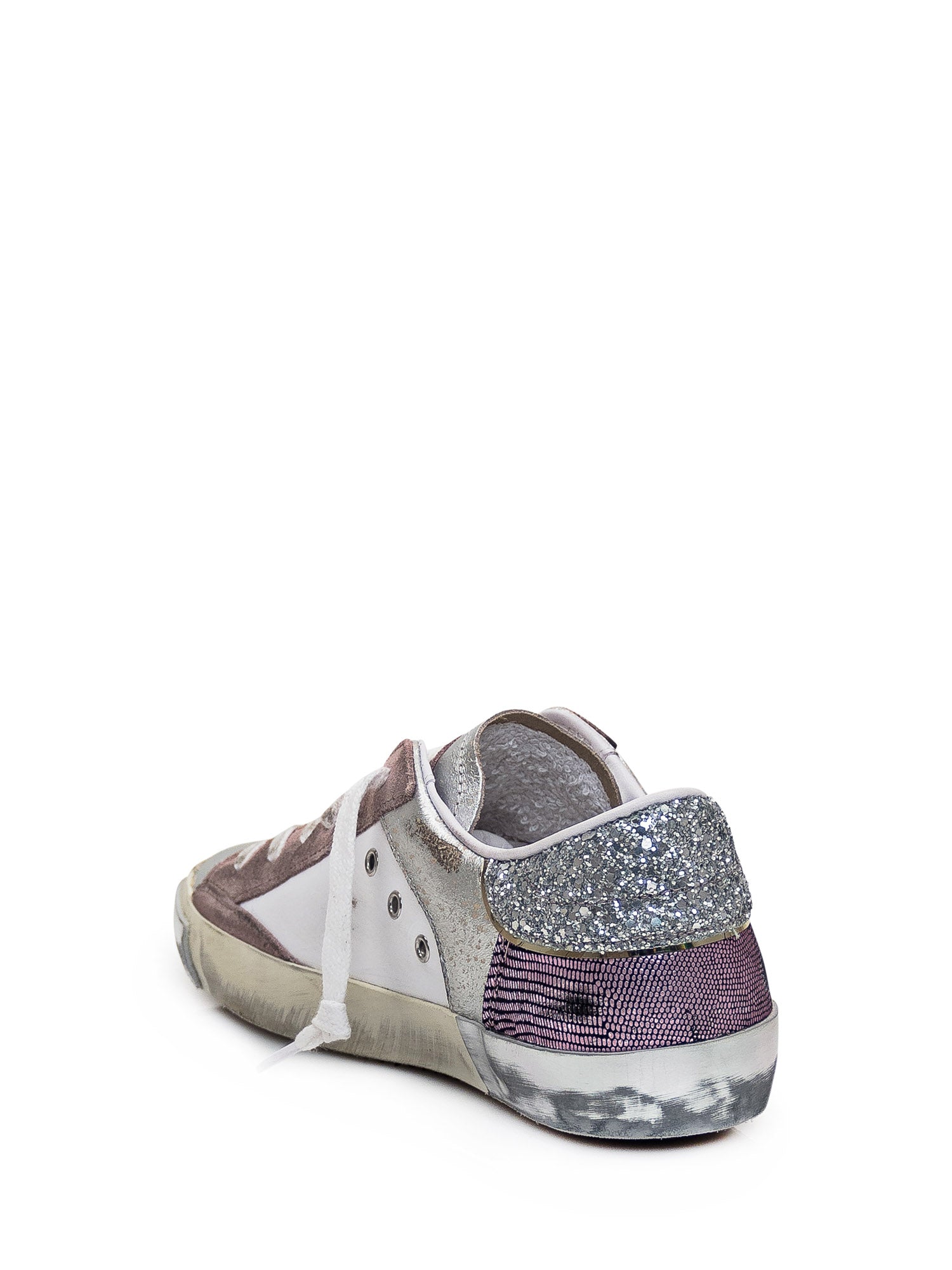 Low-top sneaker. Lace-up closure. Suede leather inserts. Heel with glitter. Scudetto patch with glitter on side. Logo on tongue.