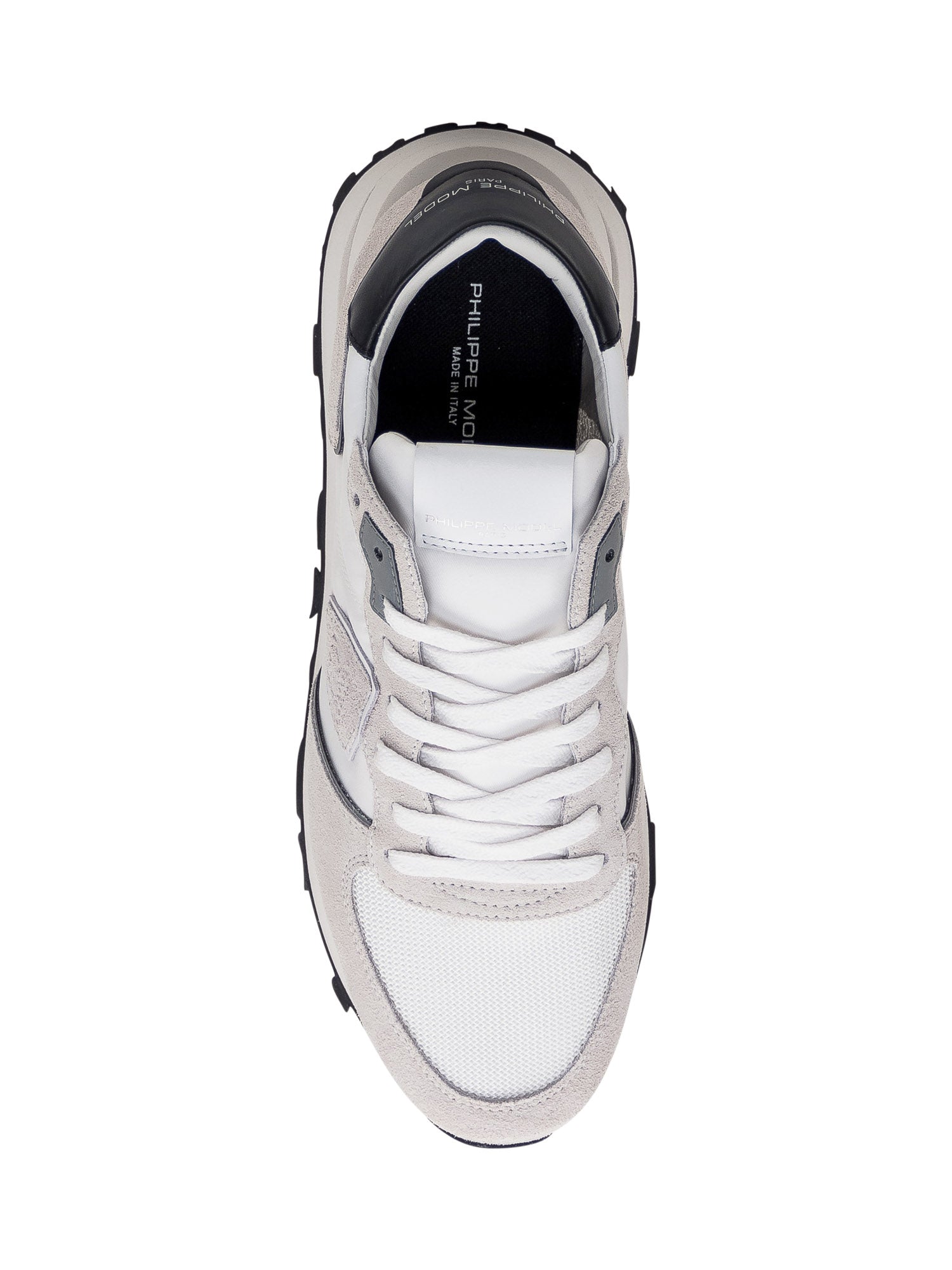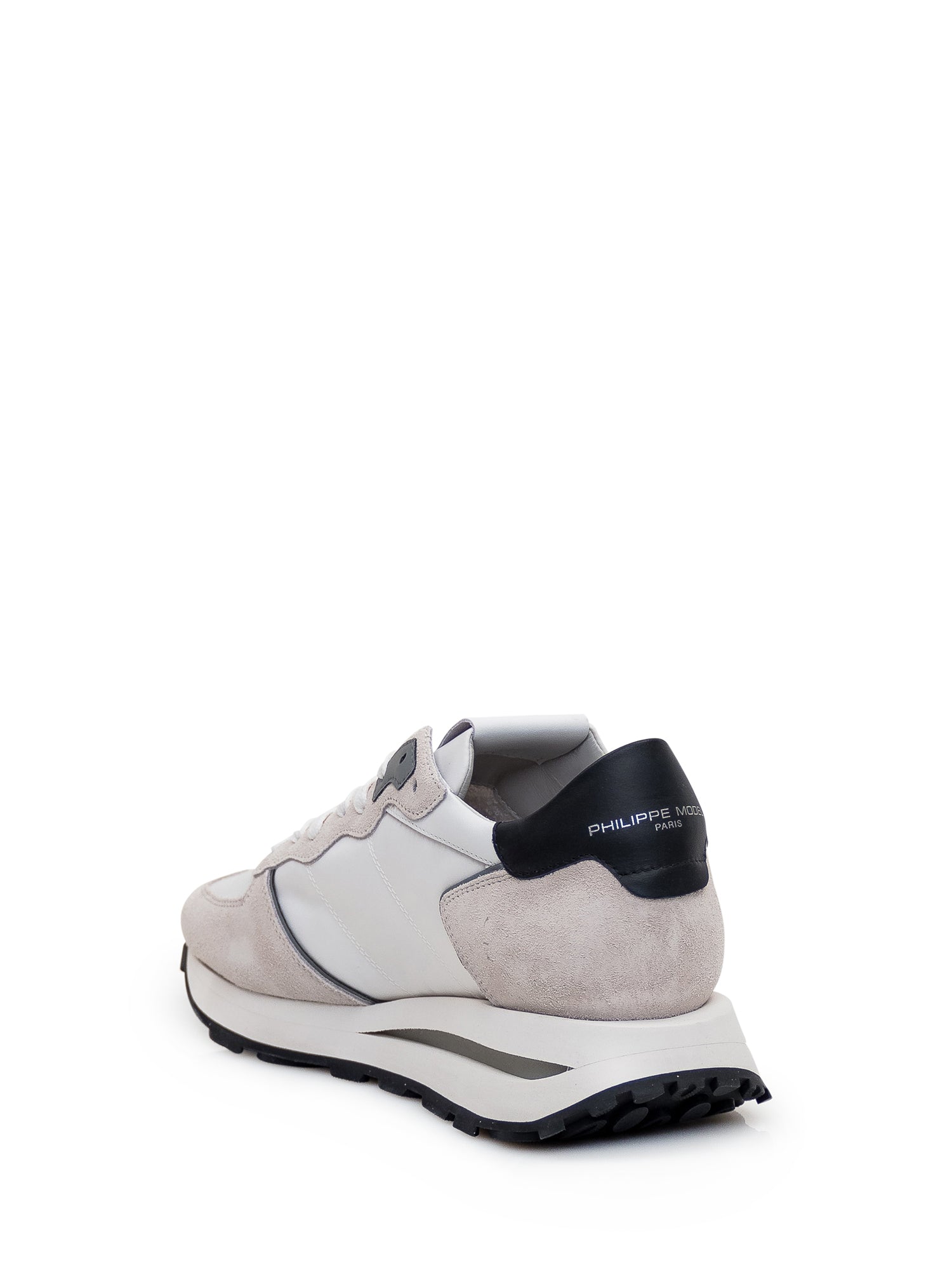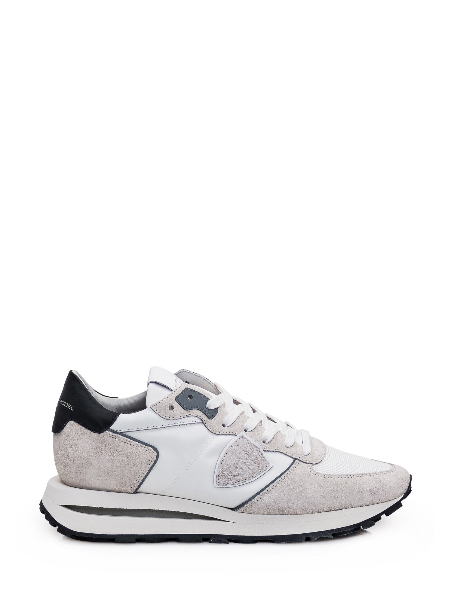 Low white sneaker. Lace-up closure. Suede leather inserts. Logo patch on side. Logo on tongue and heel.