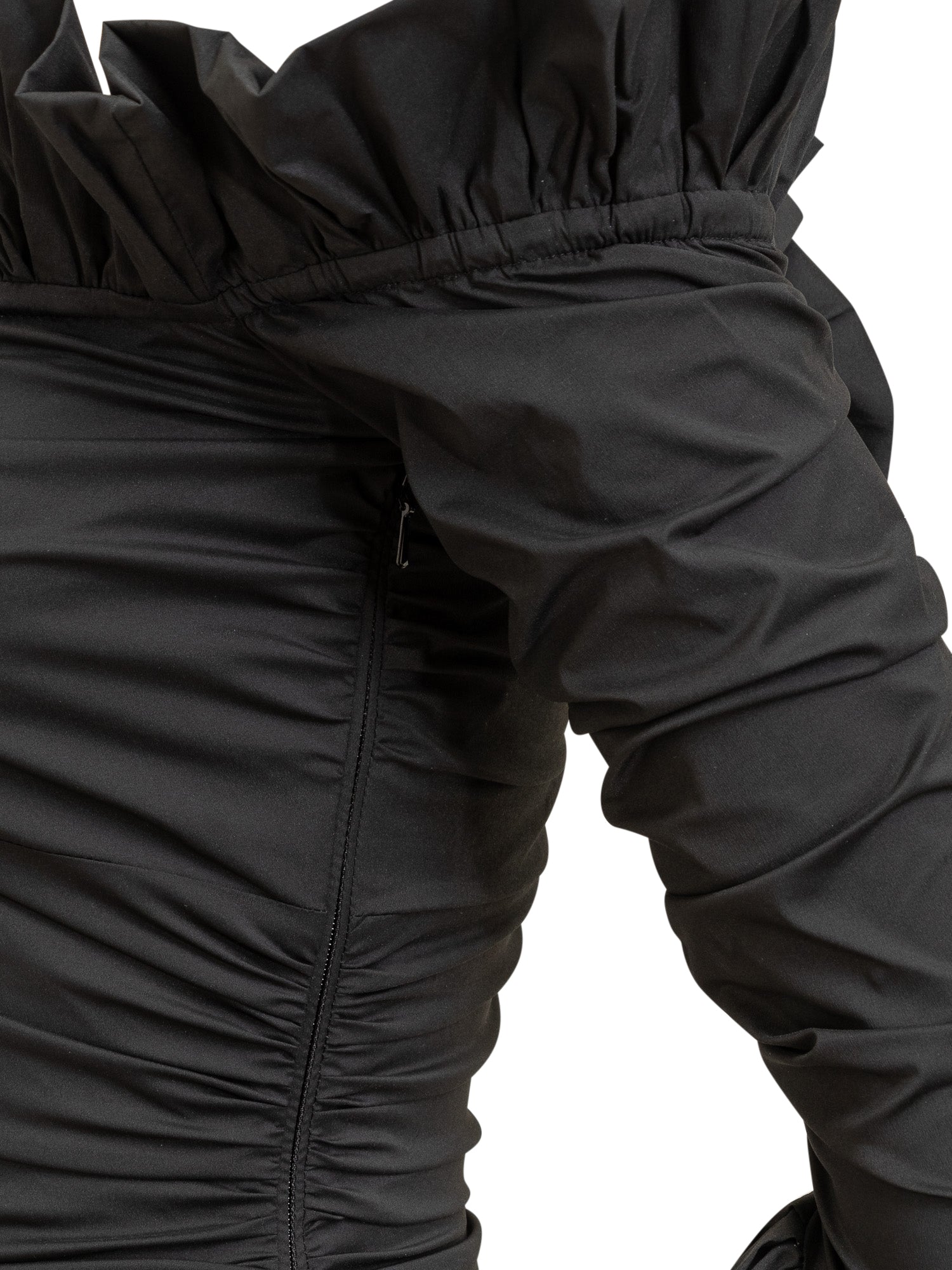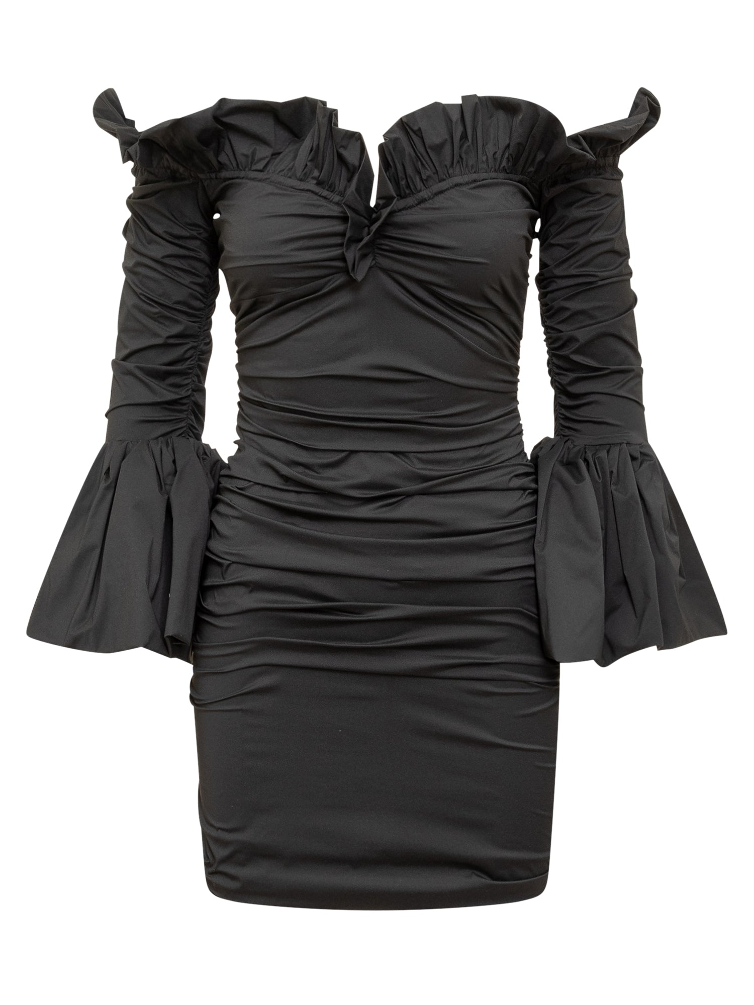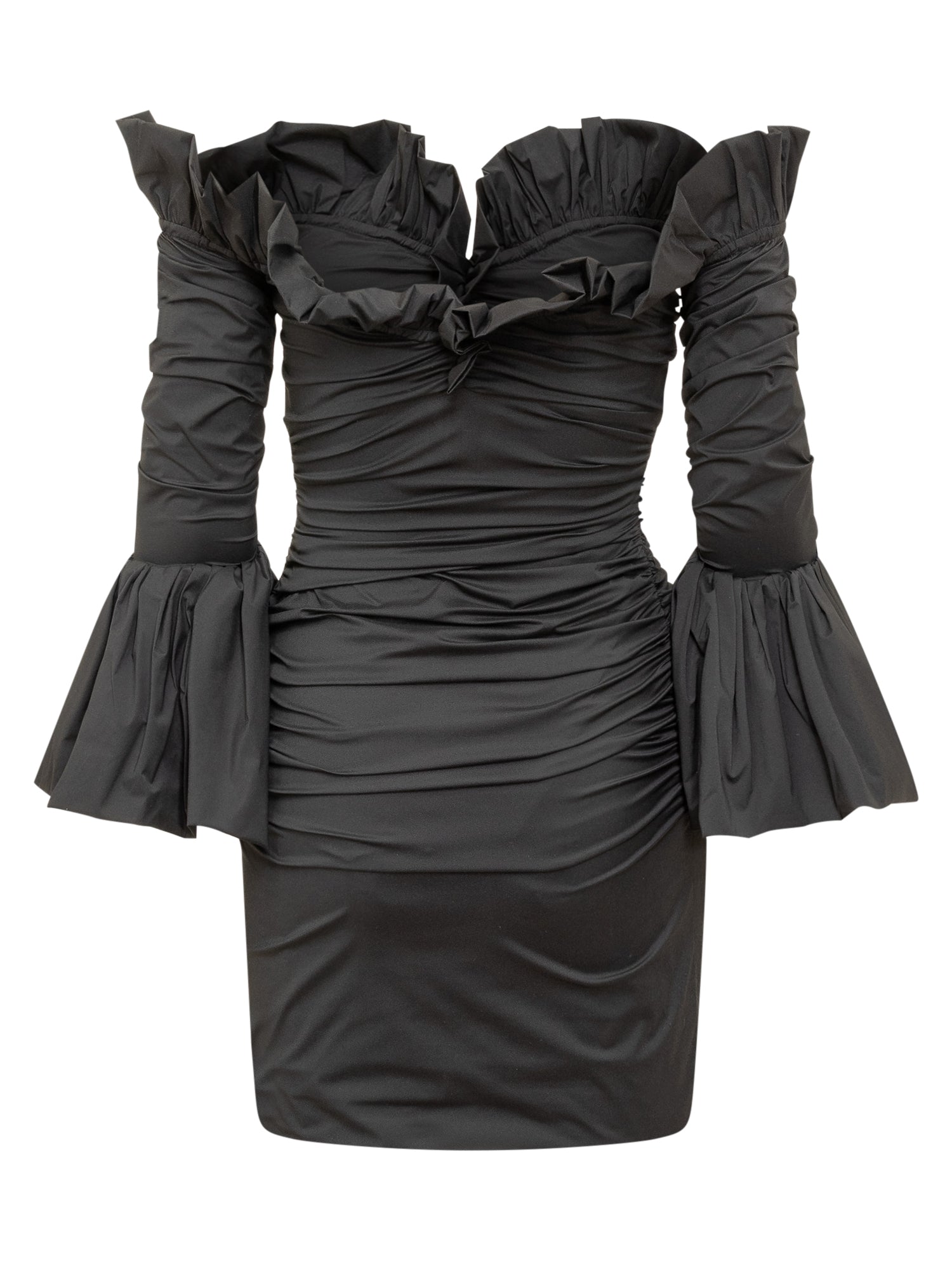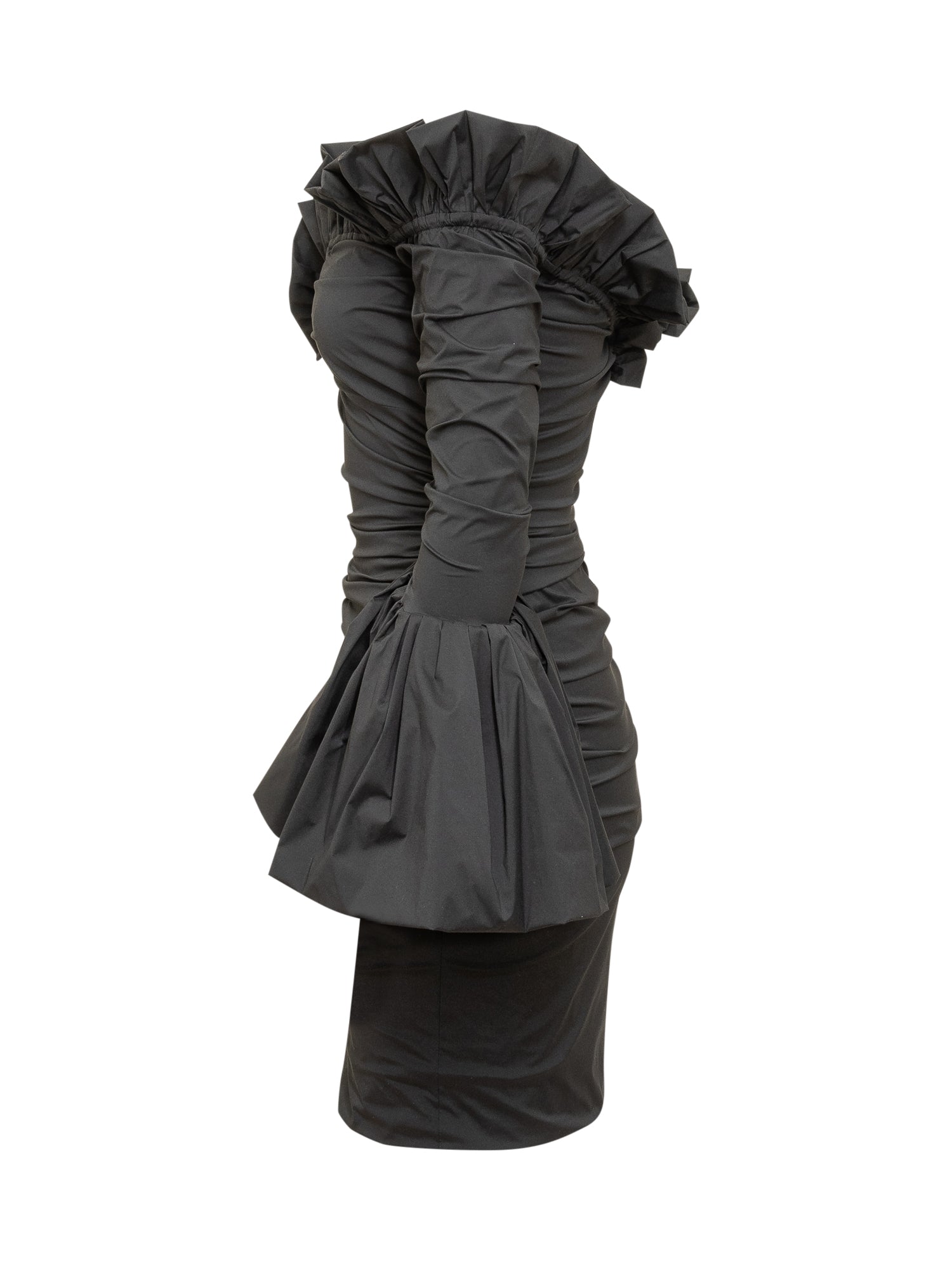 Midi off-shoulder dress. Side zip closure. Stretch taffeta drapes. Fitted fit. Ruche applied all-over.