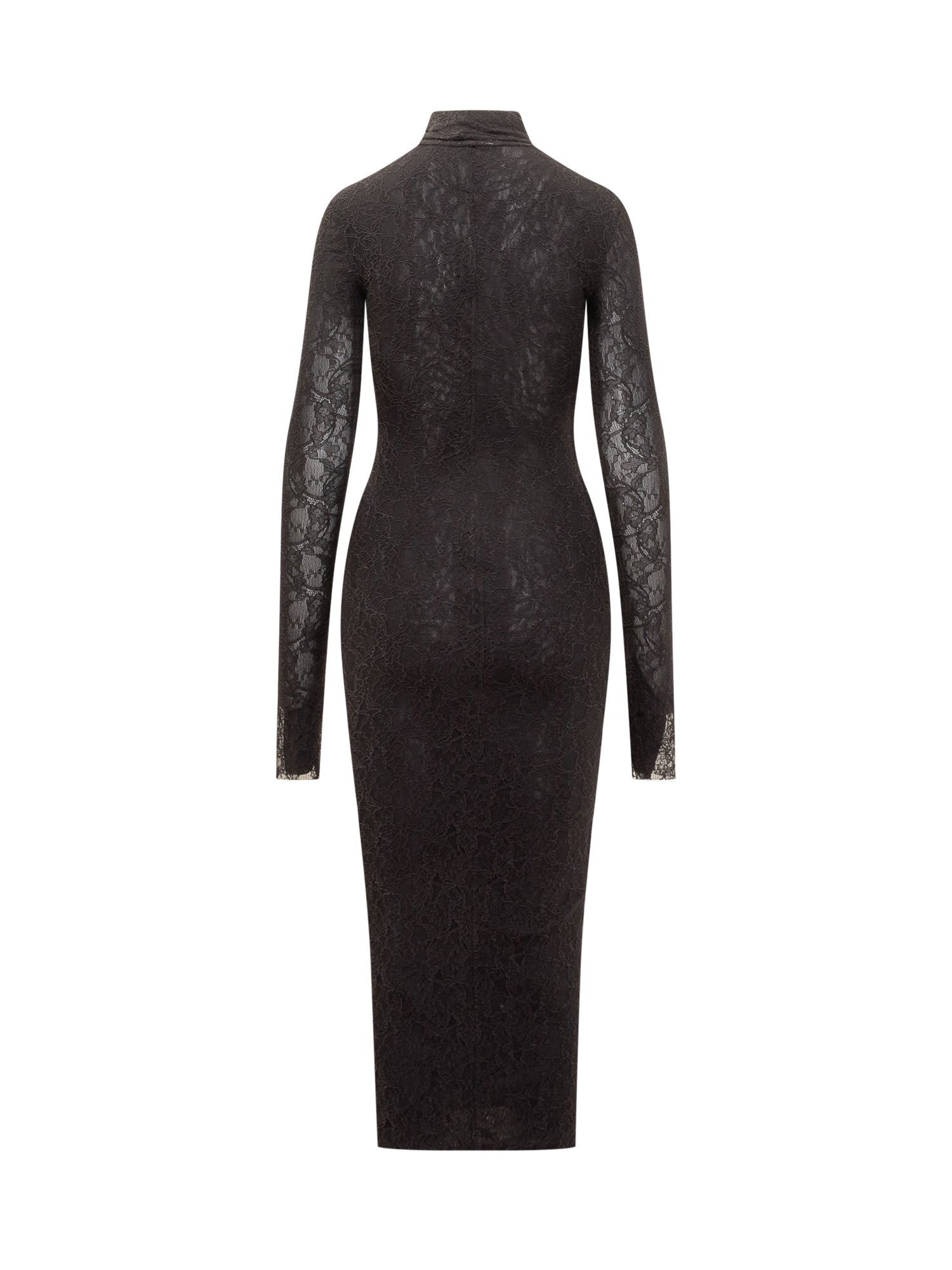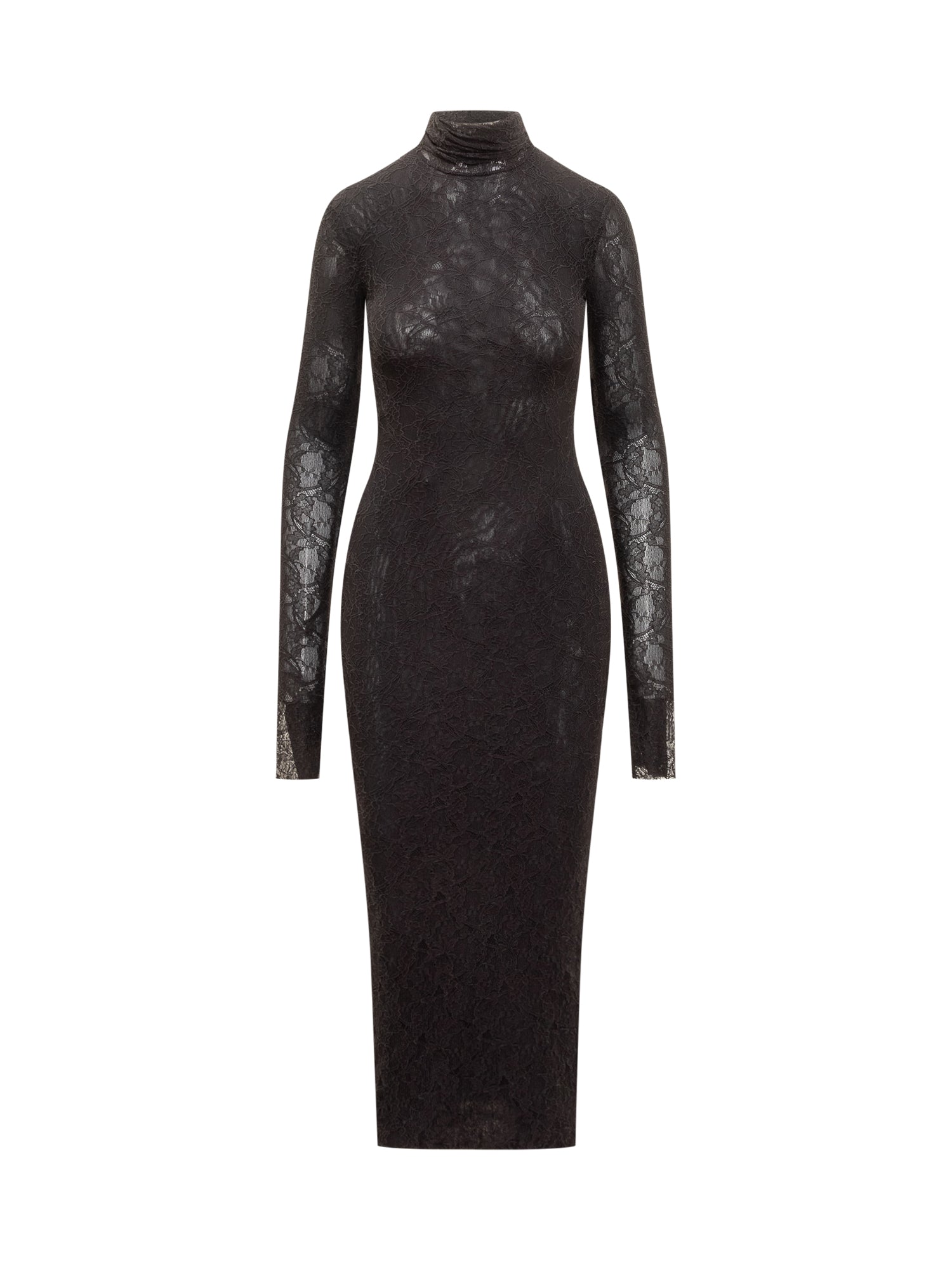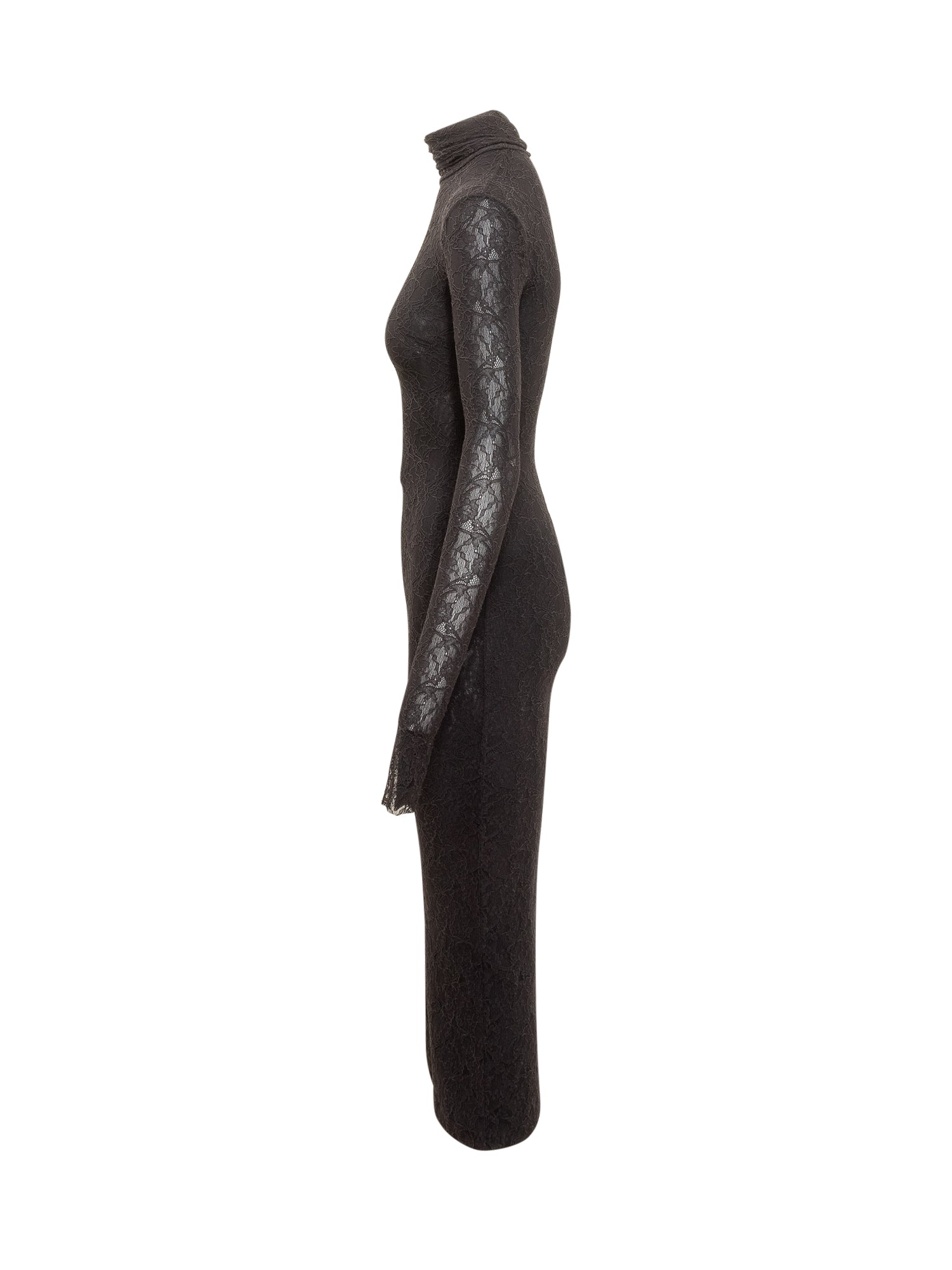 Black long dress. Stretch fit. High collar. Transparent effect. All-over lace floral pattern.