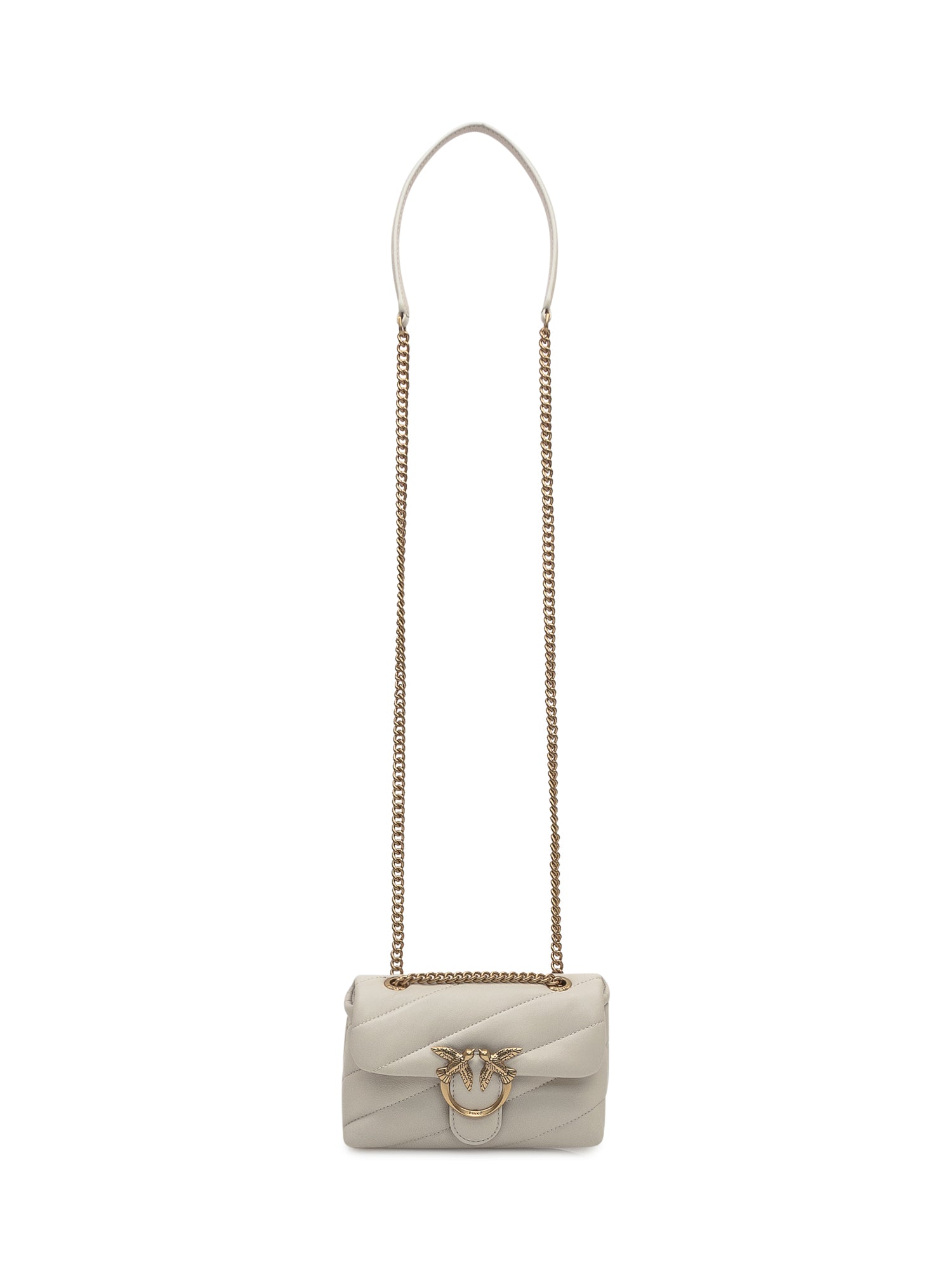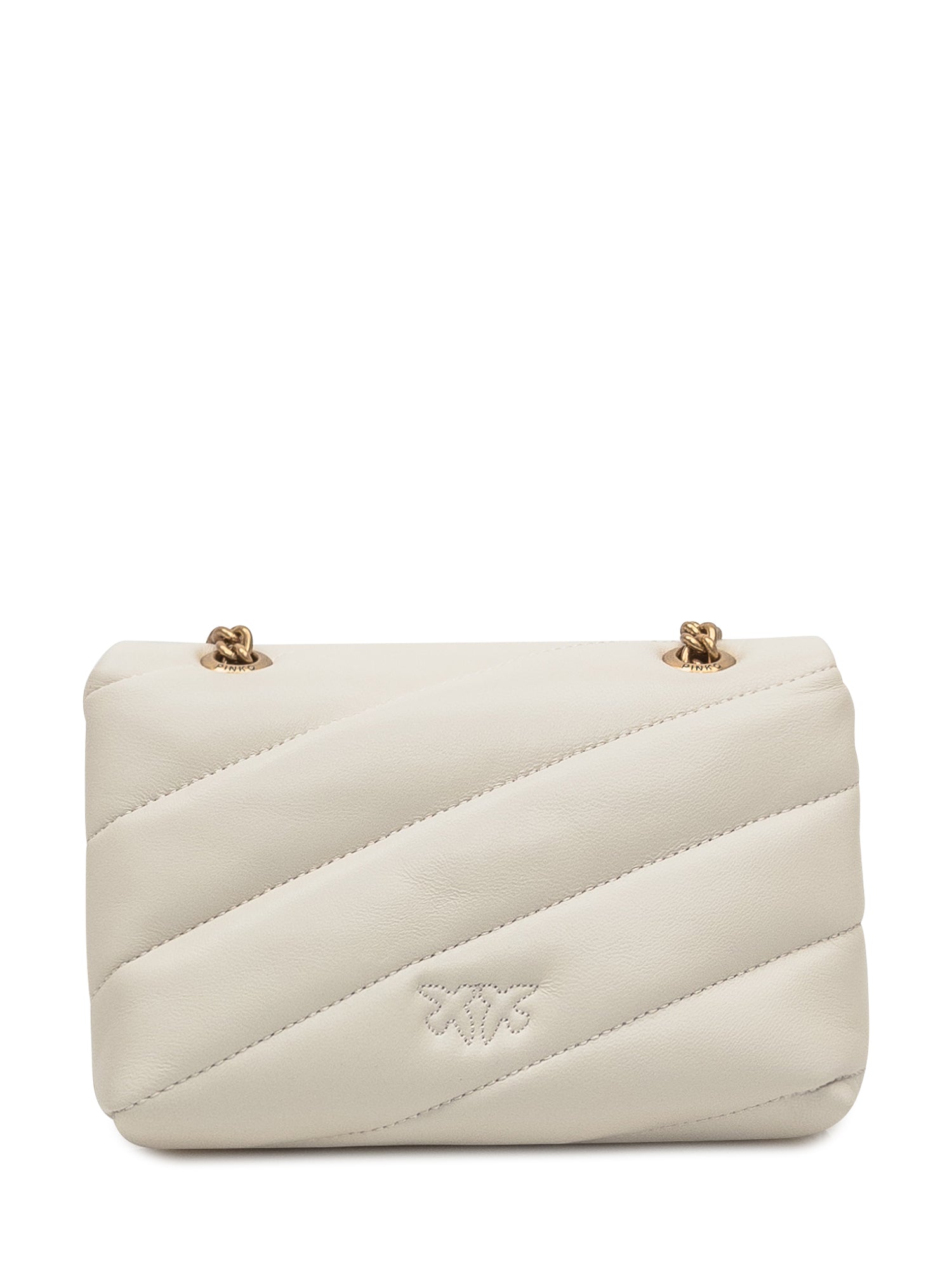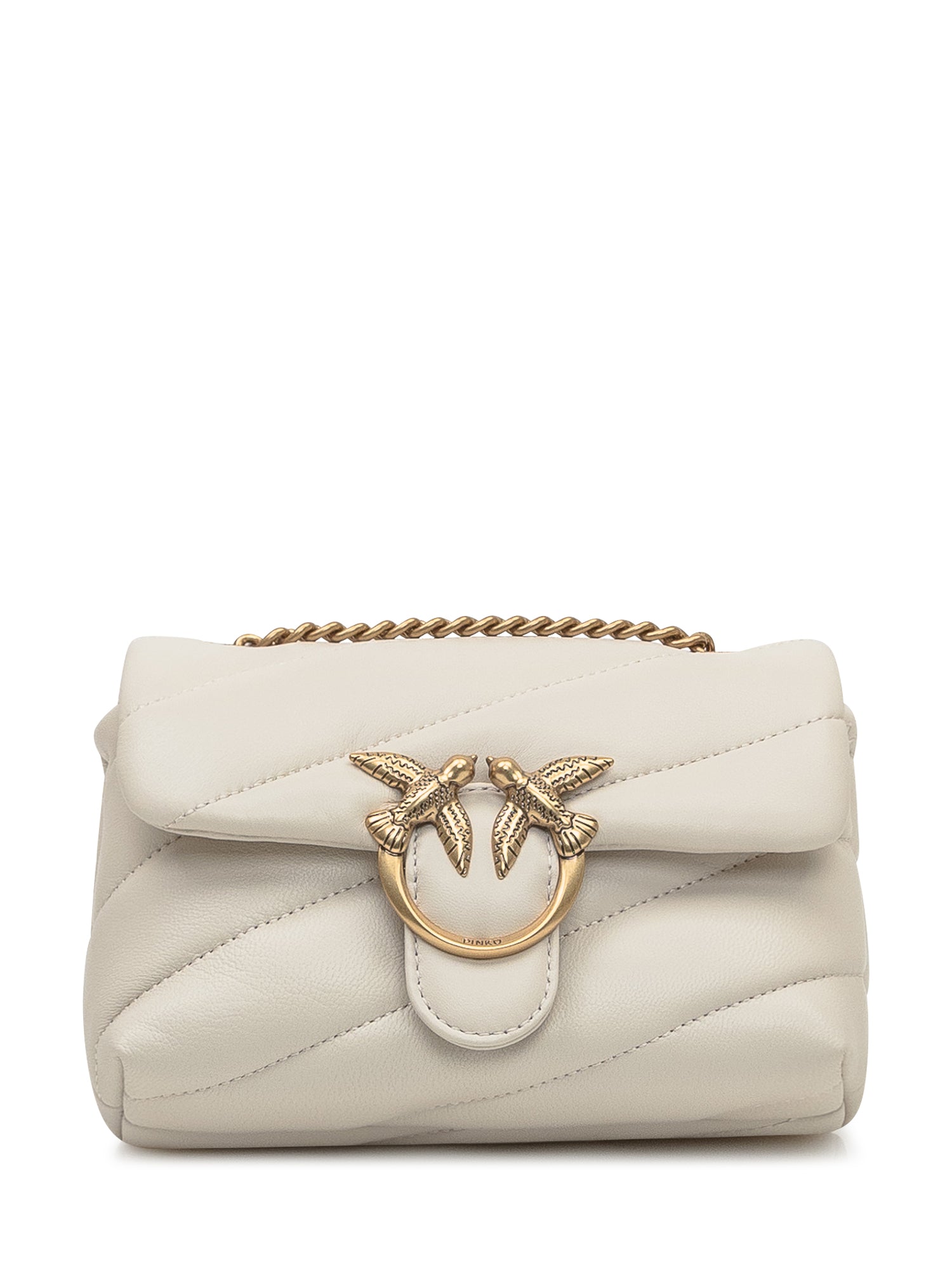 Elegant Pinko bag in ivory quilted leather with iconic Love Birds buckle and gold chain.