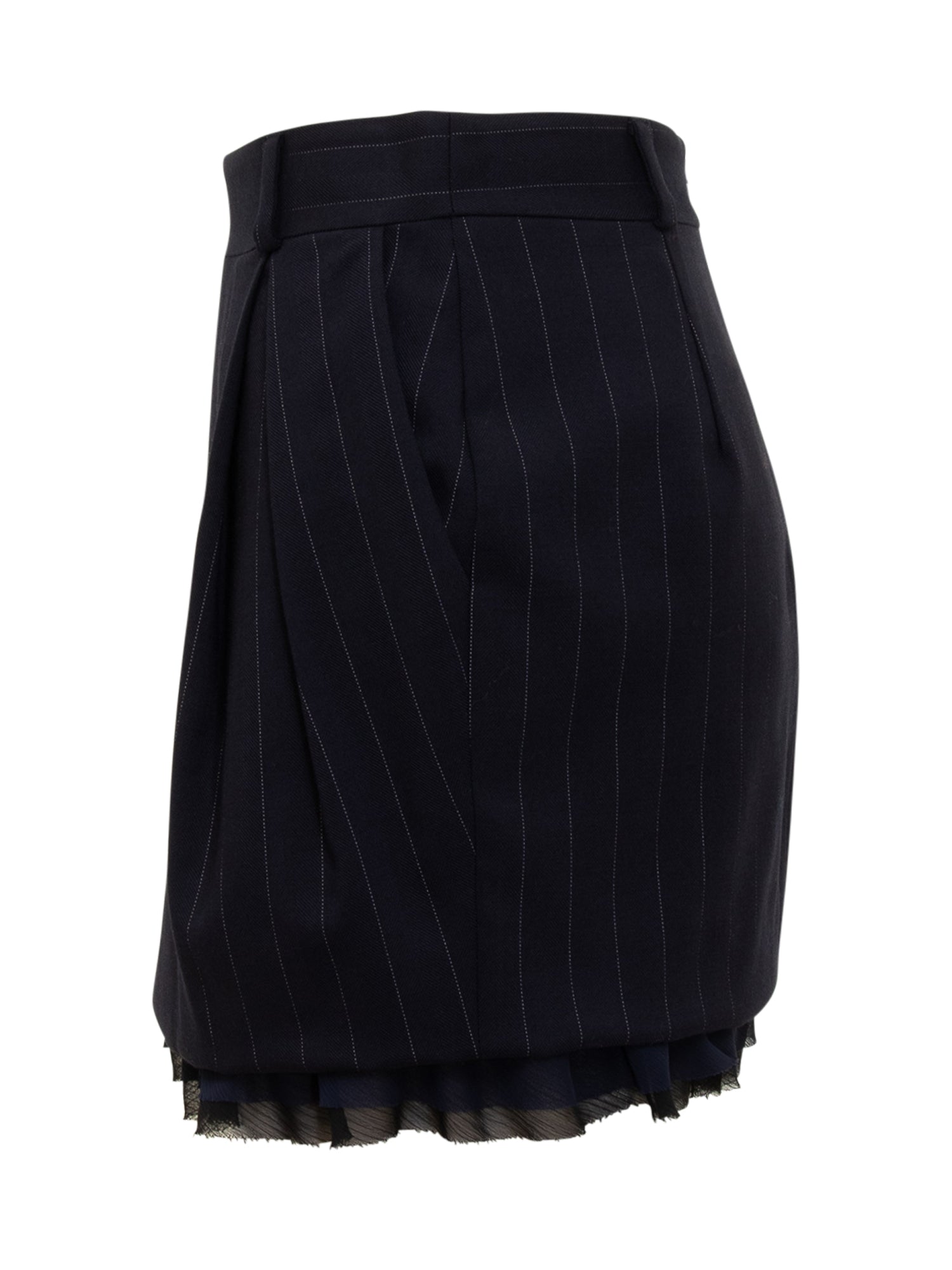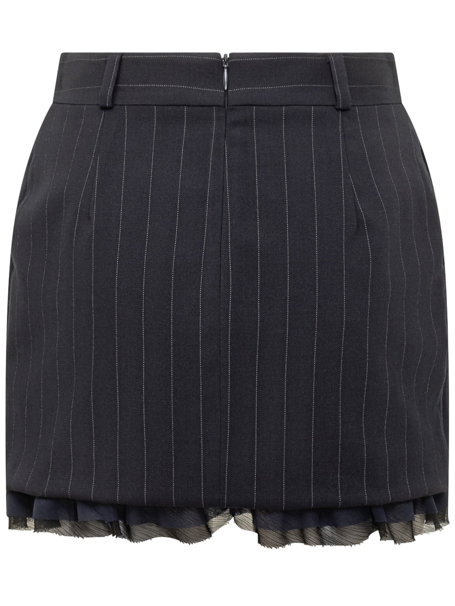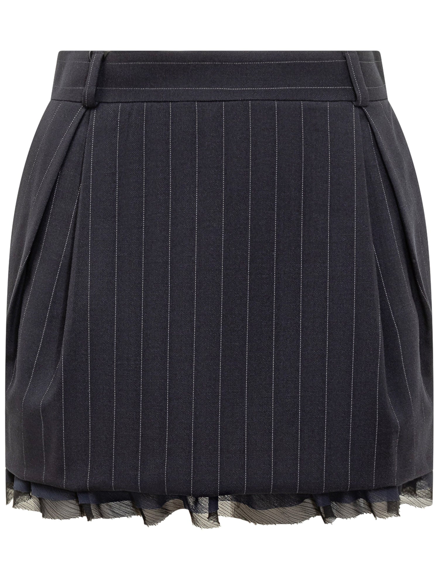Pinko pinstripe mini skirt featuring side pleats and a delicate tulle-trimmed hem. Regular waist with belt loops and tailored-inspired design.