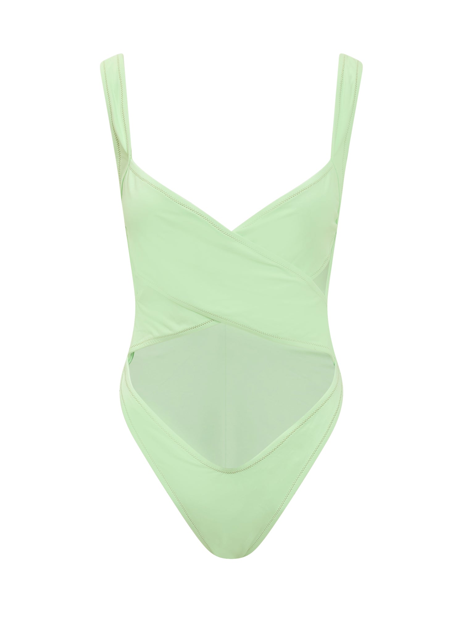 One-piece swimsuit with front neckline. Braided effect with cut-out.