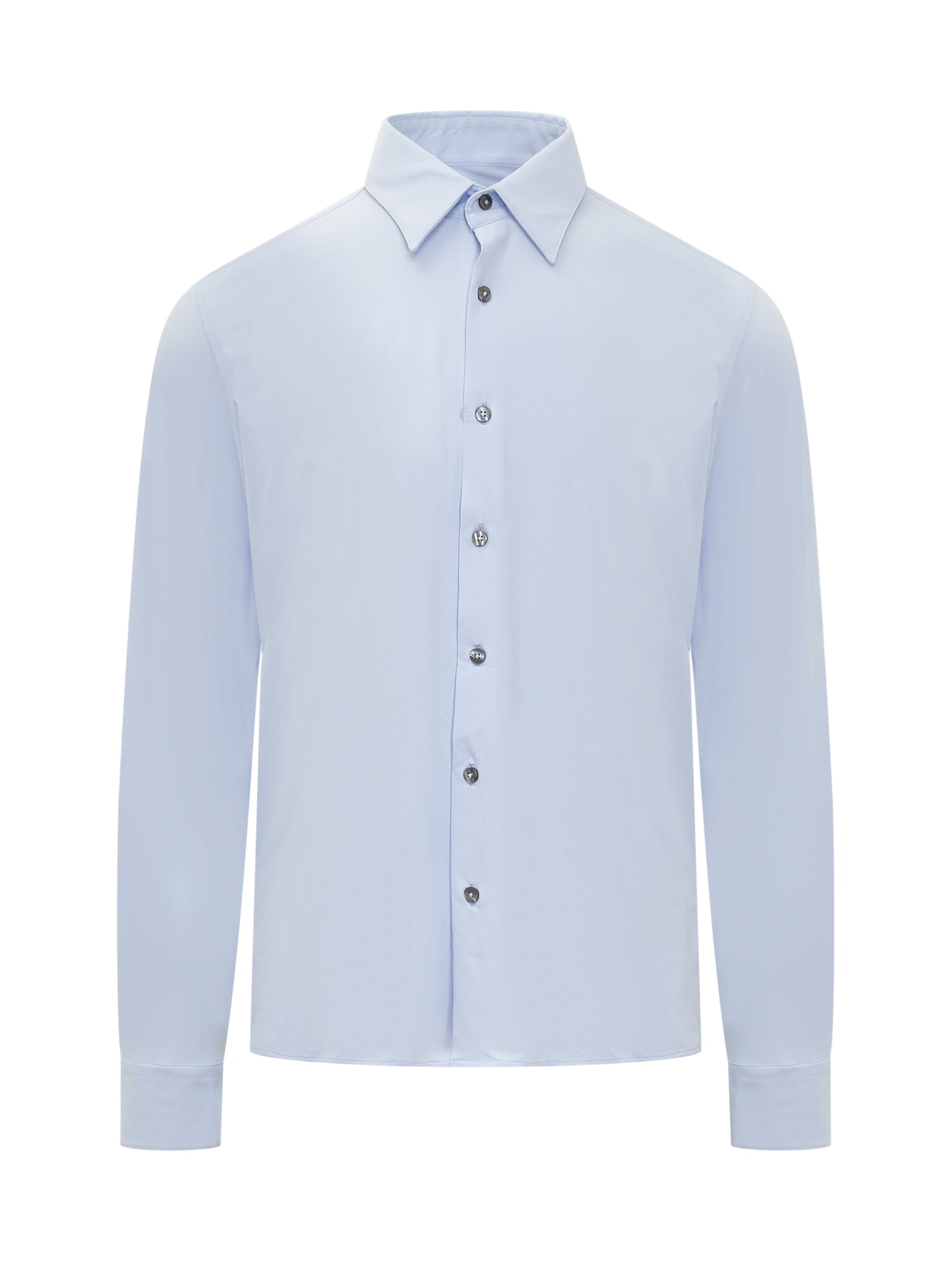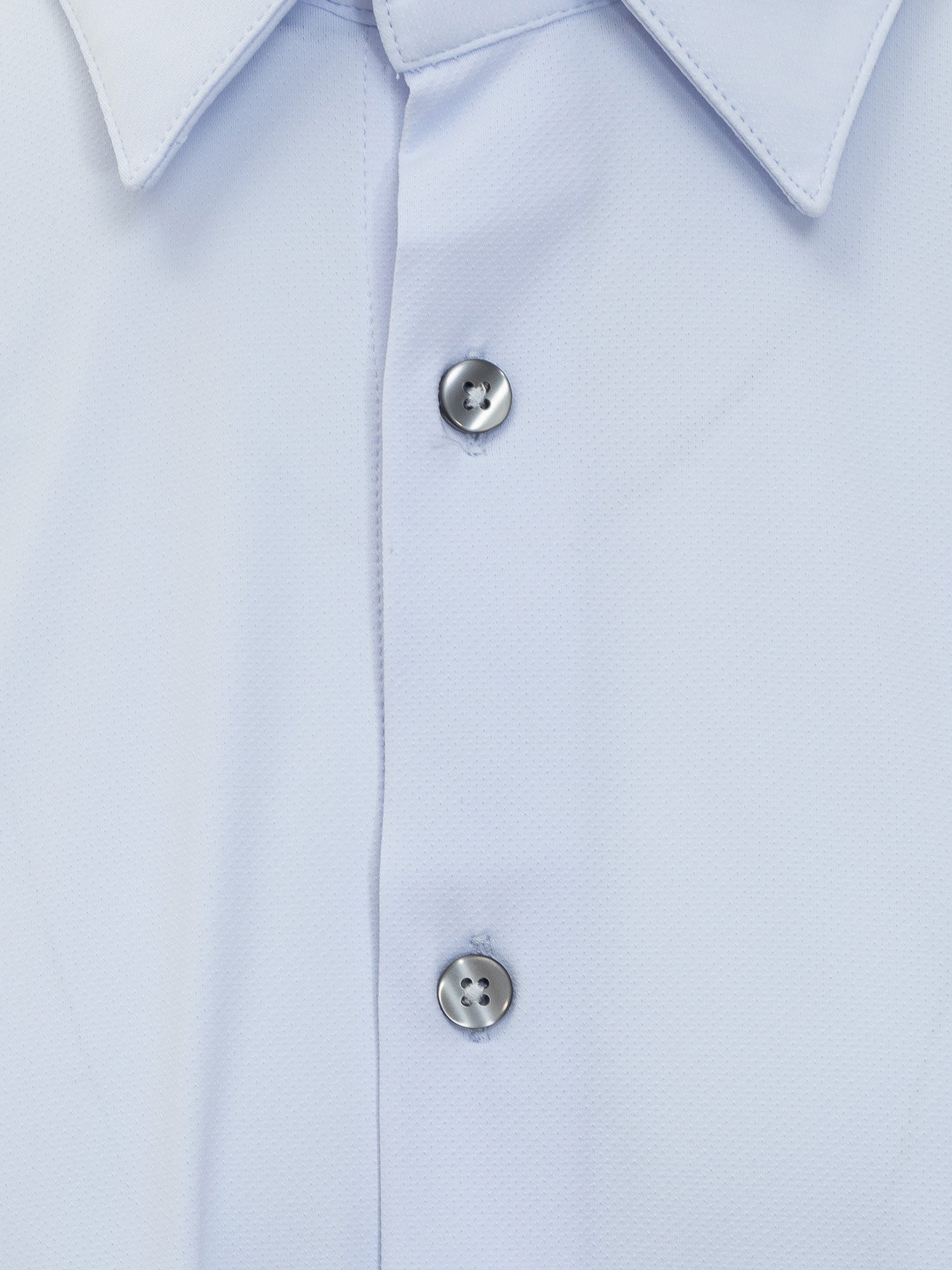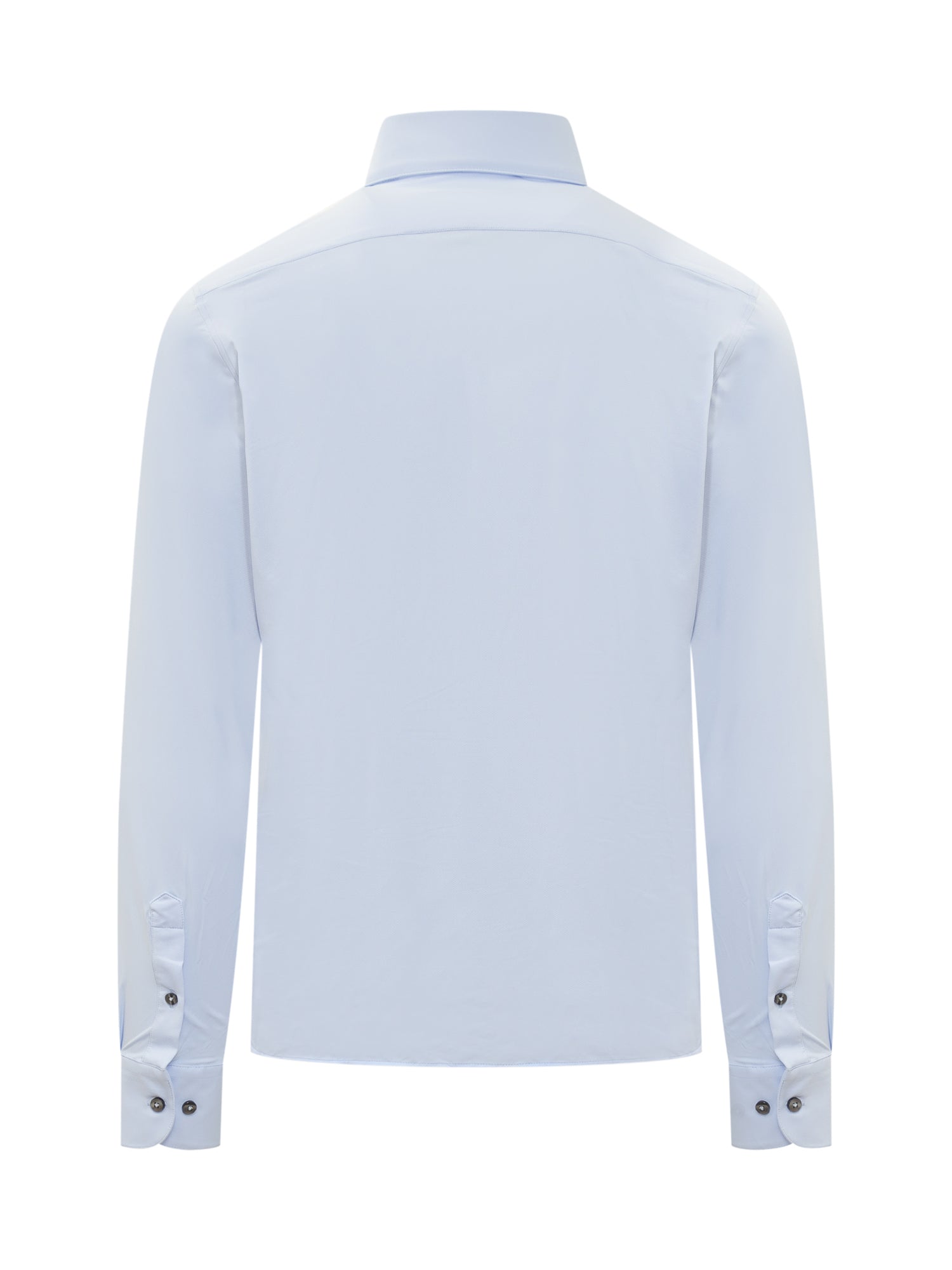 Blue shirt. Long sleeves. Pointed collar. Button closure. Buttons on cuffs.