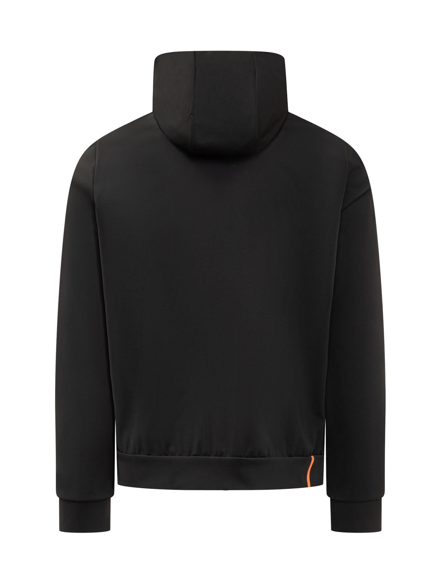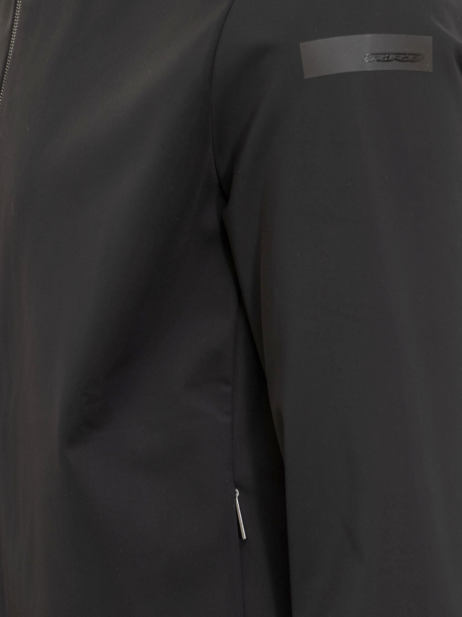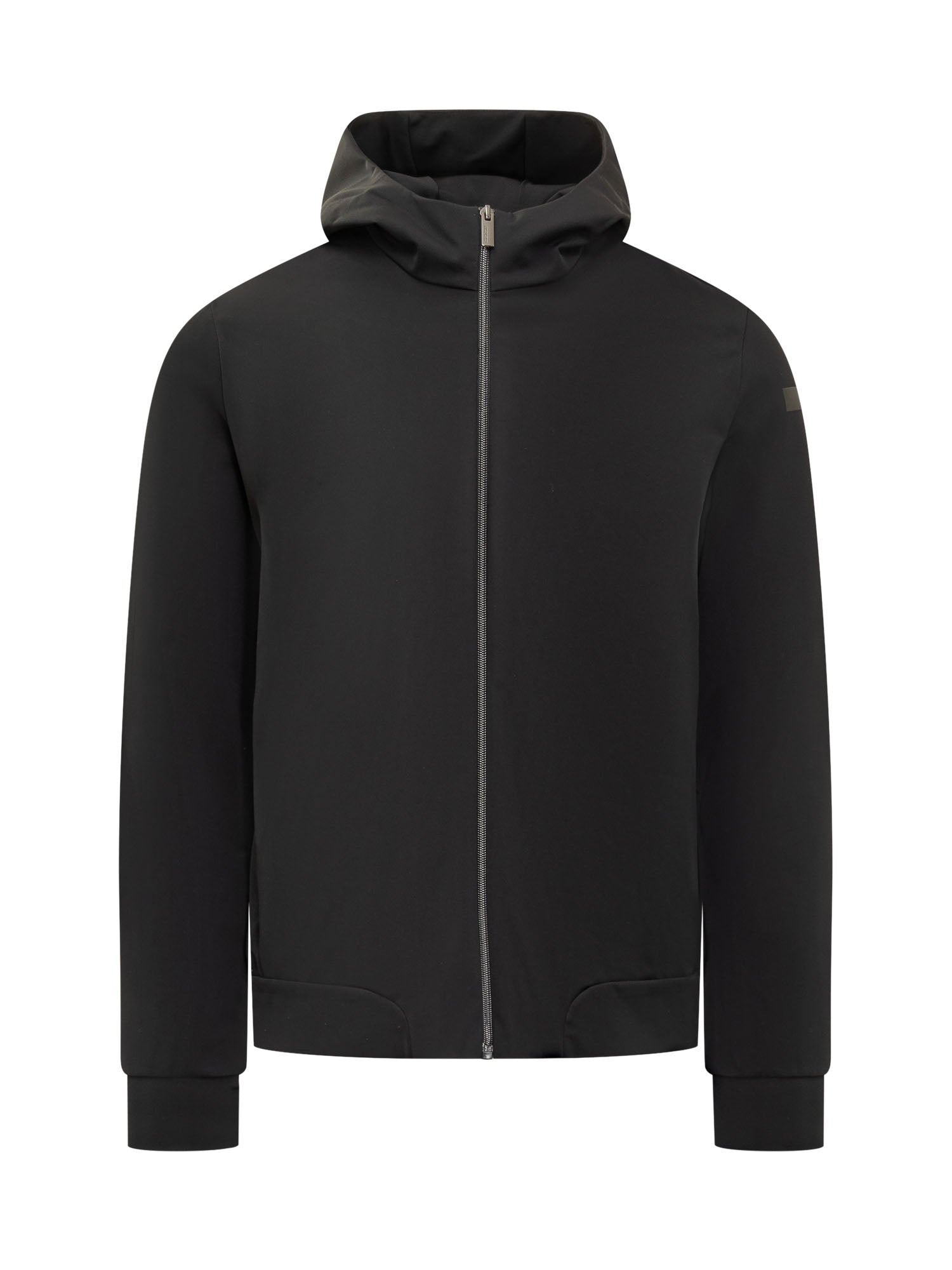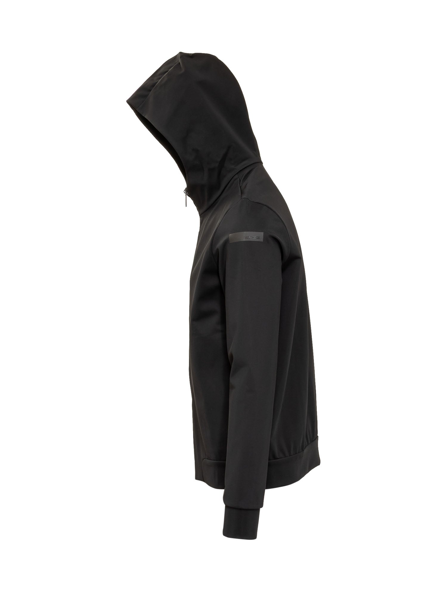 Short jacket with hood. Zipper closure. Zippered pockets at sides. Logo patch on sleeve. Black color.