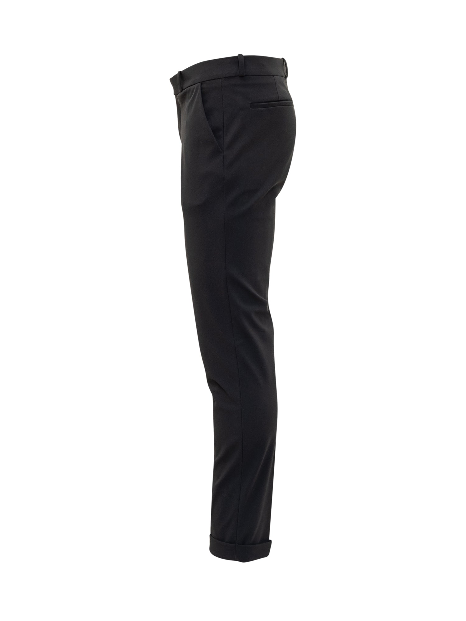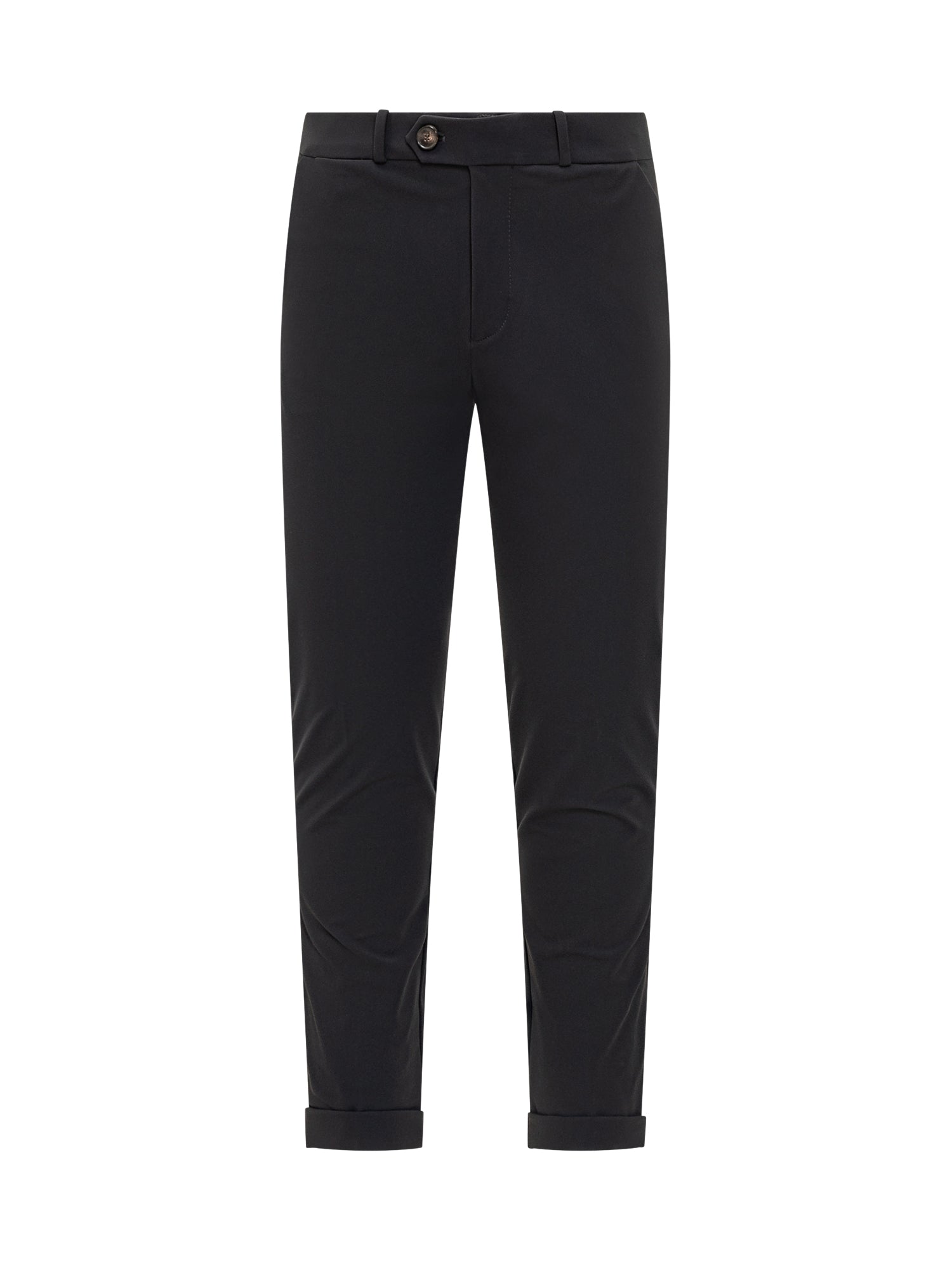 RRD black trousers in stretch technical fabric with front closure, belt loops, and cuffed hem.