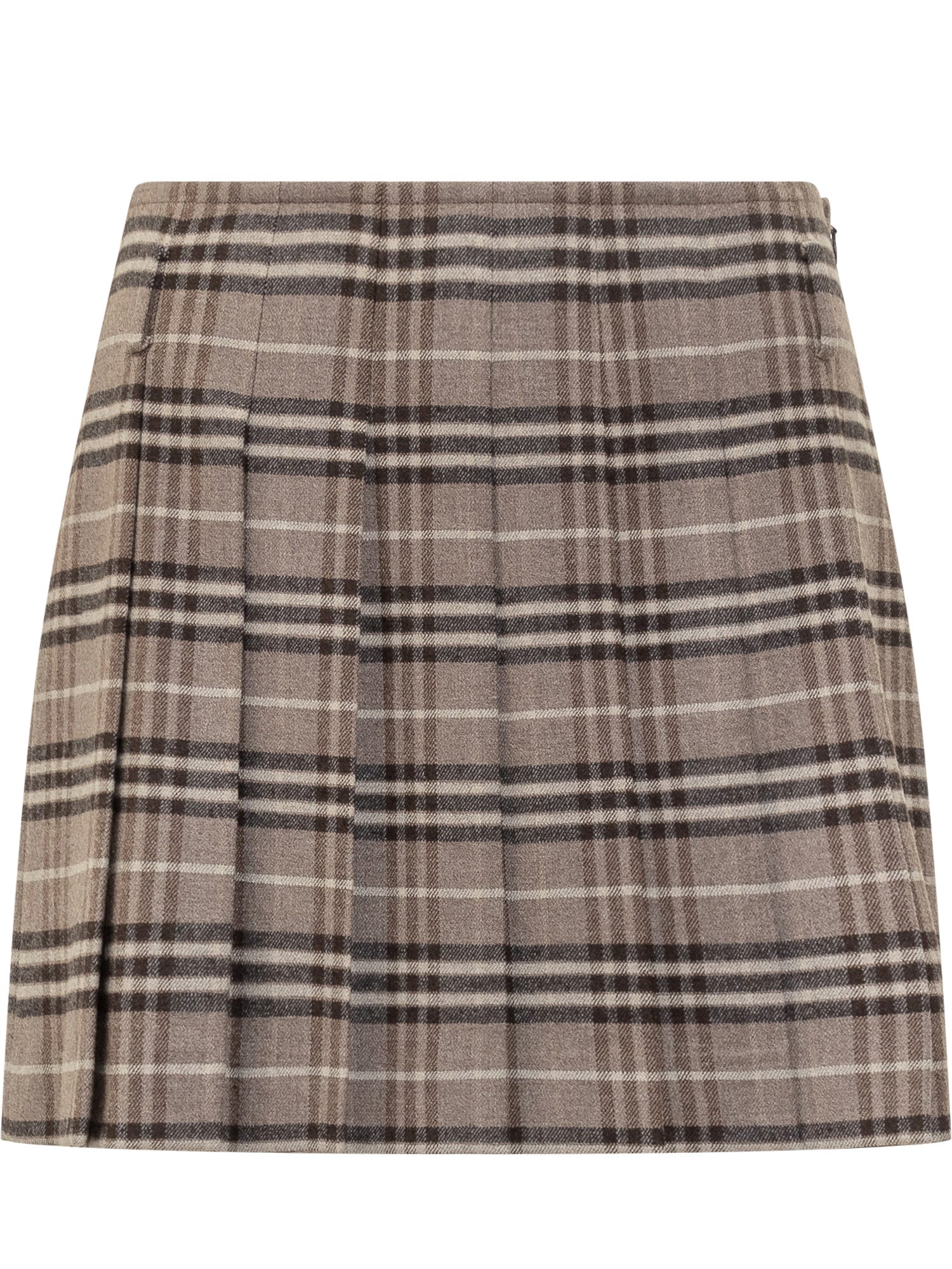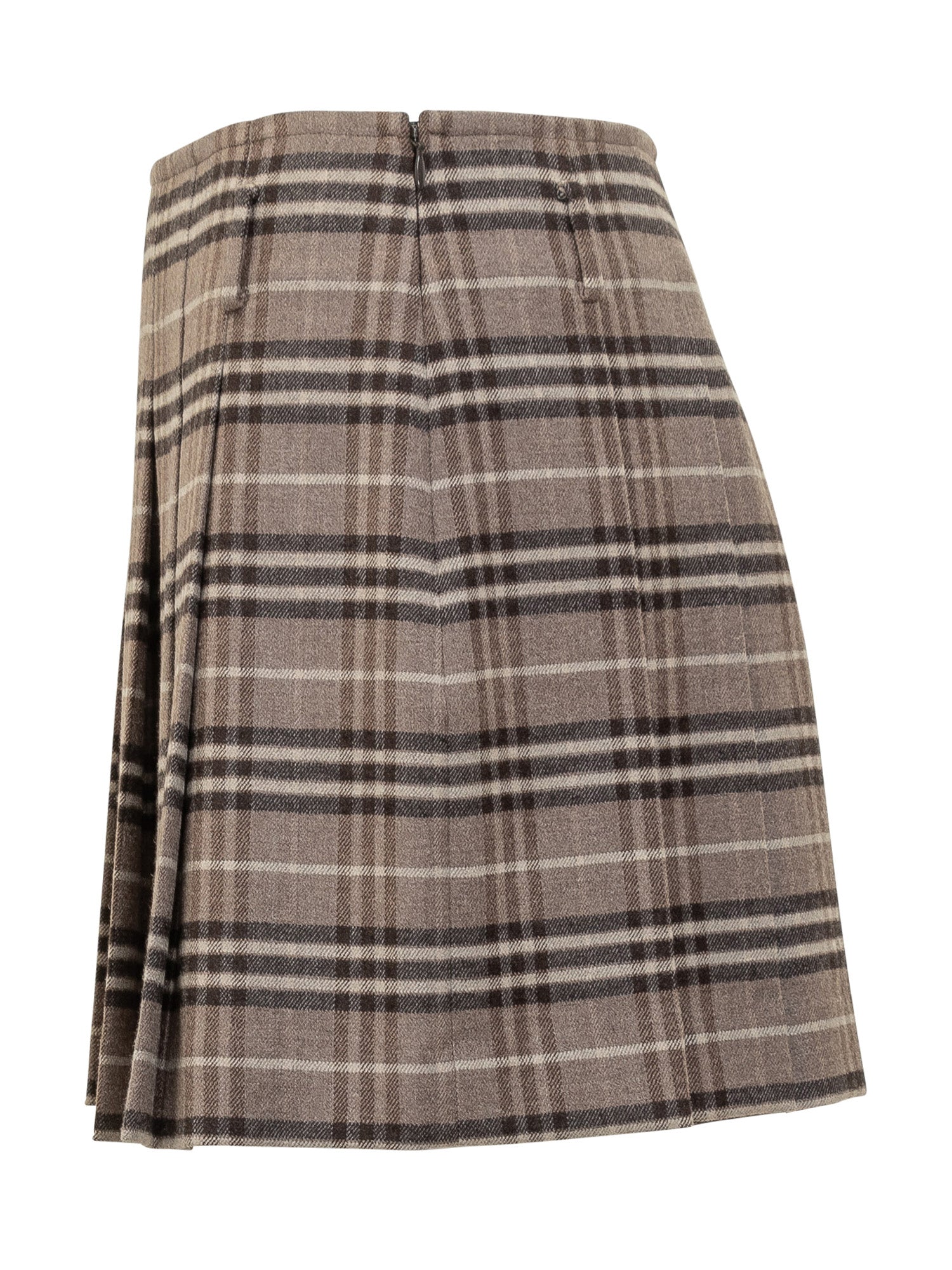 Seventy 19.70 wool mini skirt with beige and brown check pattern. Flared silhouette with pleats and side closure.