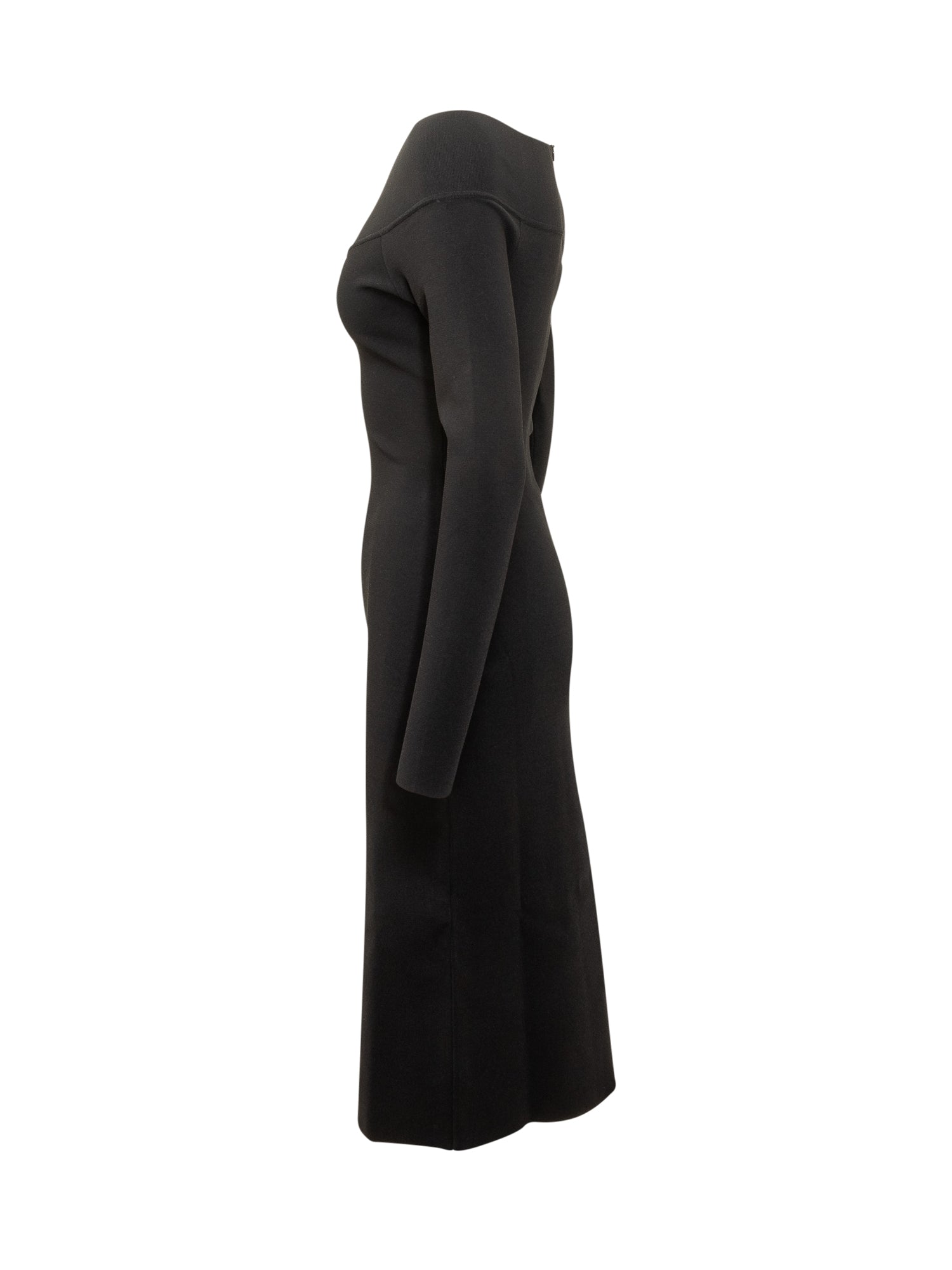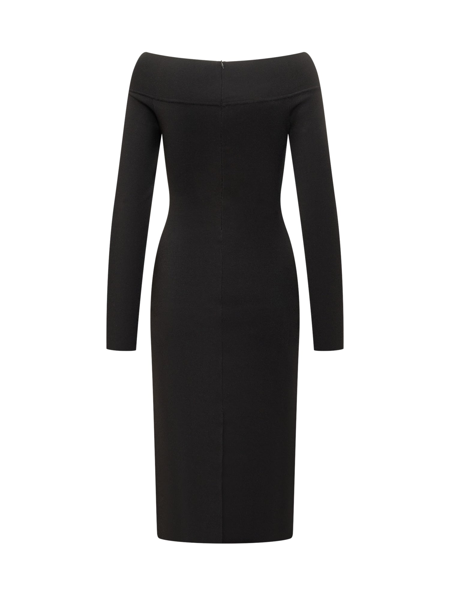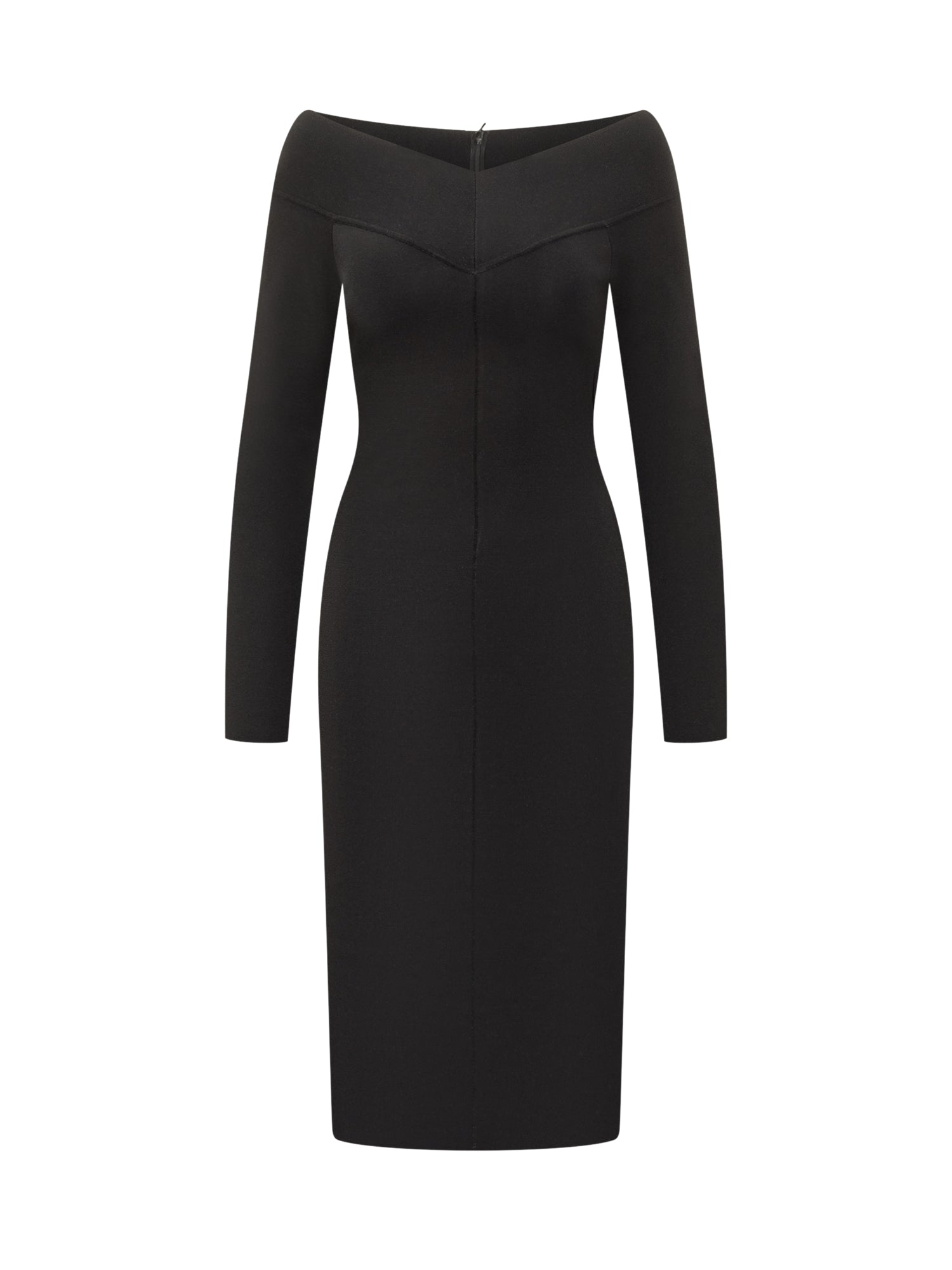 Midi off-shoulder dress with a fitted silhouette in stretch technical jersey. Long sleeves, inverted V neckline and invisible back closure.
