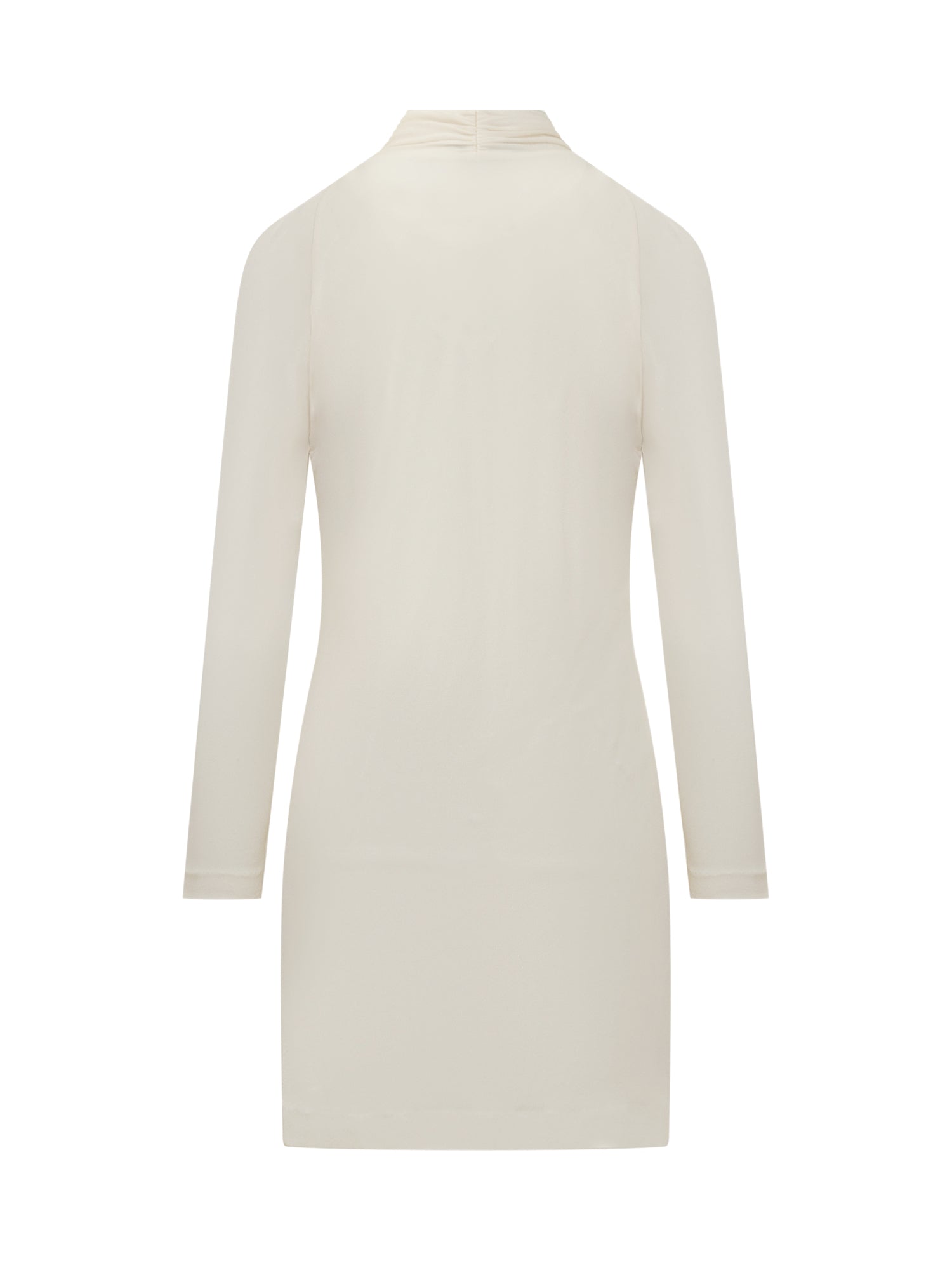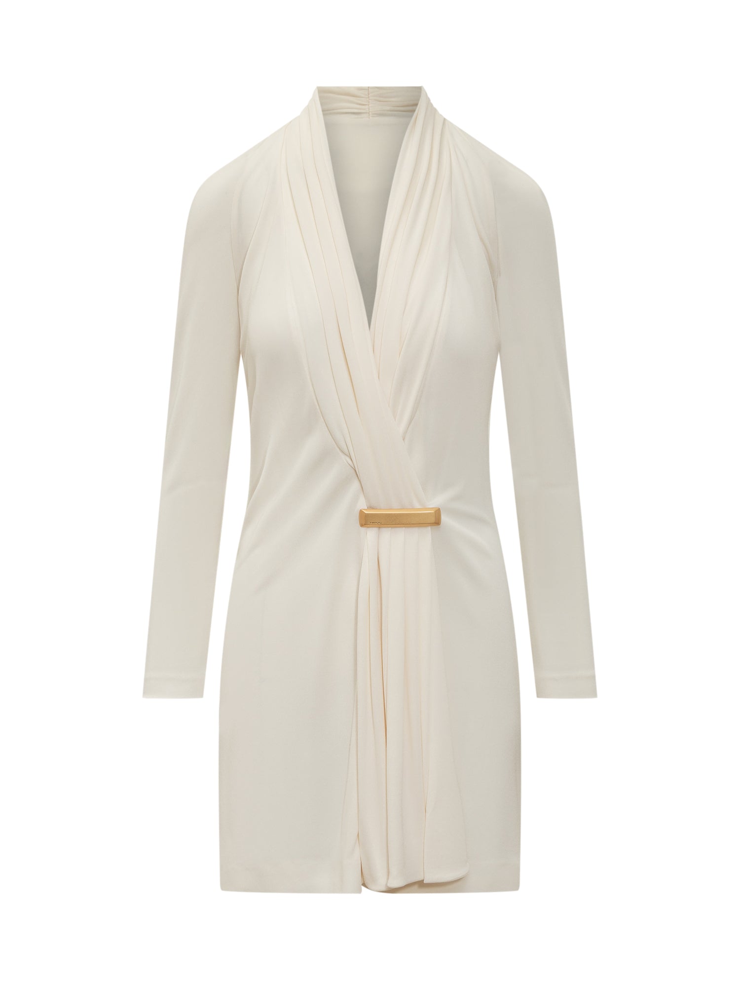 Short dress. V-neck. Long sleeves. Draped detail. Straight hem.