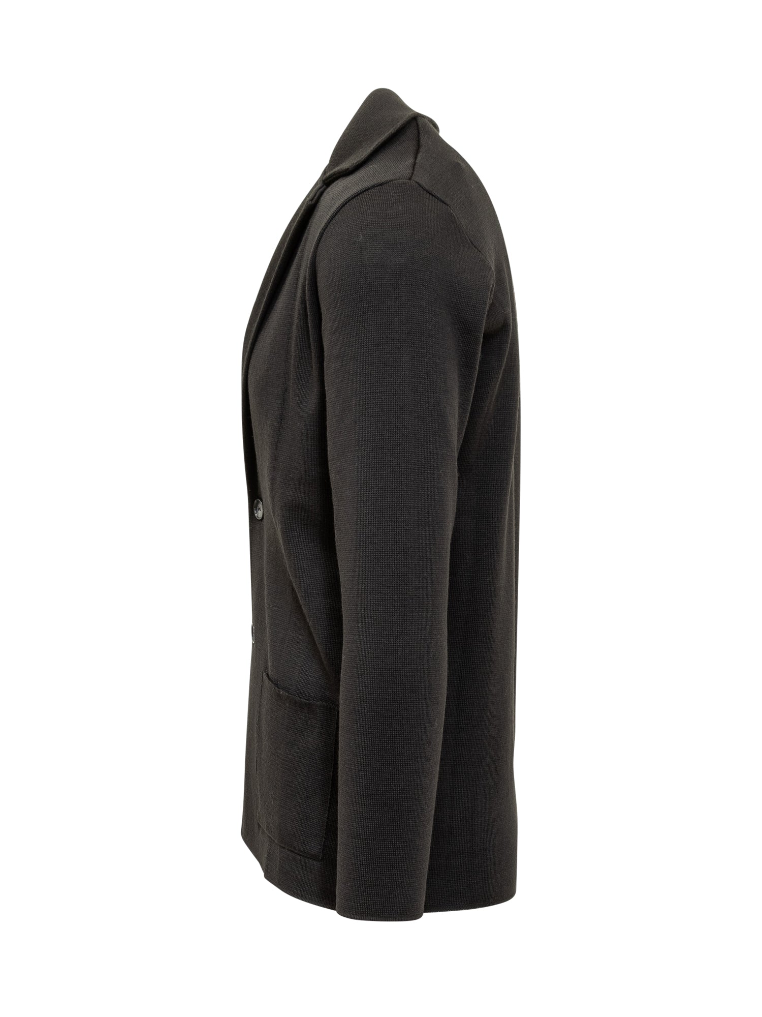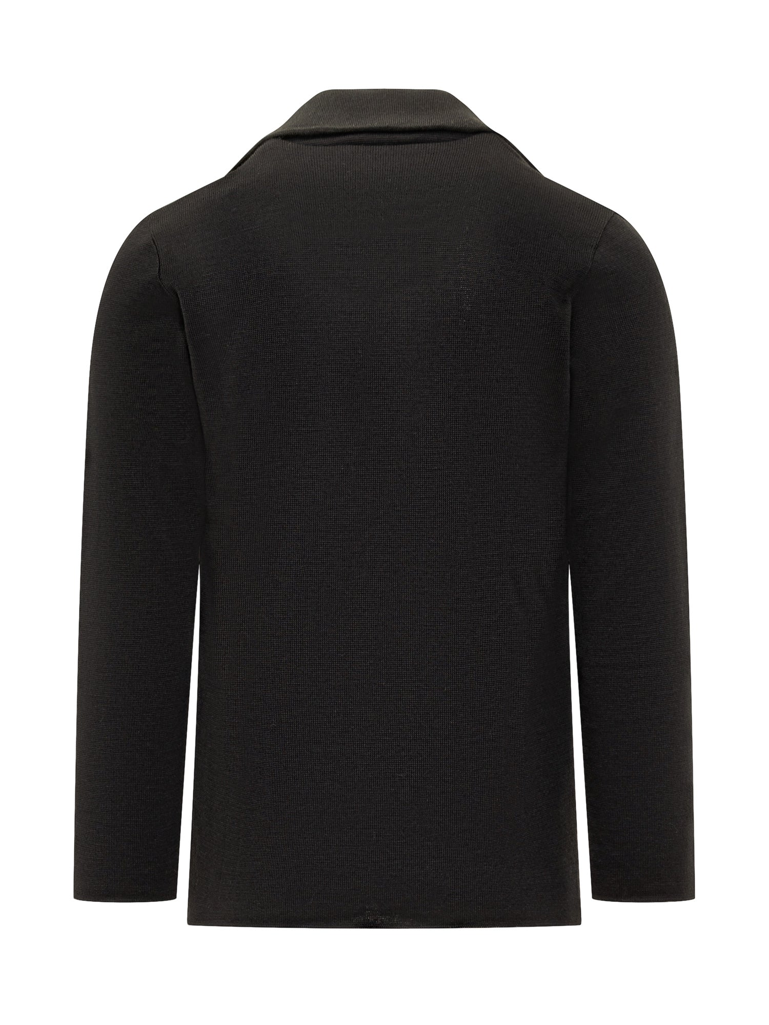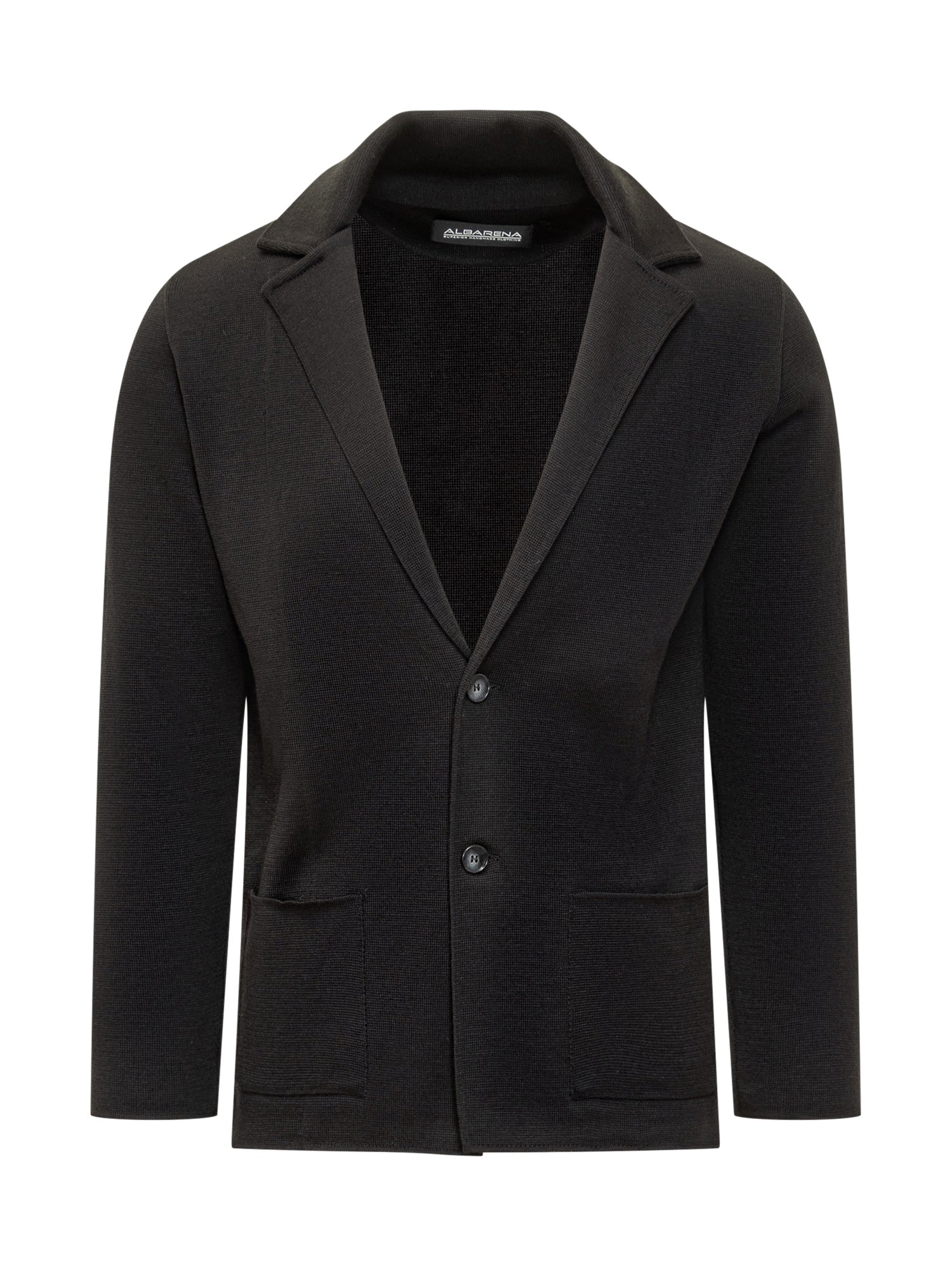 Albanera black knit jacket with two-button closure and patch pockets. Versatile and comfortable.
